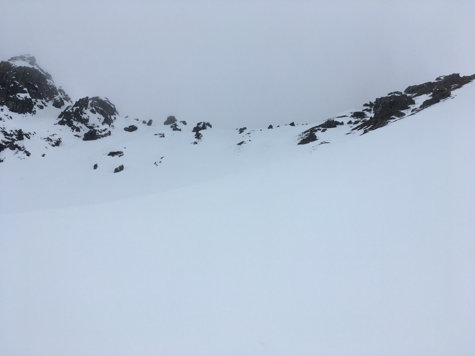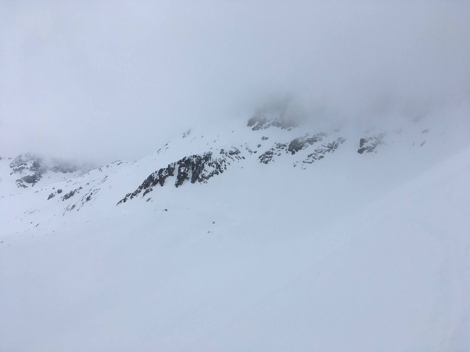 Die Abfahrt wäre ohne leider mittlerweile White-Out oben vielleicht noch passabel gewesen. Die Rinne bot am Nachmittag oben vor allem tiefen Schnee, nach unten wurde es besser. Insgesamt sind die Abfahrtsverhältnisse zur Zeit einfach nicht gut - immerhin nur 2x Steinkontakt und wie geschrieben meistens ausreichend Schnee.