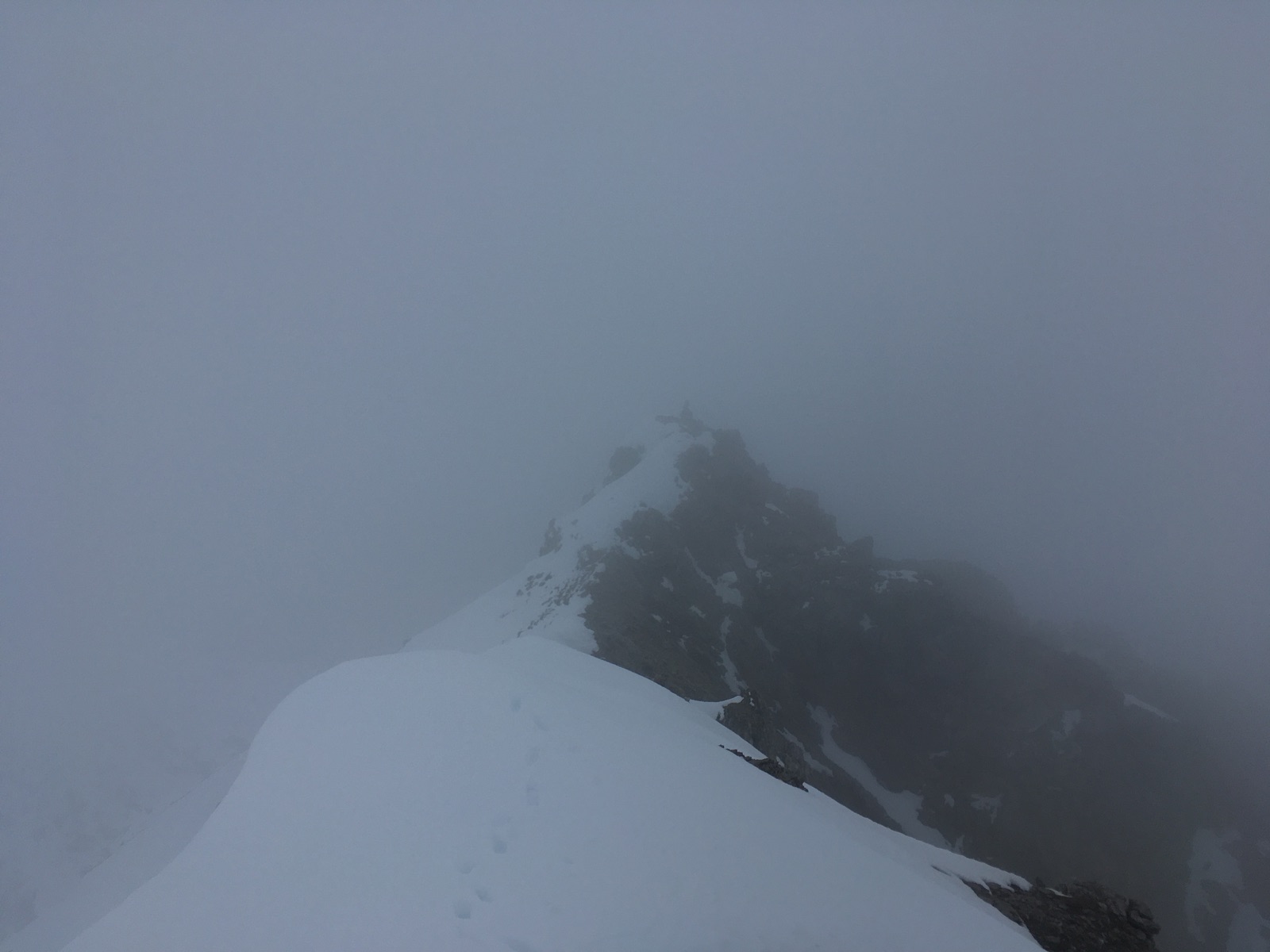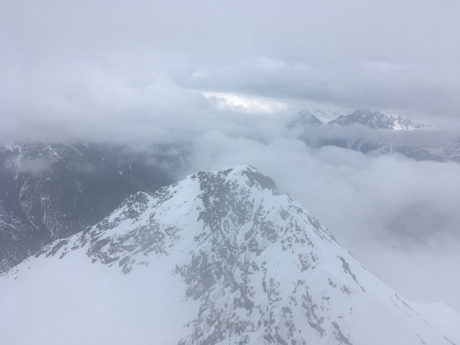 Schlecht waren die Verhältnisse allerdings am südseitigen Gipfelhang: Unter dem meistens tragenden Deckel gab es eine immer mal wieder kollabierende Schicht - vor allem in der Abfahrt unangenehm. Zum Gipfel des Mittleren Kreuzjoch (mit großem Steinmann) muss man am Schluss ca. 30 Hm im bröseligen Gelände kraxeln. Ich bin im dichten Nebel noch zu den beiden höheren Punkten im Kammverlauf nach Norden gestapft (mit einer Kraxelstelle) - offenbar ist das das Nördliche Kreuzjoch.