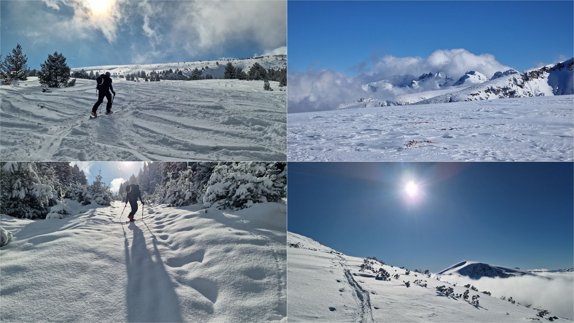 - Die ersten paar Tage waren wir in der Nähe von Bansko einquartiert, am Nordrand des Pirin-Gebirges. Dort hatten wir schlechtes Wetter (Schneefall, stürmischen Wind in höheren Lagen, schlechte Sicht), dafür wurde die Schneequalität immer besser.