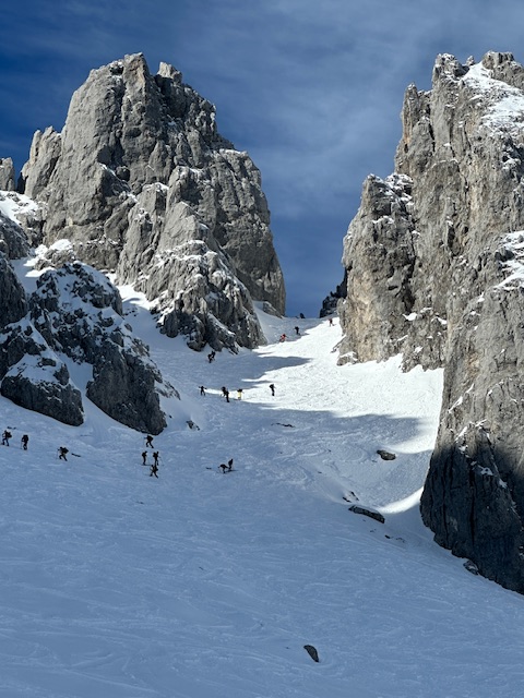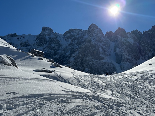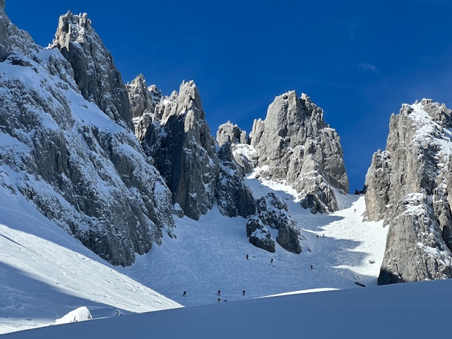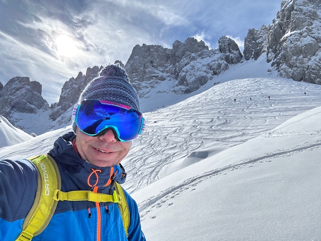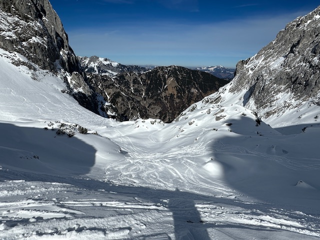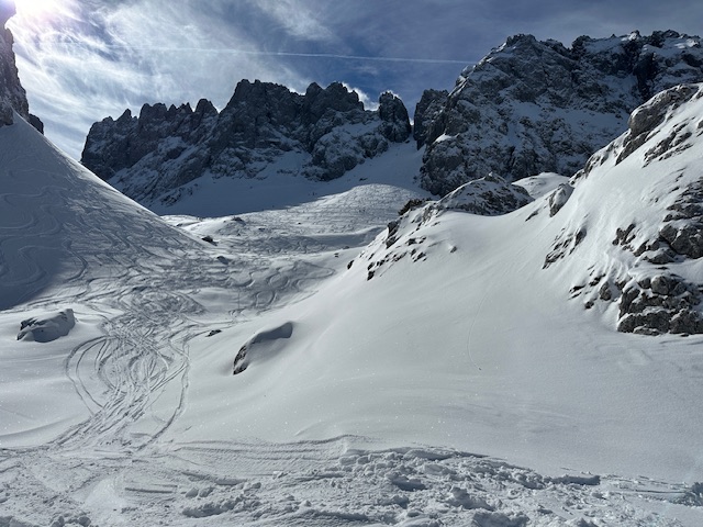 Unterhalb vom Kanonenrohr ist der Schnee zu einer Naturpiste zusammengefahren und nicht immer griffig. Ab ca. 1400 m super frischer Pulverschnee, oben bis zu 40 cm, herrlich zu fahren. Ich habe diesmal den Schlenker über die Fritz-Pflaum-Hütte gemacht und quasi hintenherum zur Goinger Scharte, wo viel Betrieb war; trotzdem war noch Platz für Schwünge in unverspurtem Schnee. Auch Schönewetterfensterl, kleines Törl und alle anderen Scharten wurden heute gemacht.
