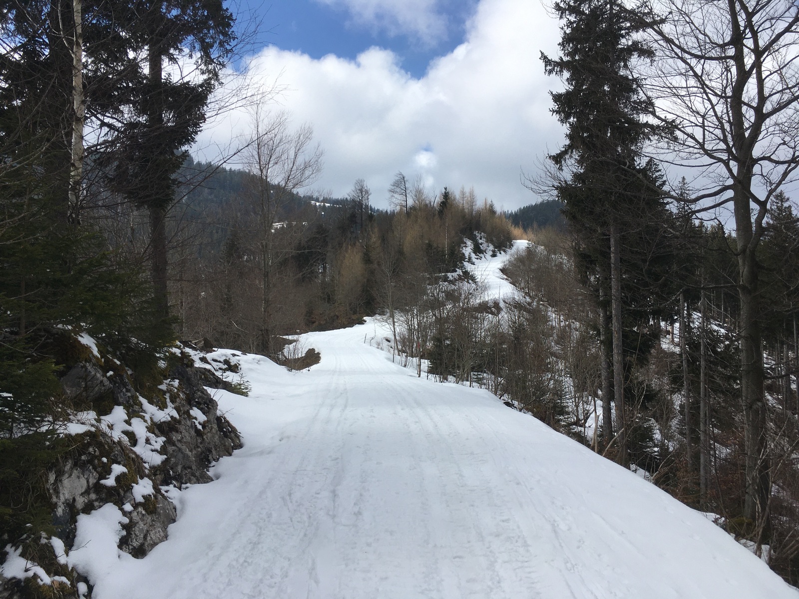 Bilder: Beim Aufstieg auf der Forststraße neben der Piste - schattseitig noch ausreichend, sonnseitig mit ersten Lücken: