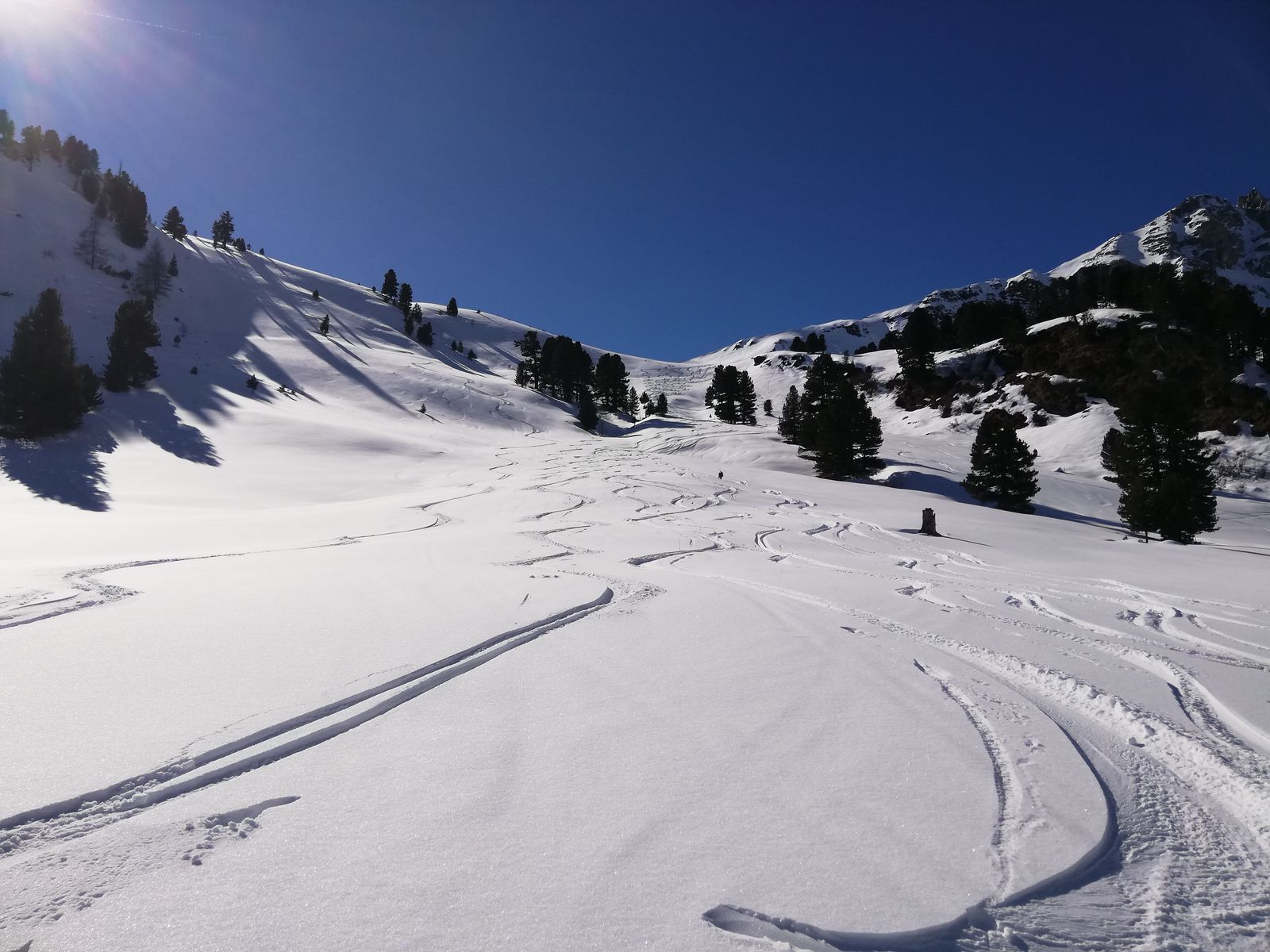 Abfahrt wie Aufstieg. In dieser Exposition (N bis NO) immer noch pulverig bis zur Alm runter, auf der Straße dann firnig.