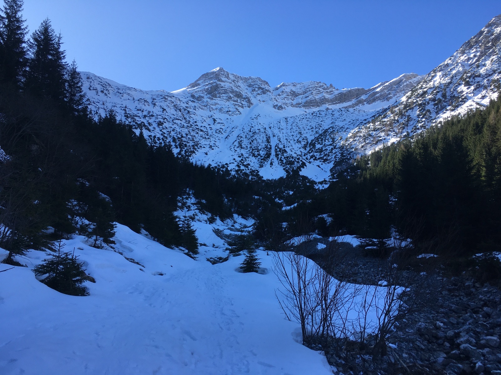 Kurz nach dem Start in Bichlbächle sieht man schon die heuer bescheidene Schneelage im Kärle: