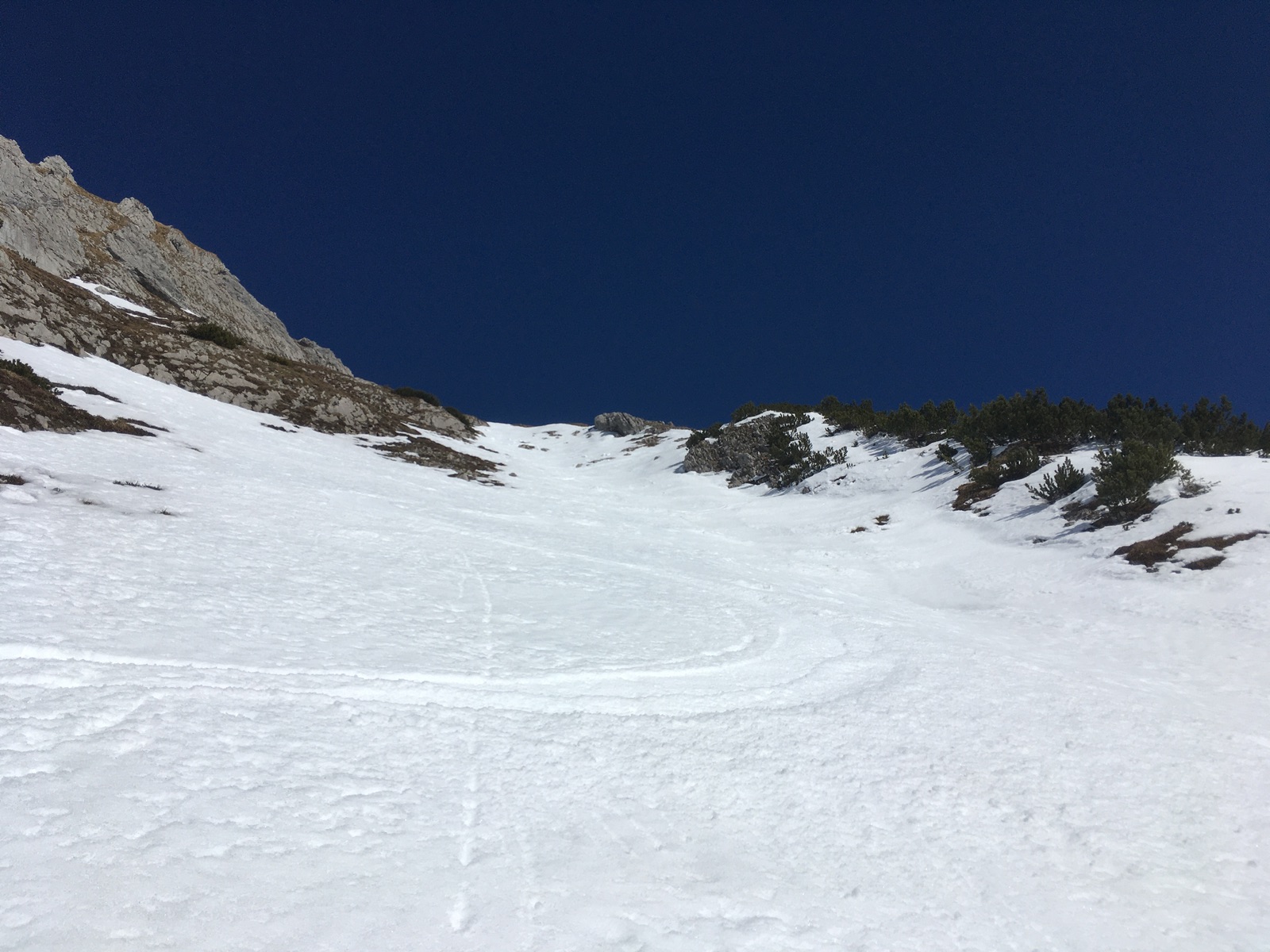 Die Abfahrt um 13:30 Uhr bot dann recht guten Firn - ca. 1 h früher wäre vermutlich ideal gewesen. Ich bin länger gequert und habe so den eigentlich geplanten Abfahrtshang verpasst (der erste Hang, wo man herunter bis zu den Latschen sieht) - ging auch, aber so habe ich halt einige schöne Abfahrtsmeter hergeschenkt und musste auch mehrere Rippen (mit Steinen) queren. Der freigeschnittene Weg durch die Latschen auf etwas unter 2.000 m ist zur Zeit noch schneebedeckt und kann gut abgefahren werden. Man kommt dann beim Almhütterl unter dem Joch heraus und muss ein paar Meter zu diesem hinaufhaxeln (anfellen nicht nötig).