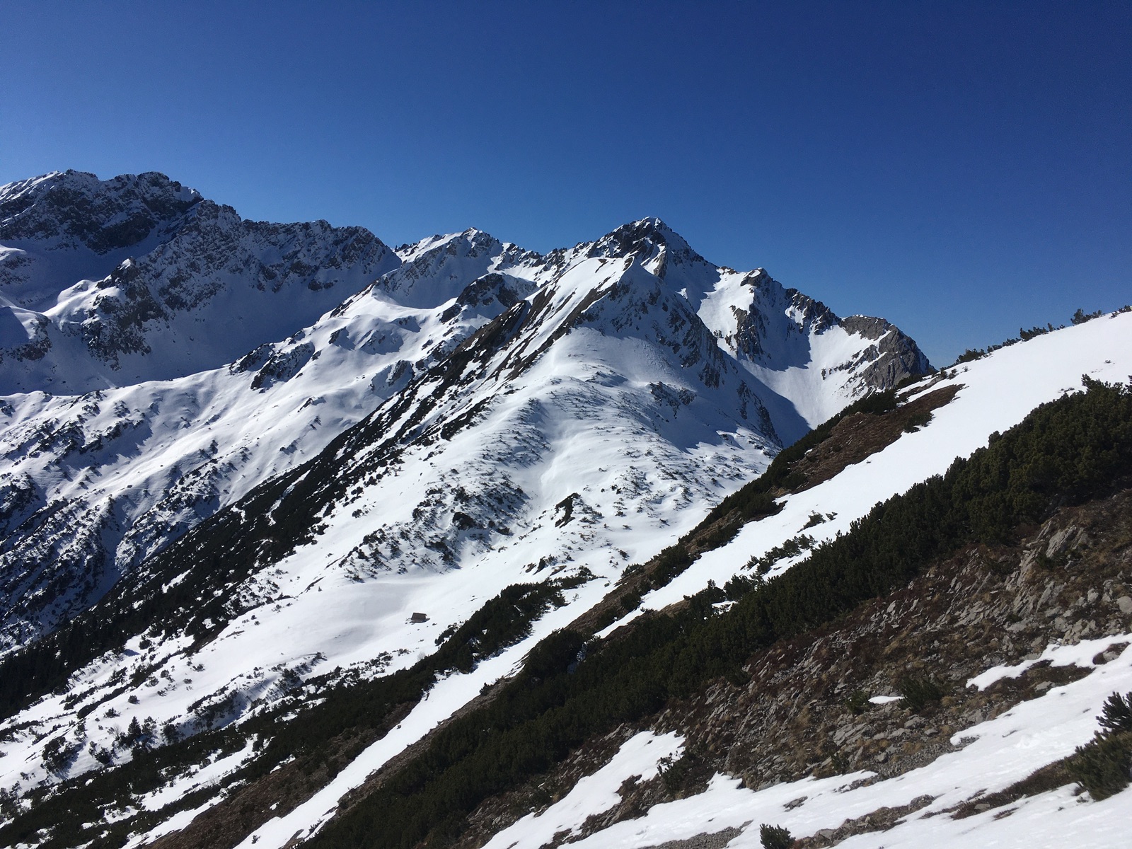 Start in der kleinen Parkbucht unterhalb Bichlbächle - man kann vermutlich auch auf der Fernpassseite starten (wenn es die Schneelage südseitig hergeben sollte - längere Passagen durch die Latschen). Der erste Teil der Tour ist identisch zum normalen Skitourenaufstieg auf den Roten Stein (auf den ersten Metern schon schneearm und kurz unterbrochen). Im Kärle hat es aufgrund der schlechten Schneelage heuer viele offene Latschen - dementsprechend eingeschränkt sind die Aufstiegs- und Abfahrtsmöglichkeiten. Am Vormittag in dem schattigen Kar relativ harter Schnee. Auf gut 1.600 m (ginge vielleicht auch noch etwas höher) verließ ich die Aufstiegsspur und stieg zum Bichlbächler Jöchle an. Um es gleich so deutlich zu sagen: Derzeit eine einzige Plackerei - etwas Pulver auf einem harten Deckel versprach munteres Rutschen auch mit Harscheisen, v.a. aber wechselt die Schneebeschaffenheit von extrem hart bis weich bis durchbrechen alle paar Meter. Zu Fuß ginge es daher auch nicht. Und zuletzt ging mir noch das Fell ab, so dass ich ohne in die Scharte musste. In der Abfahrt war der Hang dann natürlich eine entsprechende "Freude". Ich bin dann in der Abfahrt zu den besonnten Hangpartien gequert, aber das ist aus nicht so toll. Ich schätze mal, wenn dieser Hang zum Bichlbächler Jöchle nicht wäre, dann wäre es eine beliebte Skitour ...
