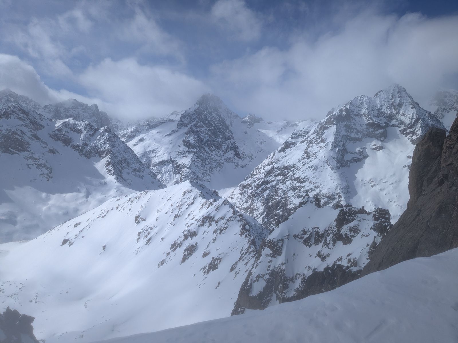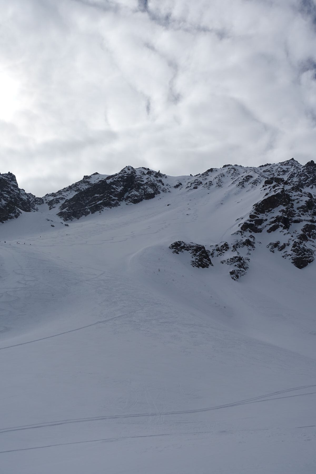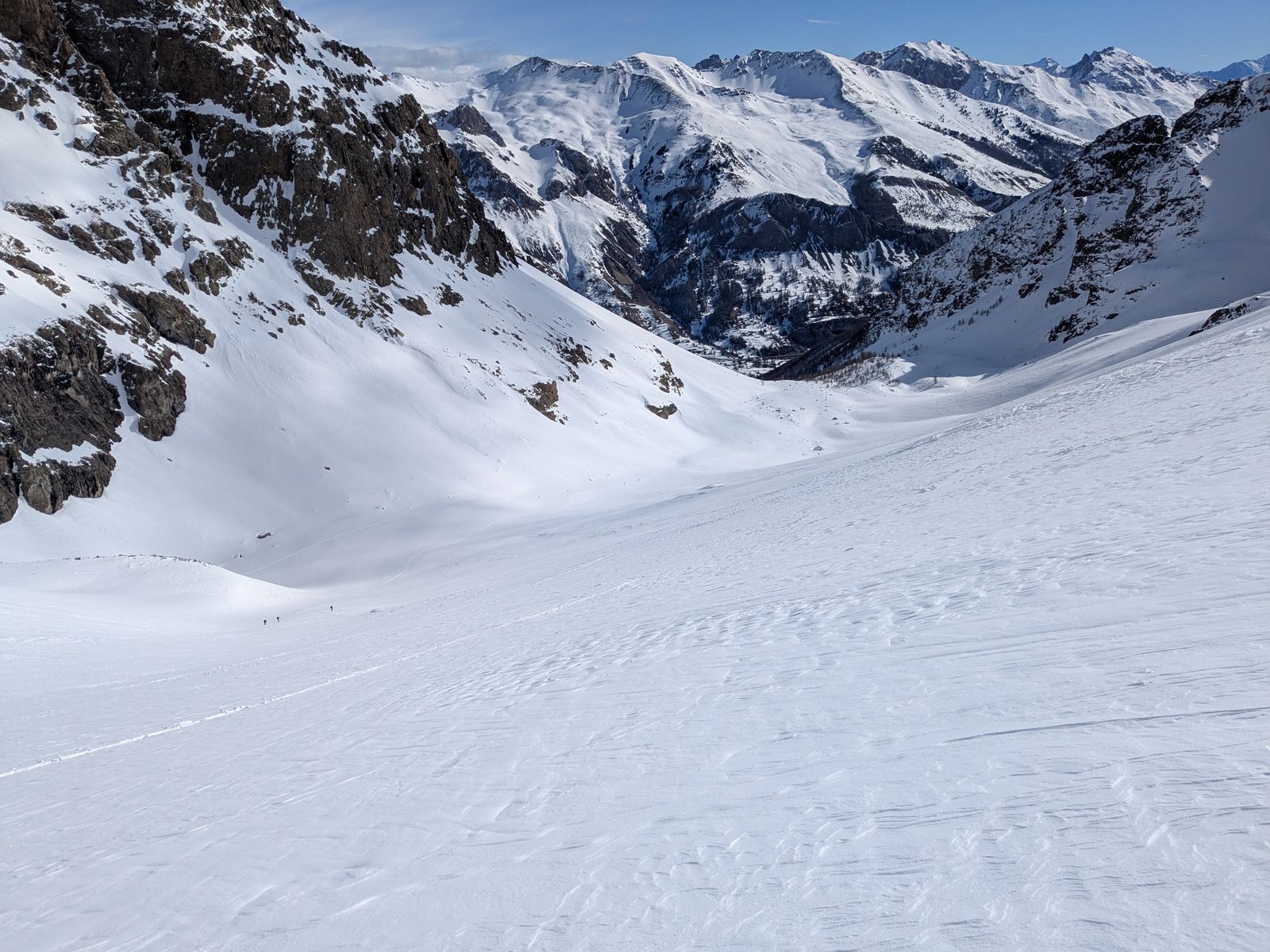 Zurzeit liegt im Dauphiné durchschnittlich mehr Schnee als in Tirol, vor allem über 2000 m Höhe. Bei einem langen Wochenende in meinem Basislager in Monetier-les-Bains hatte ich endlich die Gelegenheit, diese schöne Tour zu unternehmen. Die Route geht ins "Vallon du Fontenil", ein Nebental vom Tal der "Guisane", wenige Km nach Monetier Richtung Col de Lautaret. Das erste Stück steigt ziemlich steil im Wald, hier war der Schnee in der Früh noch eisig. Über der Waldgrenze öffnet sich das Tal und man kann nach links den "Pic de l'Étendard" auf einen schönen Nordhang besteigen. Ich ging aber weiter geradeaus und, da ich der Erste war und am Vortag ein wenig geschneit hatte, fing mit der Spurarbeit an. Nach mehreren Steilstufen und knapp 1400 Hm endete die Spurarbeit am Sattel. Das Ambiente war grandios, aber leider ließen die Schneebedingungen bei der Abfahrt Wünsche offen. Windgepresster Pulverschnee und Bruchharsch hielten den Skispaß in Grenzen. Trotzdem war ich zufrieden, da diese Tour seit Langem auf meinem Plan stand.