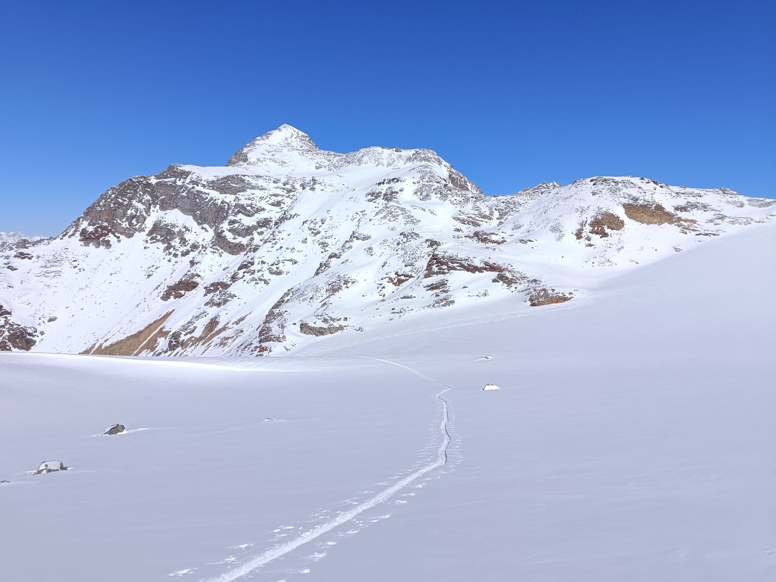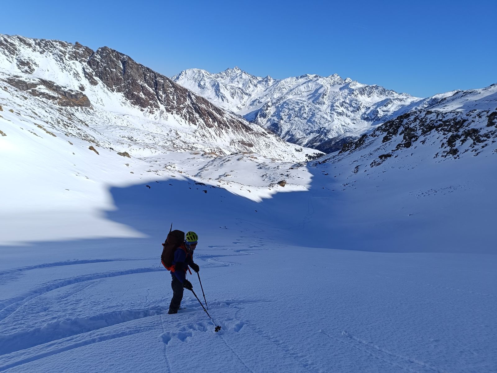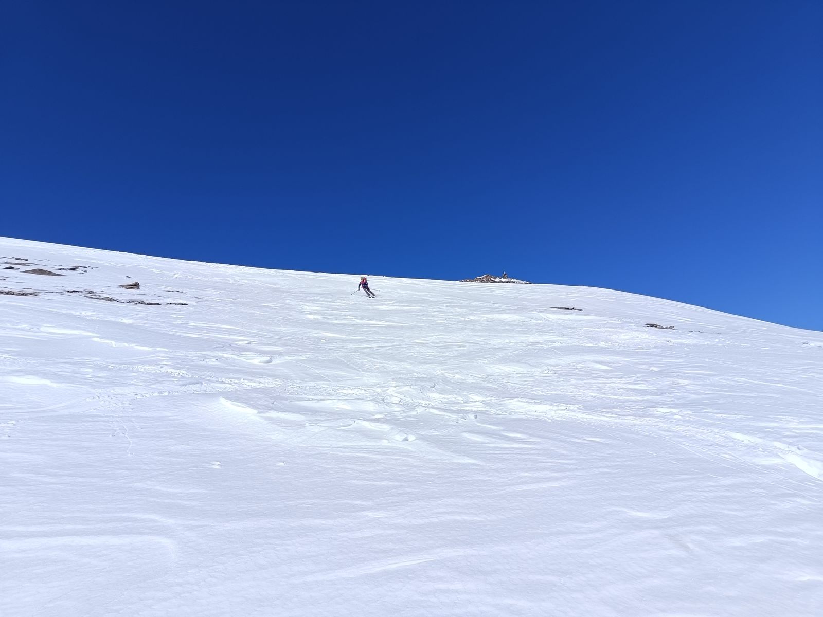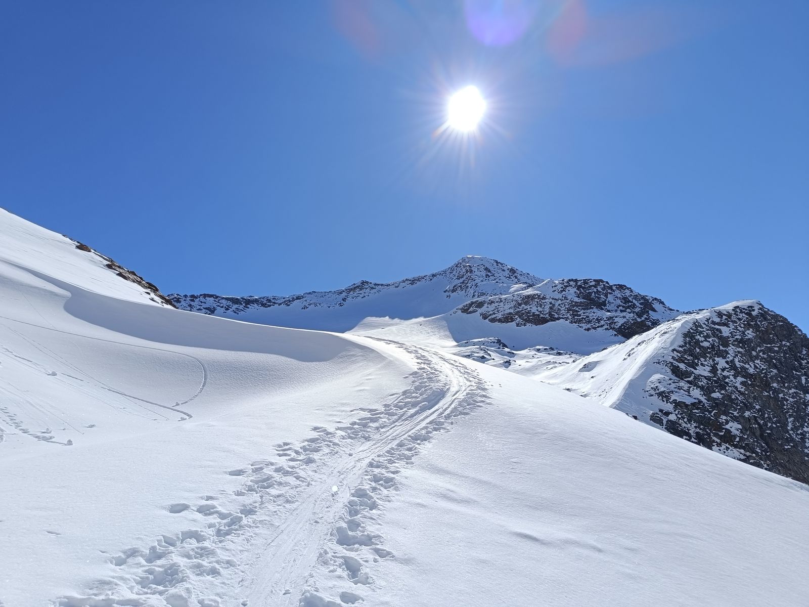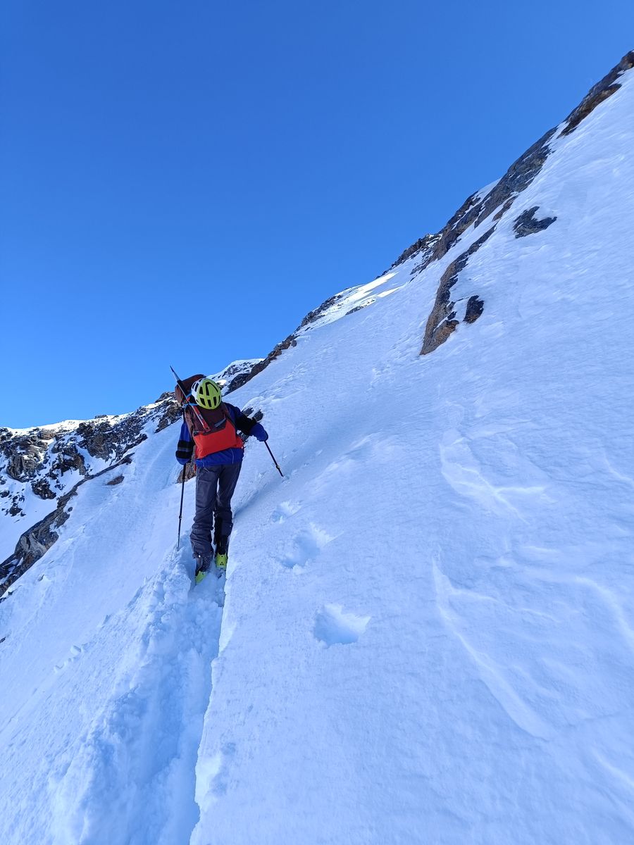 Anforderungen: 2100 Hm im Anstieg und 1400 in der Abfahrt. 9-10 Stunden. Für die ganzen vier Tage gilt, dass neben den Höhenmetern enorme Distanzen zu bewältigen sind. Bis auf die steile Rampe eine einfache Skitour.