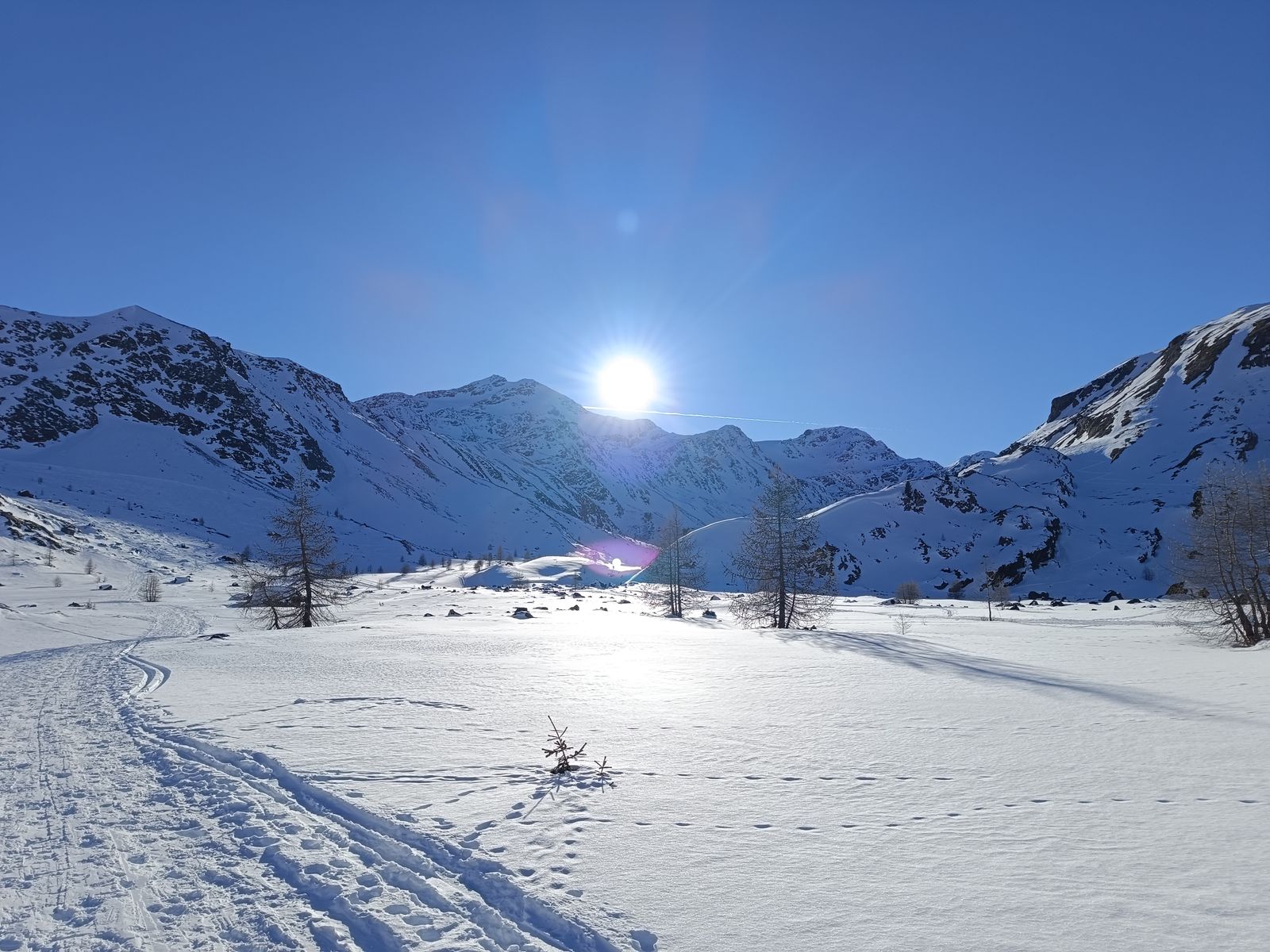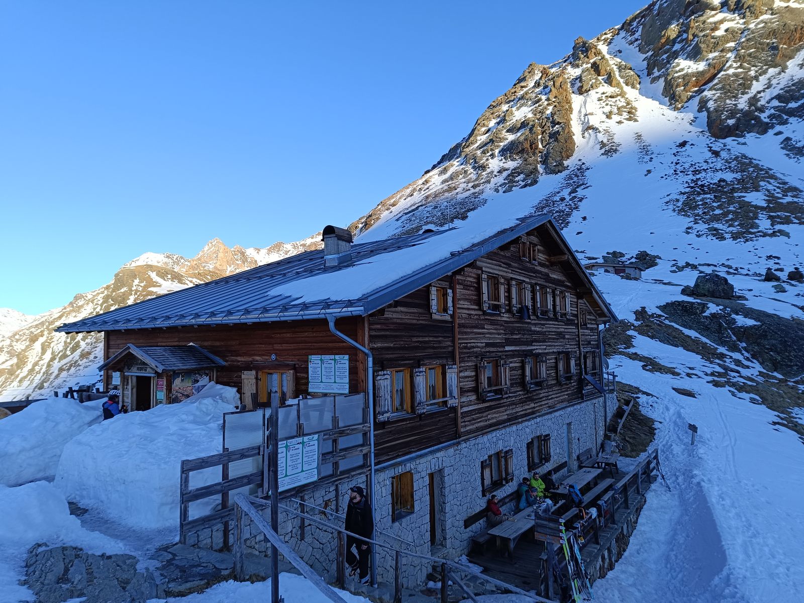 Die Gletscher sind sehr gut eingeschneit und wir haben von vorne herein darauf verzichtet, Seil etc mitzunehmen. Da mag manch einer ob der großen zu begehenden Gletscher den Kopf schütteln, aber in meinen Augen ist das vertretbar. Ich kenne die Gletscher aber auch vom Sommer im aperen Zustand und kann das daher gut einschätzen. Außerdem war das auch eine Gewichtsfrage, da wir Essen für zwei Winterraum-Übernachtungen dabei hatten. Pickel und Steigeisen kamen nicht zum Einsatz. Auch Harscheisen waren für kurze Strecken zwar komfortabel, aber nicht zwingend notwendig. Insgesamt also annähernd perfekte Bedingungen, zu denen sich vier Tage Traumwetter mit angenehmen Temperaturen in der Höhe gesellten - bei minus 20 hätte der Spaß nämlich schnell ein Loch...