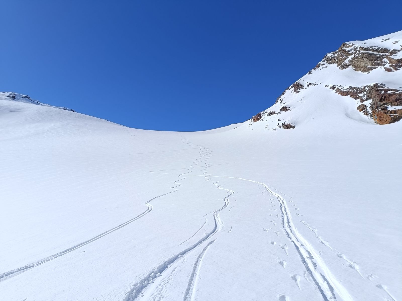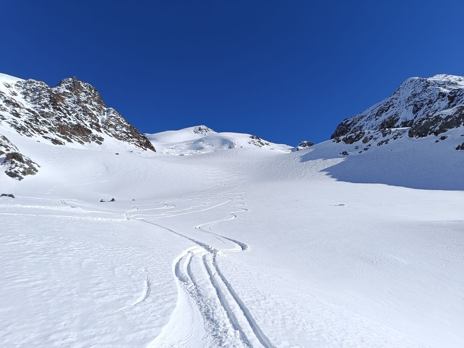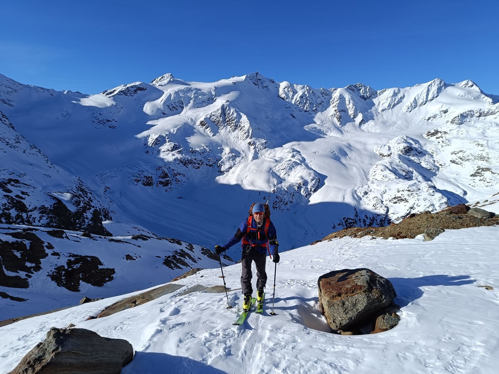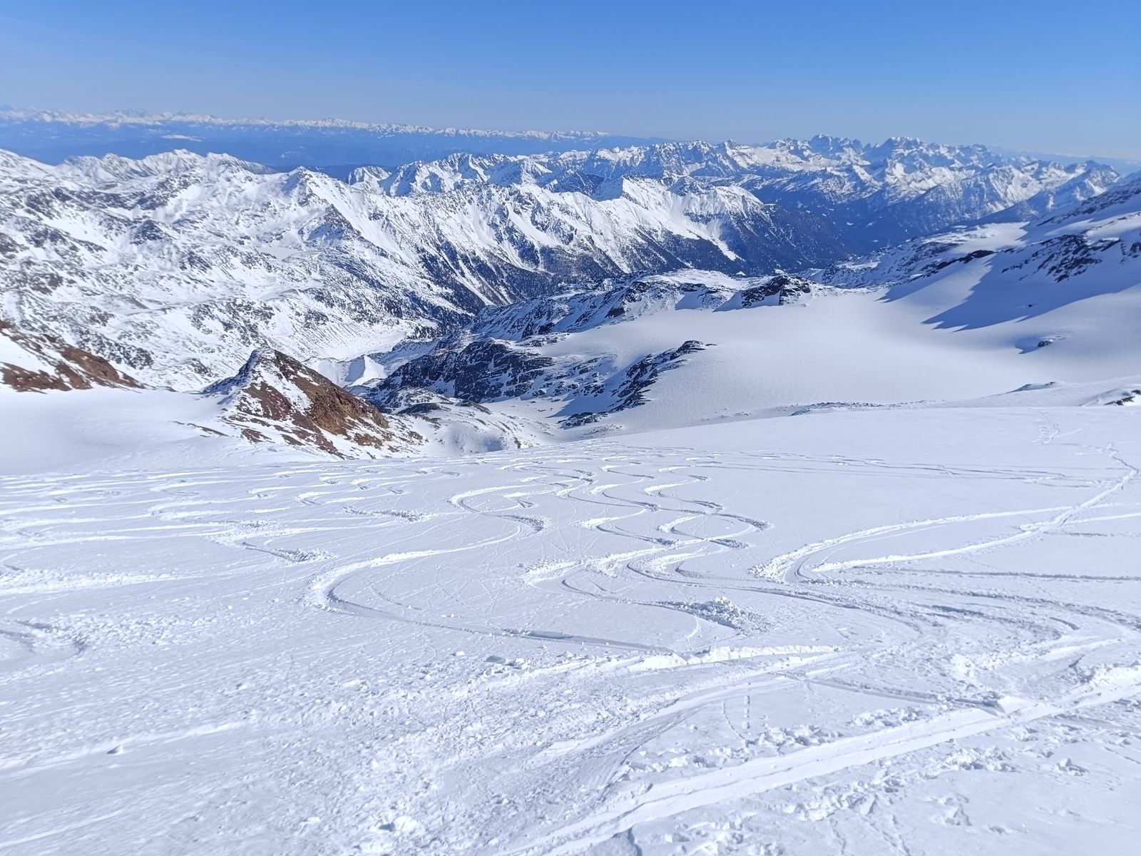 Und so ging es auf der gestrigen Abfahrtsroute wieder hoch zum Palon und drüben hinab zur Zunge des Gletschers. Super Abfahrt (Ost)! Oben hart, unten Pulver. Nun hoch zum Cevedale und über die extrem spektakuläre Abfahrt den Cedec-Gletscher hinab zur Pizzini (Nord und West). Wenn hier wie gestern noch keine Spuren drin sind, muss man sich gut auskennen, um von oben die richtige Route durch die Eisbrüche zu finden. Zum Glück habe ich ein gutes Gedächtnis und weiß, wo man da fahren muss.