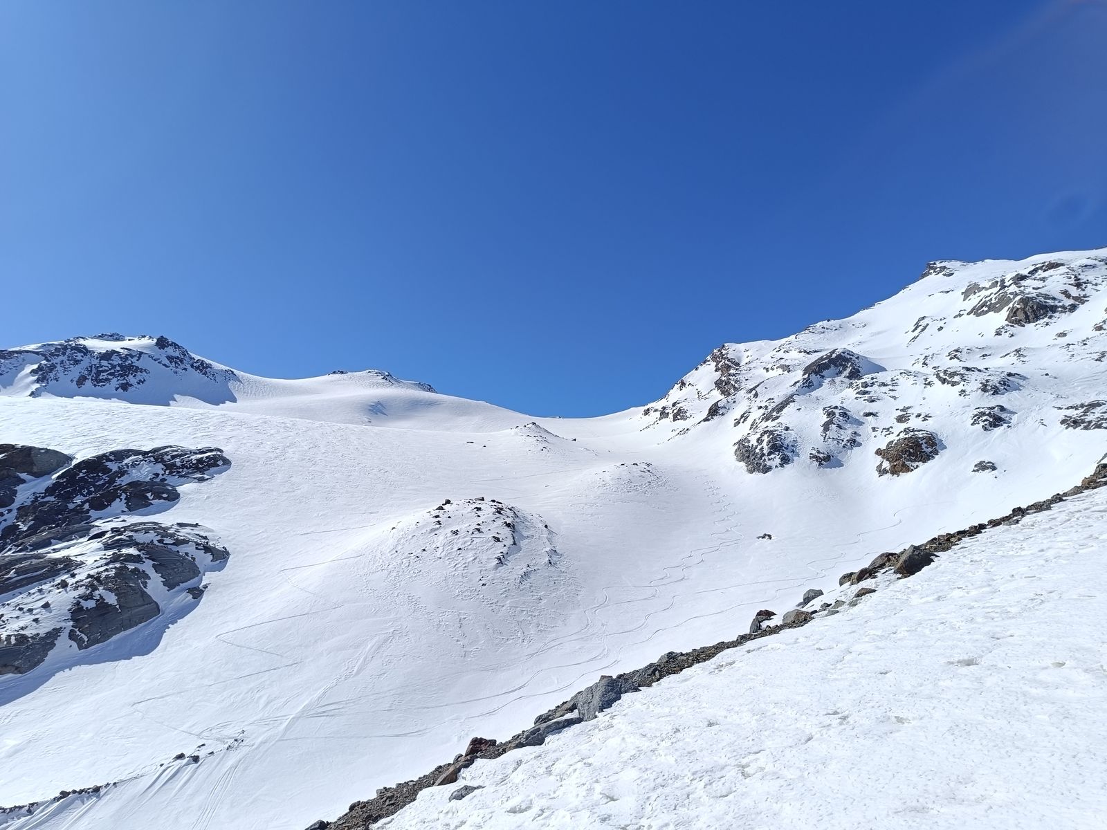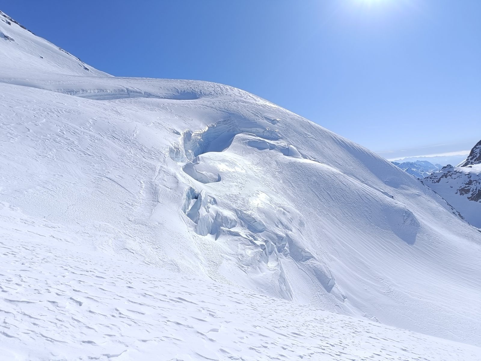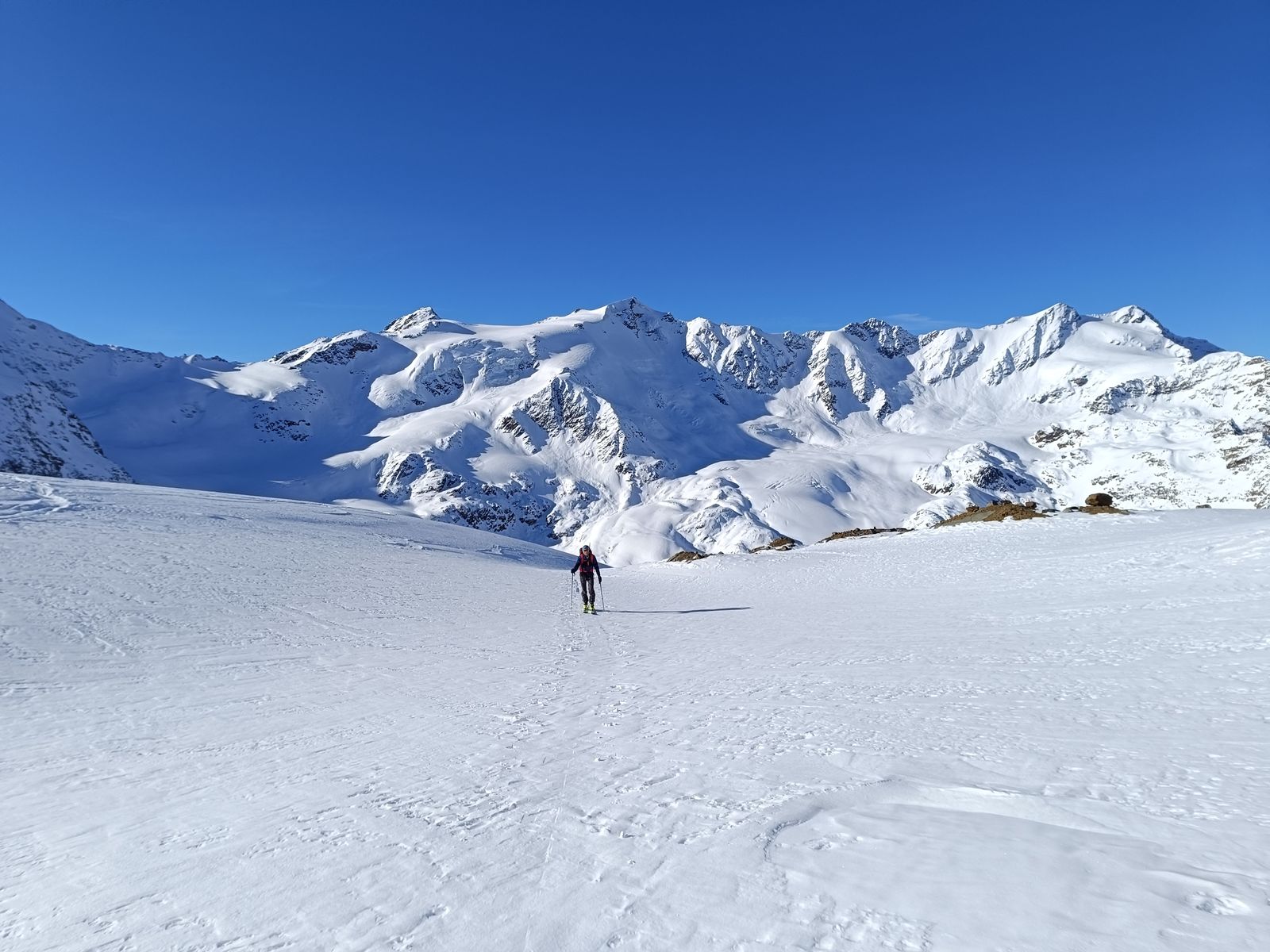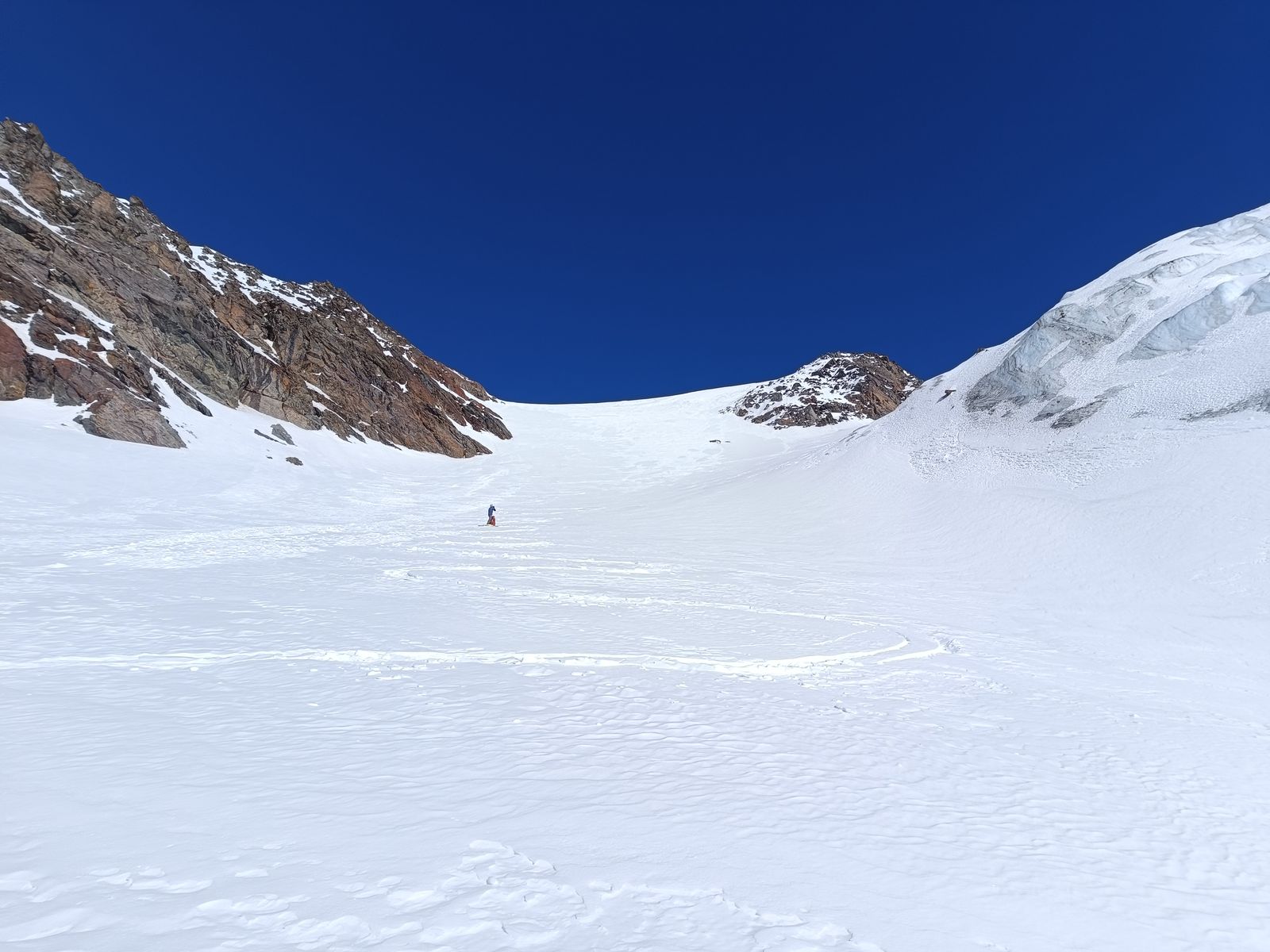 Und so ging es auf der gestrigen Abfahrtsroute wieder hoch zum Palon und drüben hinab zur Zunge des Gletschers. Super Abfahrt (Ost)! Oben hart, unten Pulver. Nun hoch zum Cevedale und über die extrem spektakuläre Abfahrt den Cedec-Gletscher hinab zur Pizzini (Nord und West). Wenn hier wie gestern noch keine Spuren drin sind, muss man sich gut auskennen, um von oben die richtige Route durch die Eisbrüche zu finden. Zum Glück habe ich ein gutes Gedächtnis und weiß, wo man da fahren muss.