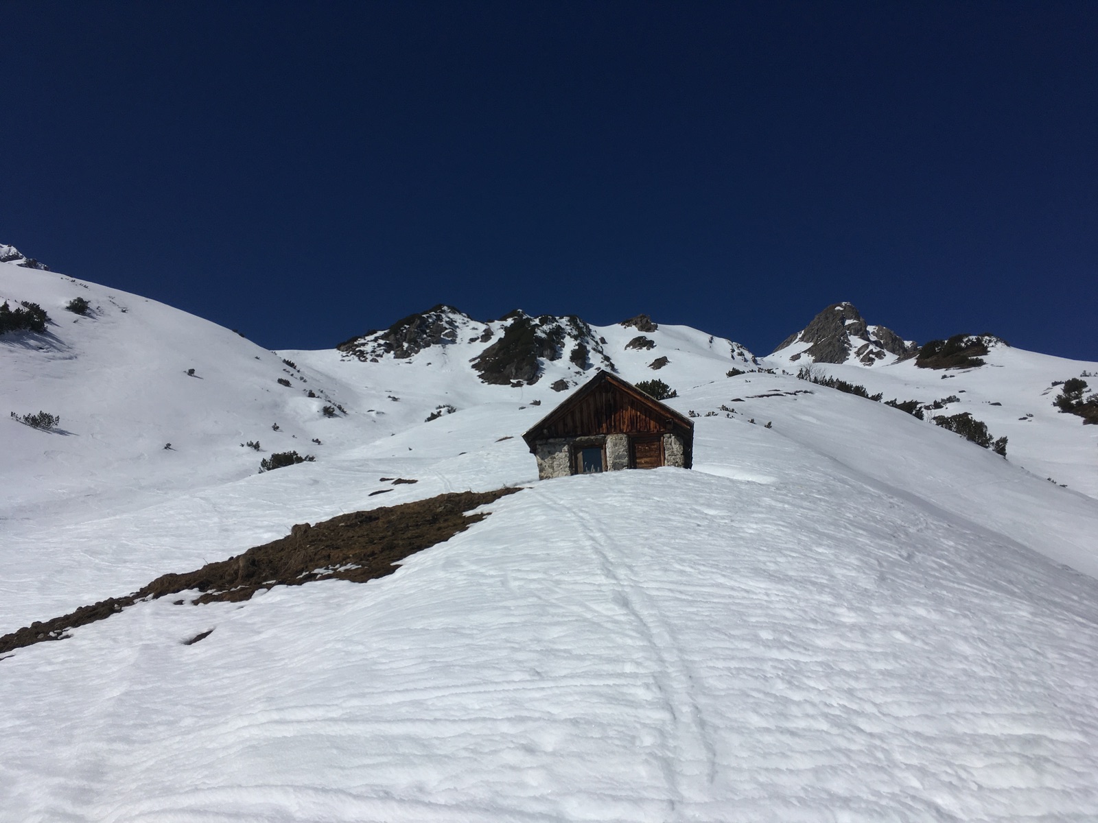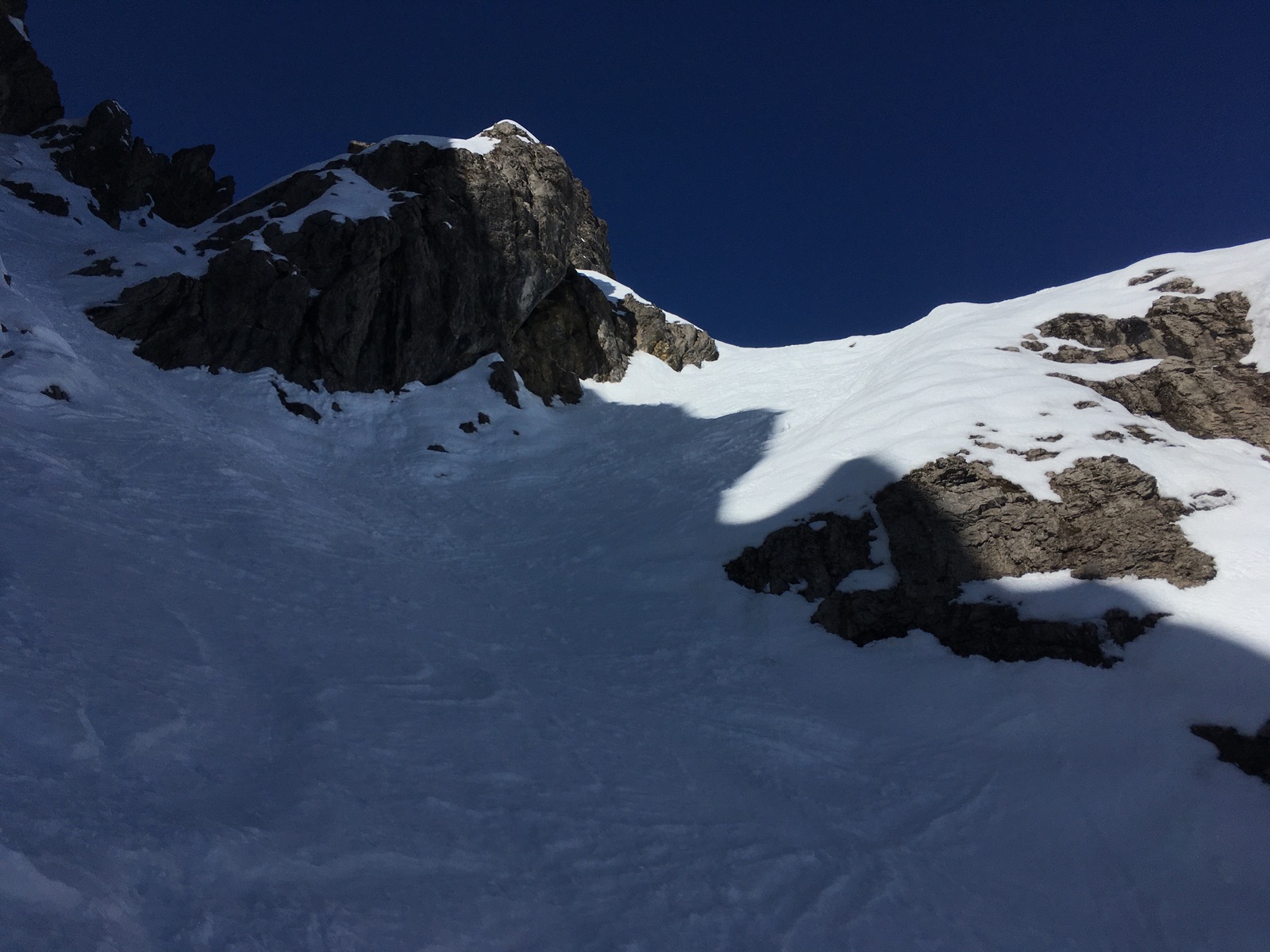 Hat man den steilen Hang (teilweise Rinne) zur alten Galtberghütte geschafft, wird es zunächst deutlich kommoder. Erst im Aufstieg durch die Rinne unter dem Grat Kaminlochköpfe - Galtbergspitze und dann der Rampe sowie dem Grat selber wird es wieder steiler. Es ging heute aber alles gut und sogar ohne Harscheisen. Nur die von unten nicht sichtbaren, breiten und vermutlich noch nicht sehr alten Gleitschneerisse im Hang unter der Rinne sorgten für einen kurzen Schockmoment.