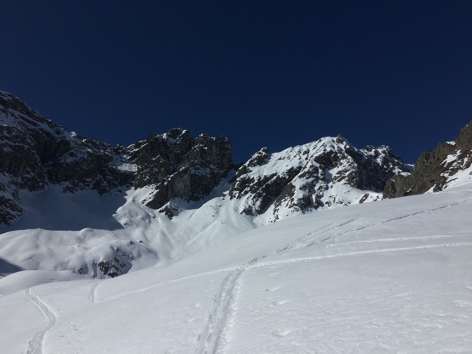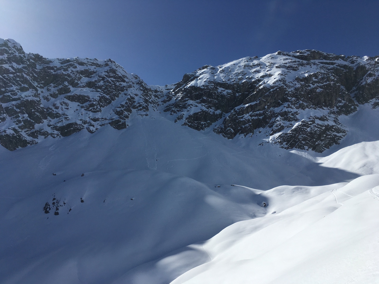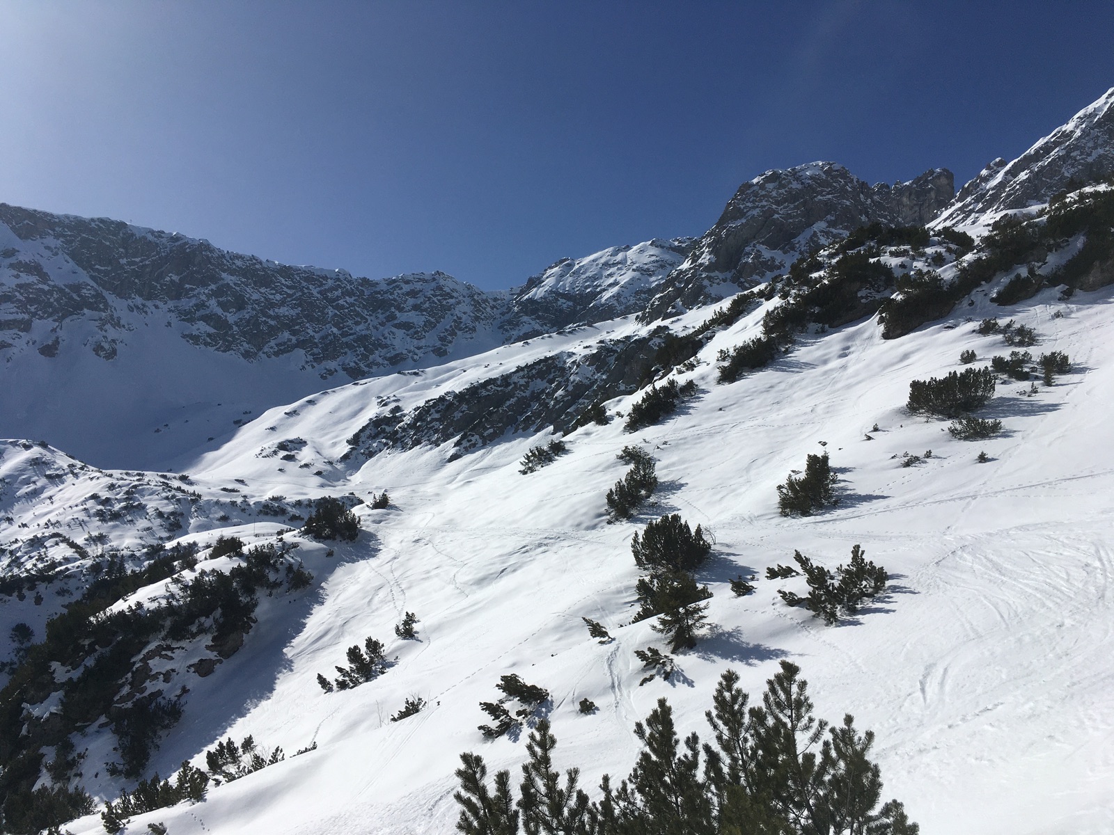 Bei der leider späten Abfahrt um ca. 13.45 Uhr (früher schafft man es nicht mit dem Zug von München bzw. müsste noch schneller gehen) war der ostseitige Gipfelhang eine Mischung aus Bruchharsch und Feuchtschnee, ebenso die Rinne. Weiter unten extrem schattseitig auch noch schöner Pulver. Die weiteren, meistens ostseitigen Hänge boten einen Wechsel aus Pulver, (bruch-)harschigen Partien und aufgefirntem Schnee. Das Kälbertal lief auch am Nachmittag recht gut heraus.