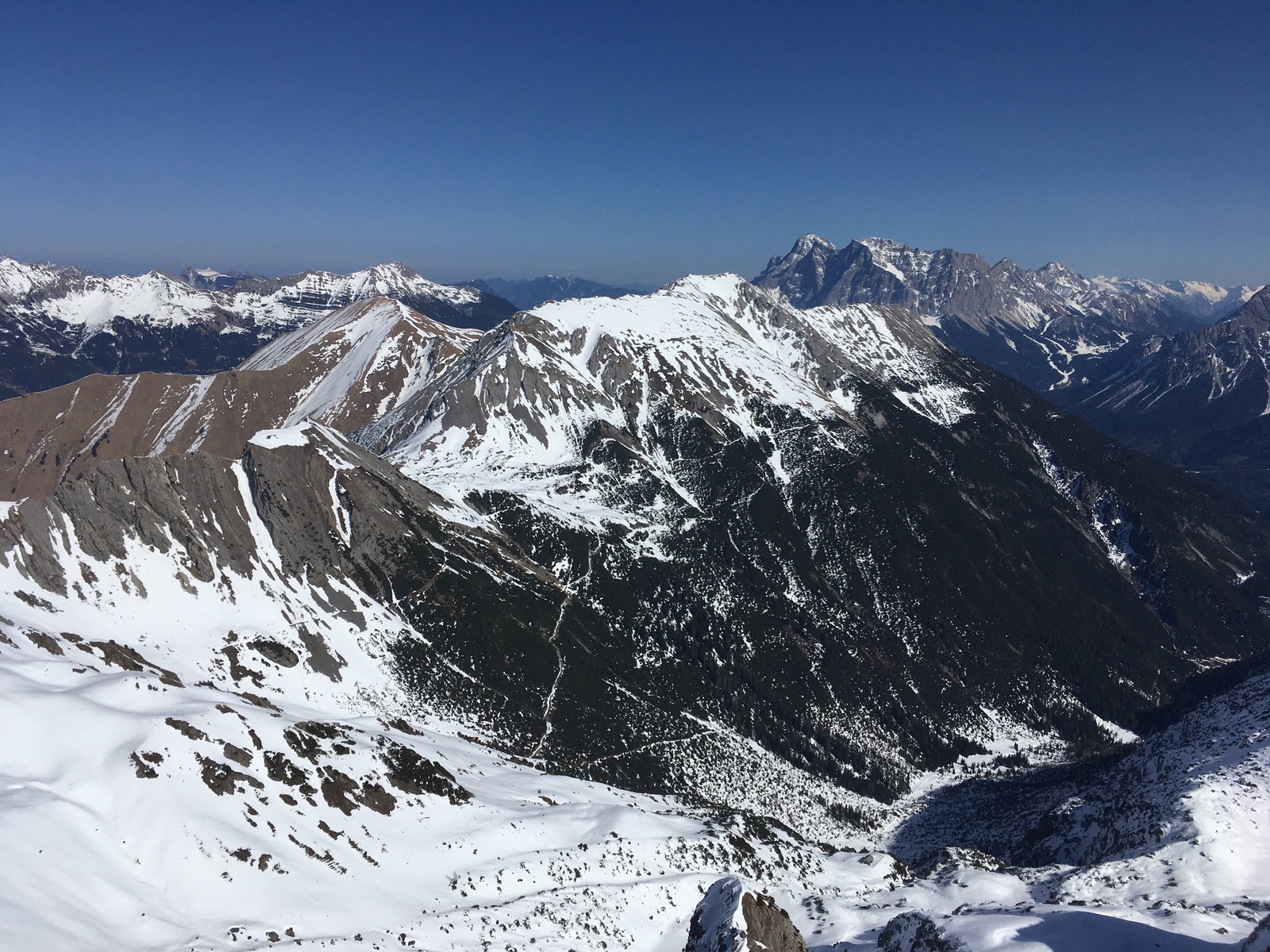 Blick vom Gipfel zur Gartner Wand mit dem teilweise ausgeaperten Weg zum Bichlbächler Jöchle: