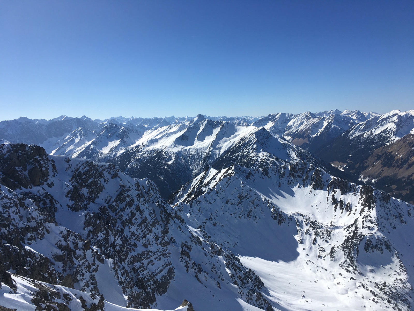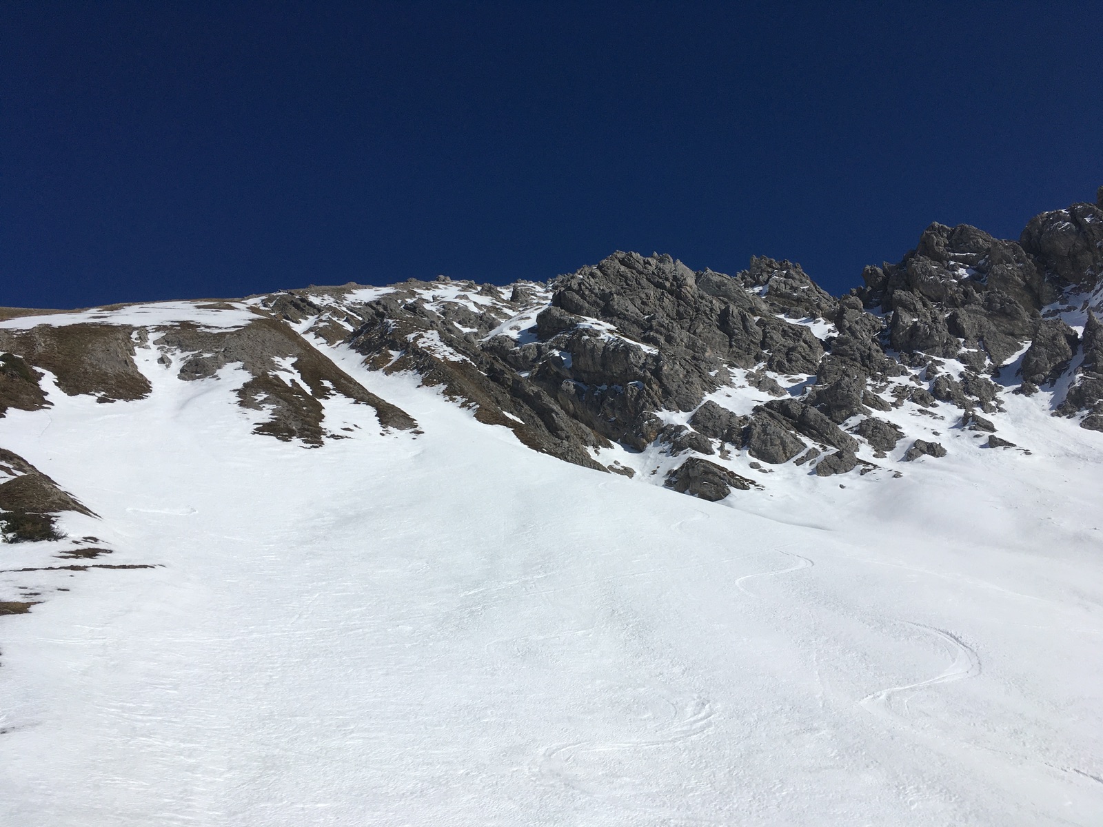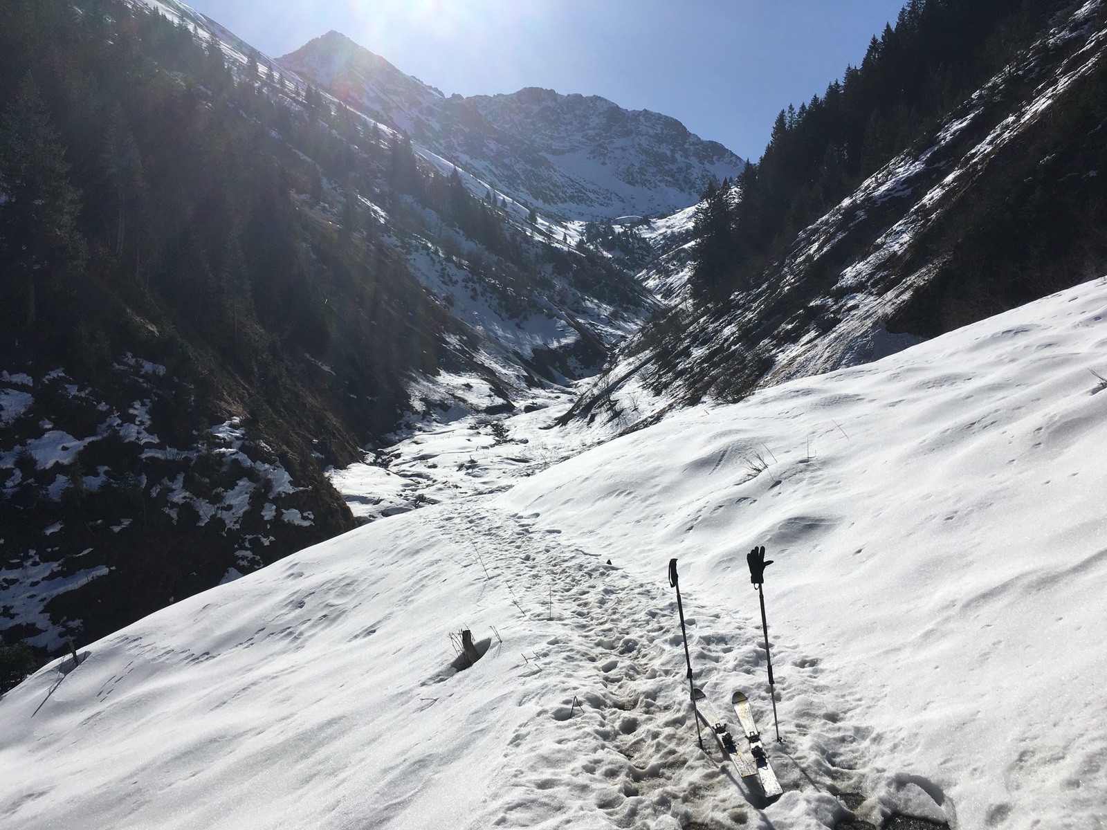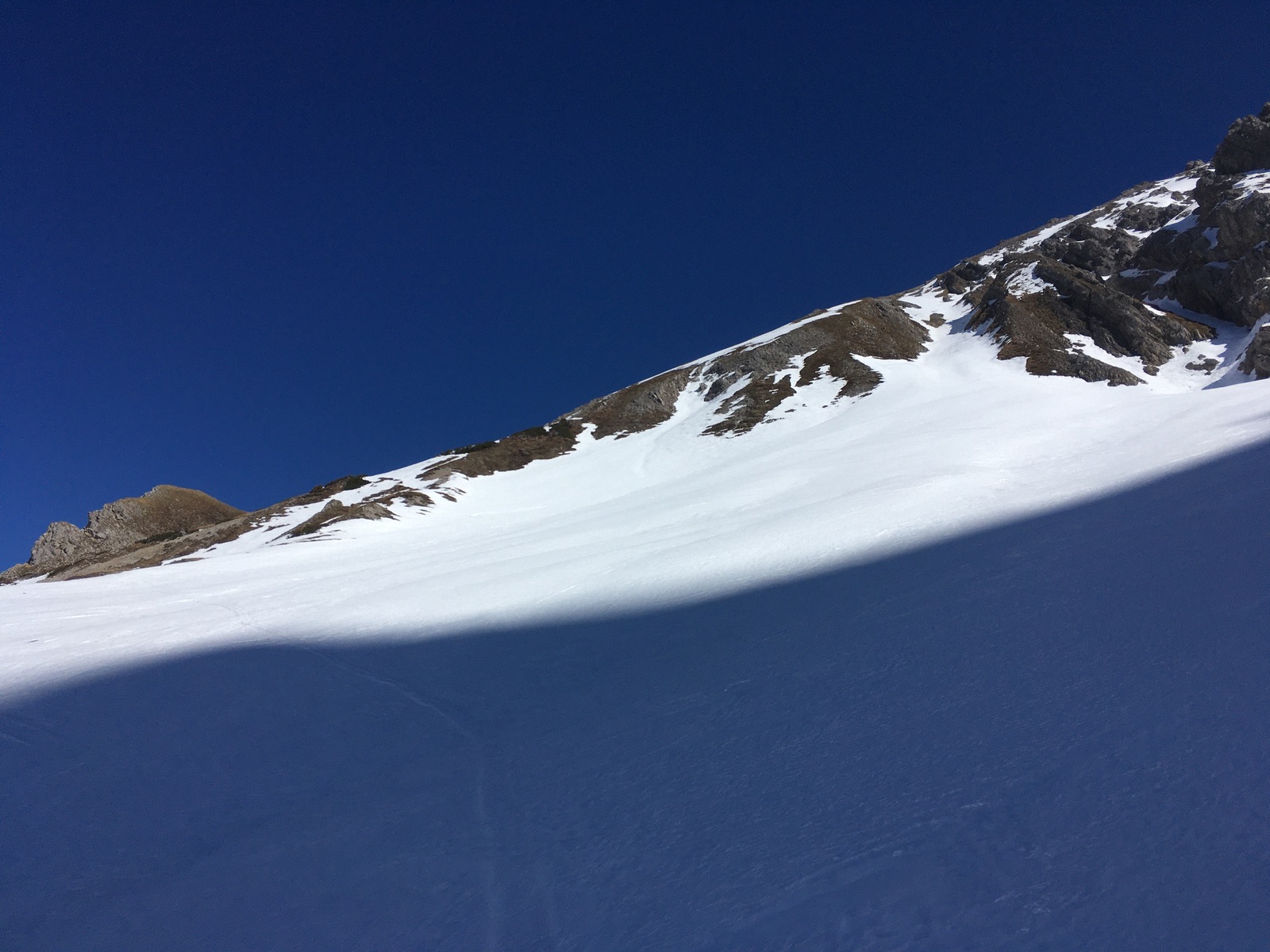 Heute bin ich auf den Roten Stein, allerdings auf der im Winter seltener begangenen Route von Berwang. Der Weg ins Alpelestal und dann im Tal selber weist mehrere apere Stellen auf. Der Anstieg hier ist auch durch die zu querenden Lawinenrinnen recht mühsam. Dafür scheint hinsichtlich Lawinen aus den Flanken das meiste schon unten zu sein bzw. liegt oberhalb auch nicht mehr viel (irgendeinen Vorteil muss ein so schneearmer Winter ja haben; grundsätzlich ist die Route stark lawinengefährdet). Ab dem Älpele wird es dann zunächst wieder entspannter - allerdings war die Schneedecke hart gefroren (Harscheisen im oberen, steilen Teil sehr angenehm). Es geht ungefähr im Bereich des Sommerweges mit Skiern noch bis gut 2.240 m hoch. Der Rest des Anstiegs ging dann problemlos zu Fuß. Eine möglicherweise denkbare Abfahrt direkt ab dem Gipfel habe ich mir angesichts der geringen Schneelage, des teilweise harten Schnees und der damit einhergehenden Absturzgefahr sowie mangels Kenntnis, ob die Rinnen wirklich durchgehend gehen gespart und bin die ca. 125 Hm wieder zu Fuß herunter. Abfahrt dann um 14:00 durch die markante S-W-Rinne - aufgefirnt. Bei Verhältnissen wie heute ist es sehr zu empfehlen, nicht zu früh abzufahren (wohl nicht vor 13:30 Uhr; im Aufstieg war der Schnee westseitig meistens noch sehr hart). Weiter unten, wo die Sonne nicht so hinkommt, war der Schnee noch nicht voll umgewandelt und bot einen Wechsel aus Wind- und Schmelzharschdeckel (mal tragend, mal nicht), teilweise noch Pulver - insgesamt passabel zu fahren. Das Alpelestal ging herunter besser als erwartet, min. 2x muss kurz abgeschnallt werden. Eventuell könnte man auch bis zum Ortsteil Tal durchgehend abfahren, statt nach Gröben zu queren (habe ich aber nicht ausprobiert). Steinski sind hier zur Zeit sehr zu empfehlen, weil man angesichts der geringen Schneelage und mehrerer schneearmen Querungen wohl Steine erwischen wird.