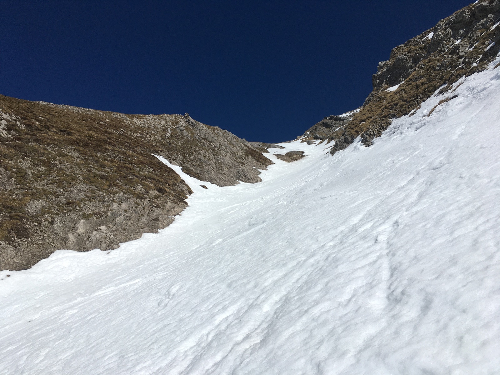 Blick vom Rinnenfuß auf die Abfahrtsrinne - heute meistens guter Firn bei nicht zu früher Abfahrt: