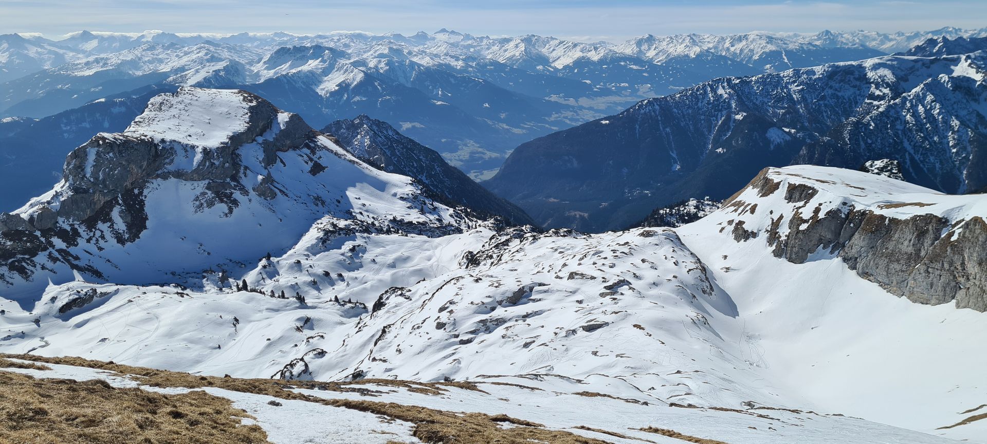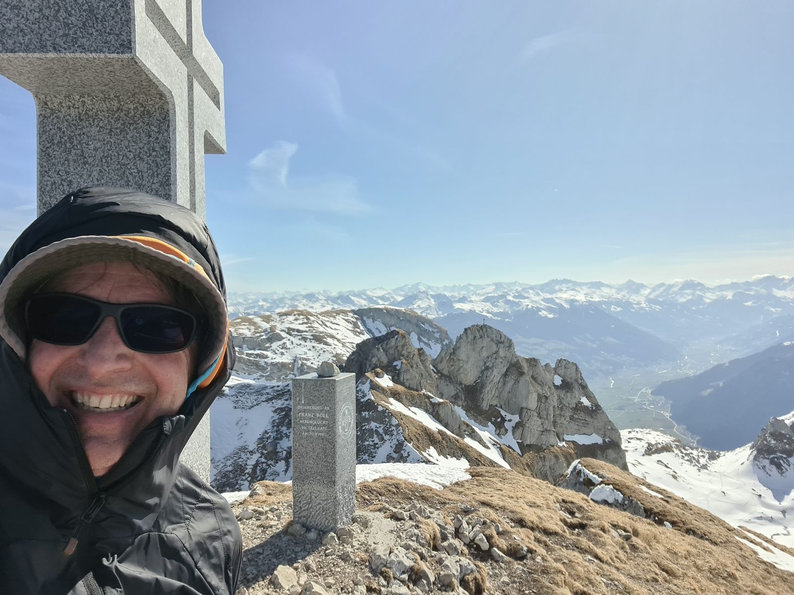 Verhältnisse: Die Tour ist bis auf die letzten 10 Meter durchgehend mit Ski begeh- und befahrbar. Am Vormittag griffiger Harsch (keine Harscheisen notwendig); bis ich den Südosthang erreicht habe (ca. 10 Uhr) war der schon leicht firnig. Anders der südseitige Gipfelhang, der war hart (aber nicht unangenehm) und hat auch bis 11 Uhr nicht aufgemacht. Vielleicht lag es auch am Wind. Während im unteren Bereich des Anstiegs kein Bröserl Wind zu spüren war, empfing mich am Gipfelhang kräftiger Wind. Der Föhn machte sich bei der Abfahrt dann aber auch im unteren Bereich bemerkbar.