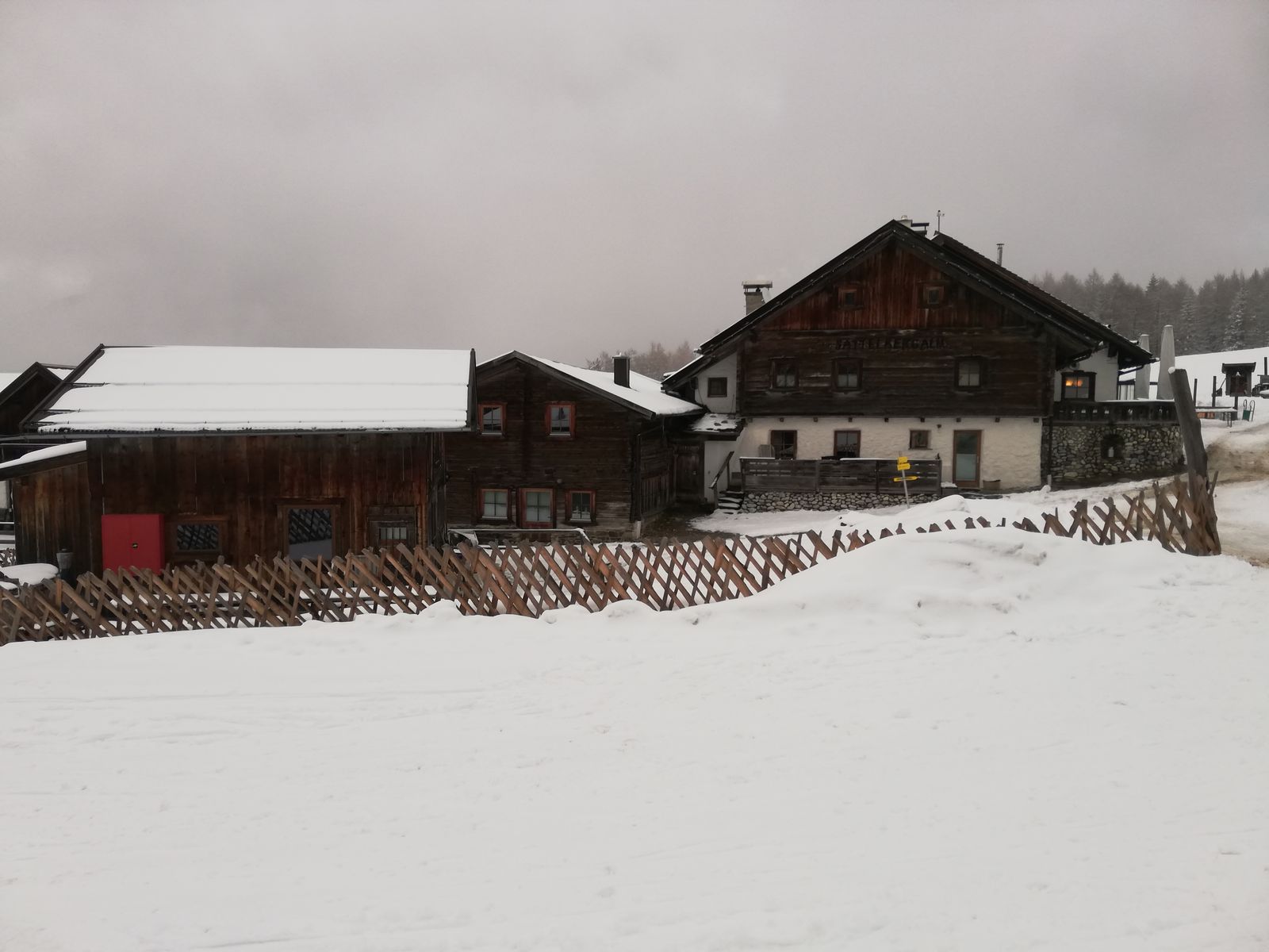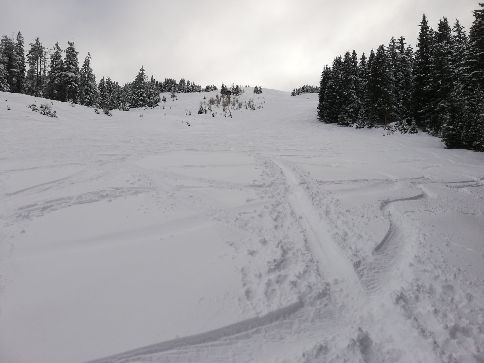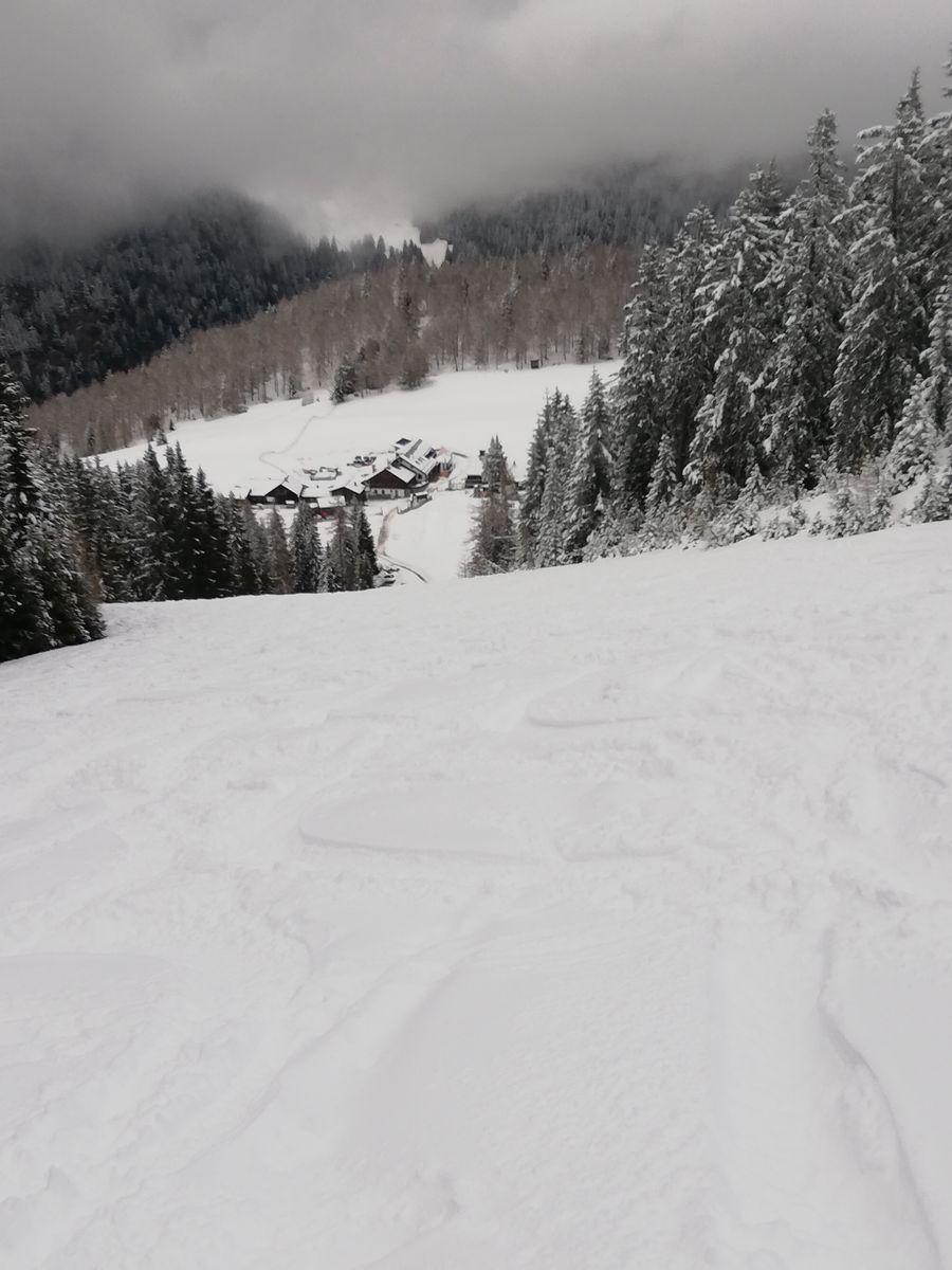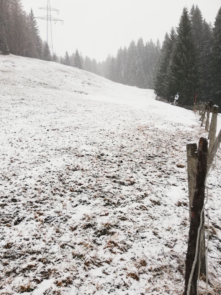 Ab Parkplatz etwa fünf Minuten Ski tragen, dann kann man mit Ski gehen und bis dahin auch notdürftig bei der Abfahrt abrutschen. Es folgt erstmal ein Altschneestreifen und eine etwa 10m lange eigentlich apere Stelle, die nur vom Neuschnee der Nacht auf Freitag leicht bedeckt ist. Auch der Neuschnee neben dem Altschneestreifen ist nur minimal, das Gras schaut raus bzw wird bei Schwüngen frei gelegt. Ab etwa 1400m dann ausreichend Schnee.