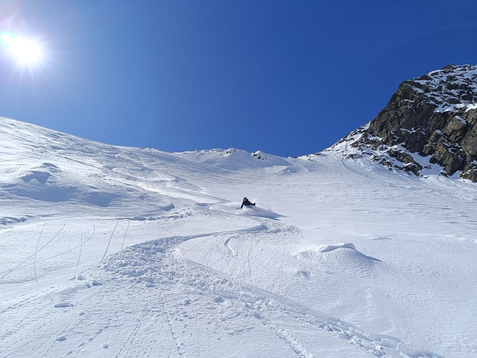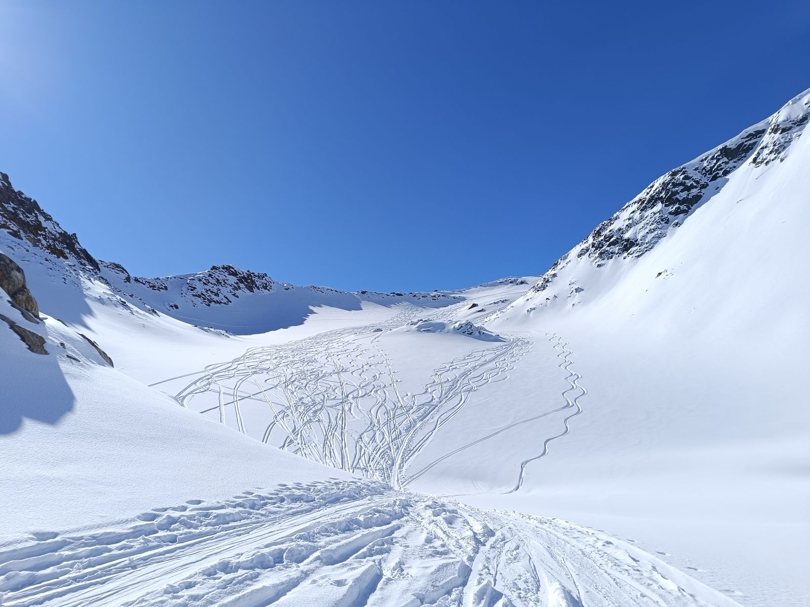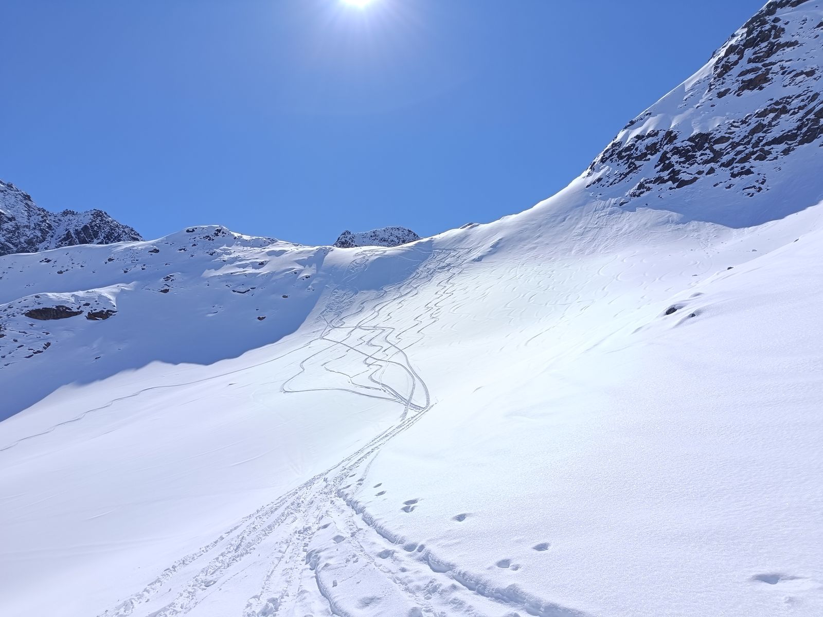 Vom Gipfel des Zwieselbachers (hoch wie runter gut mit Skiern machbar) sind wir bis etwa 2600 Meter in bestem Pulver abgefahren, haben dann nochmals aufgefellt und sind zur Weitkarspitze. Im südseitigen Gipfelhang hatte es heute fast schon Firn. Die weitere Abfahrt erfolgte über die herrliche, steile Variante über den Krapessee (durchgehend Edelpulver), wo erst drei Spuren drin waren.