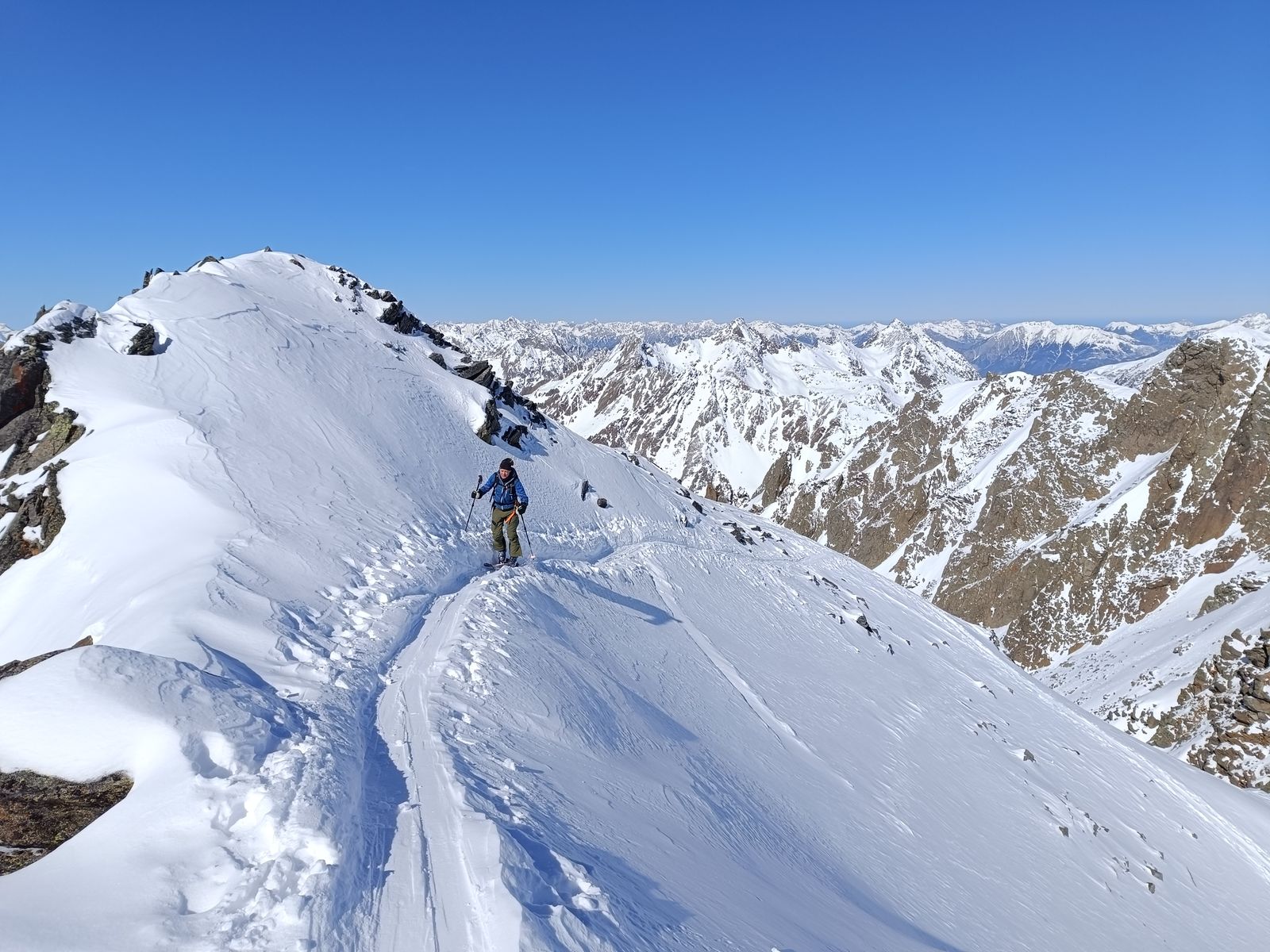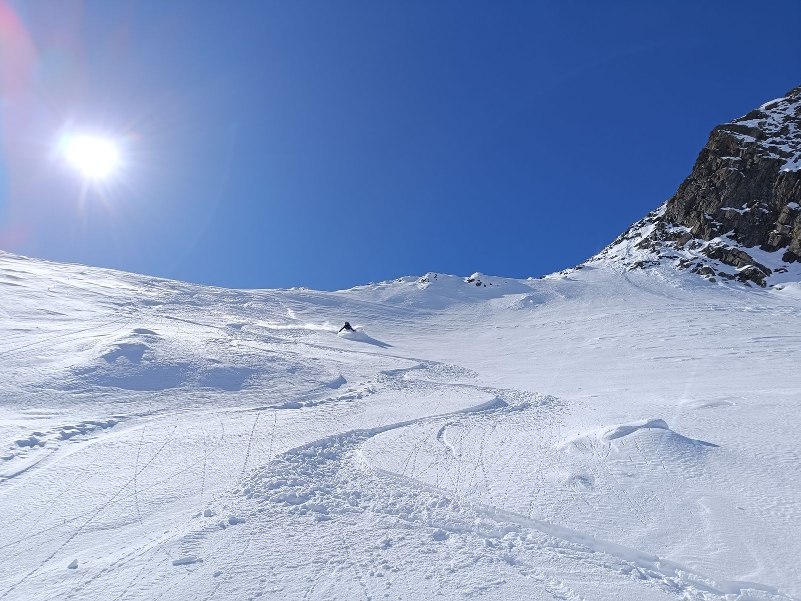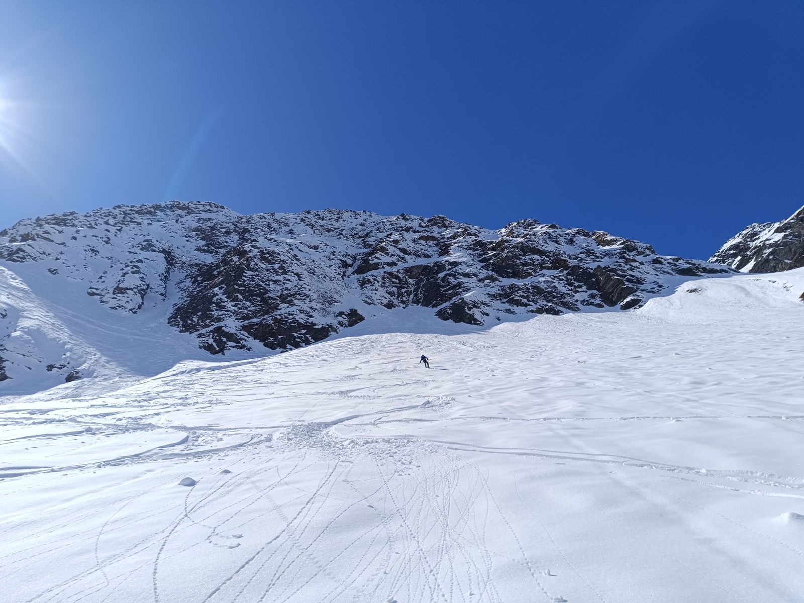 Vom Gipfel des Zwieselbachers (hoch wie runter gut mit Skiern machbar) sind wir bis etwa 2600 Meter in bestem Pulver abgefahren, haben dann nochmals aufgefellt und sind zur Weitkarspitze. Im südseitigen Gipfelhang hatte es heute fast schon Firn. Die weitere Abfahrt erfolgte über die herrliche, steile Variante über den Krapessee (durchgehend Edelpulver), wo erst drei Spuren drin waren.
