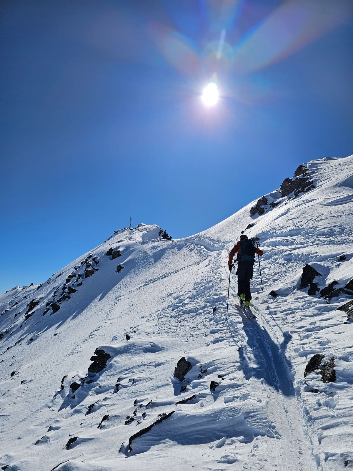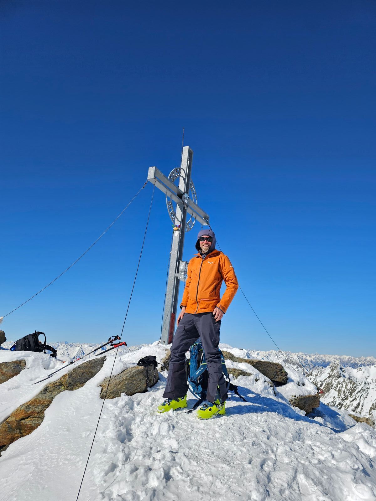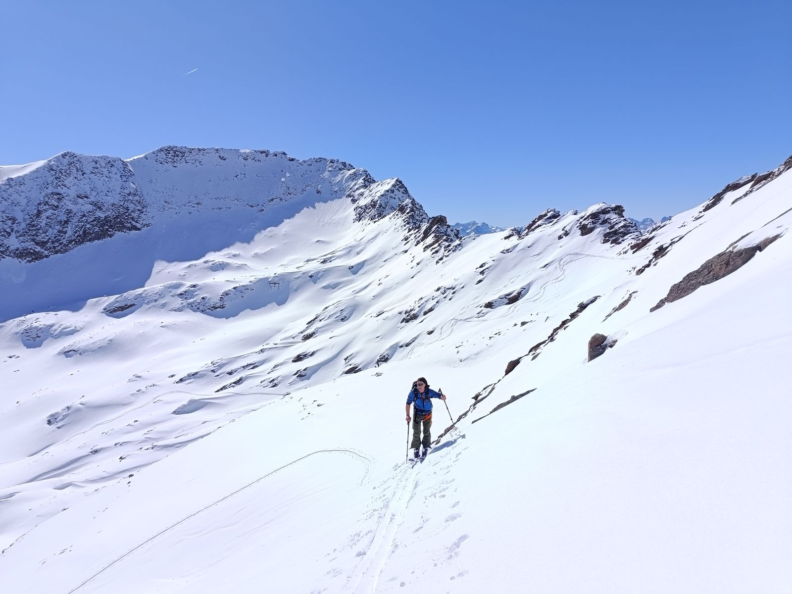 Lawinengefahr: Heute gefühlt eher LWS 1 als 2 wie im LLB. In meinen Augen total sicher. Die von uns gewählte Variante geht bis 40 Grad und knapp darüber.