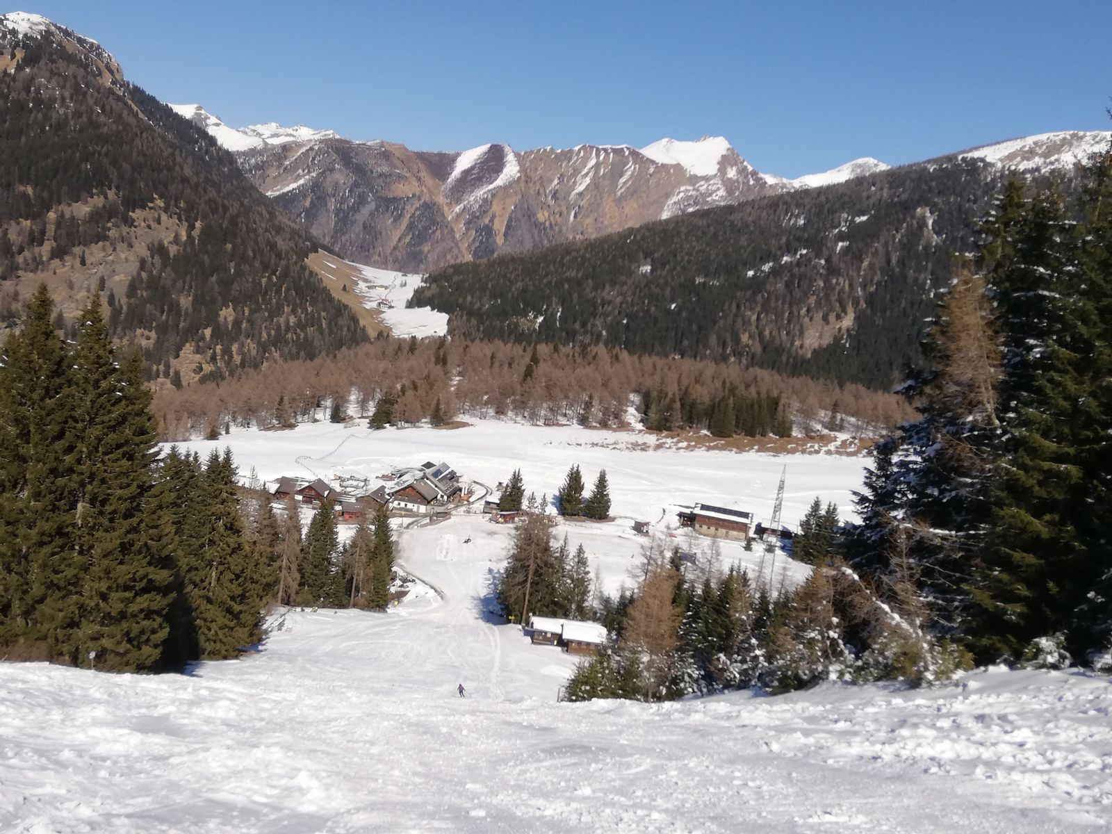 Im unteren Bereich ist der Neuschnee der vergangenen Tage wieder weg, es schaut aus wie vor einer Woche. Dh, 10 Minuten Ski tragen, dann auf einem schmalen, jetzt eisigen Streifen weiter, wenige Meter aper, ab ca 1400m ausreichend Schnee. Das dürfte trotz der angesagten Wärme noch einige Tage so bleiben, nur die apere Stelle wird länger werden.