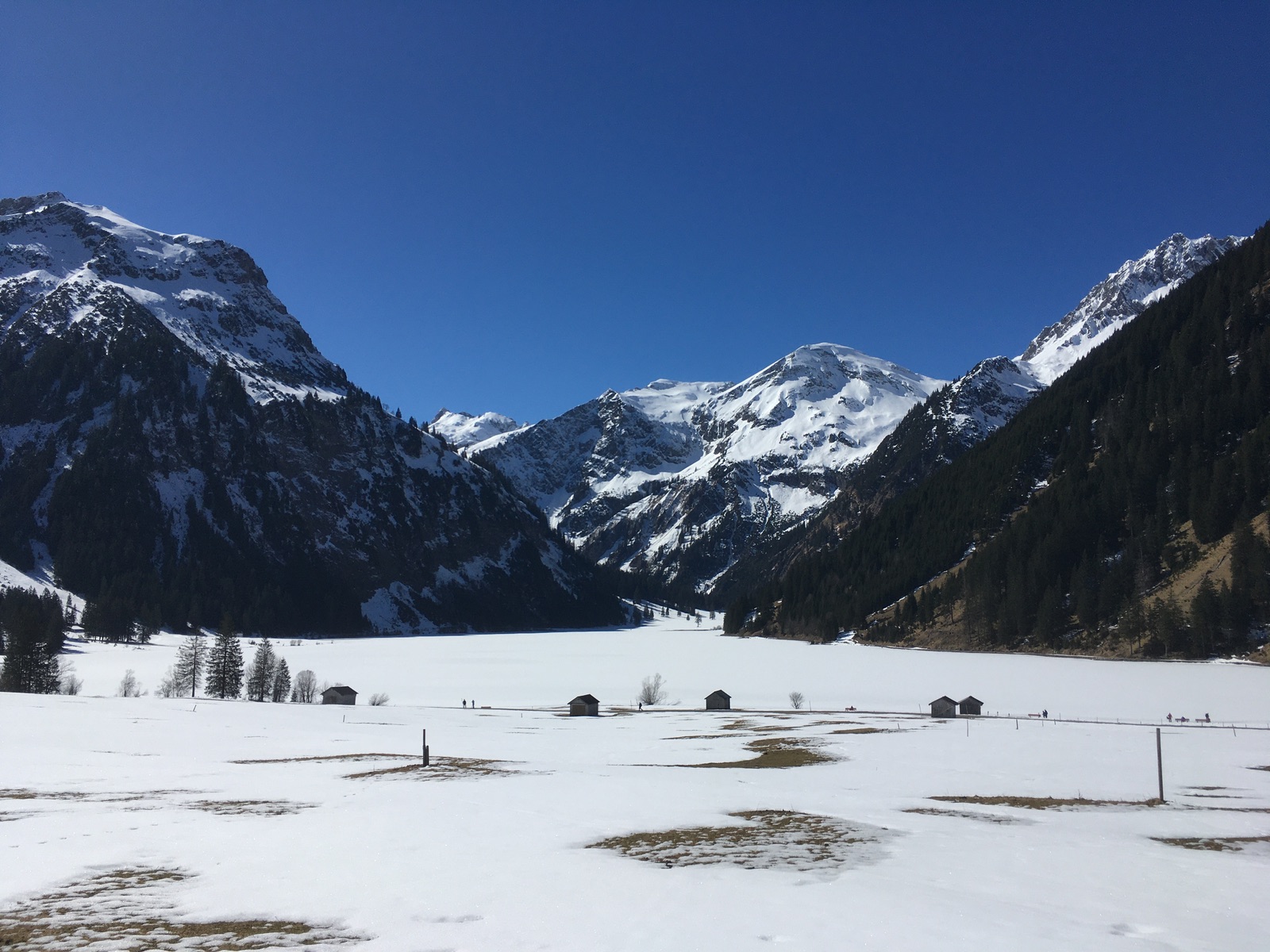 Blick über den noch zugefrorenen Vilsalpsee (betreten würde ihn aber dennoch nicht mehr ...):