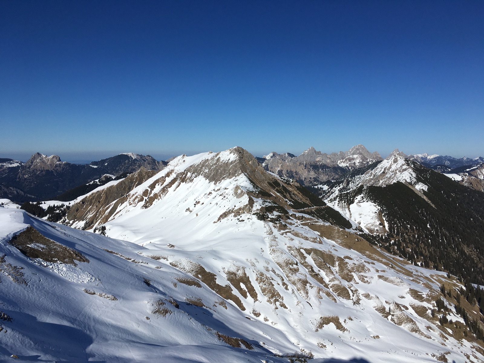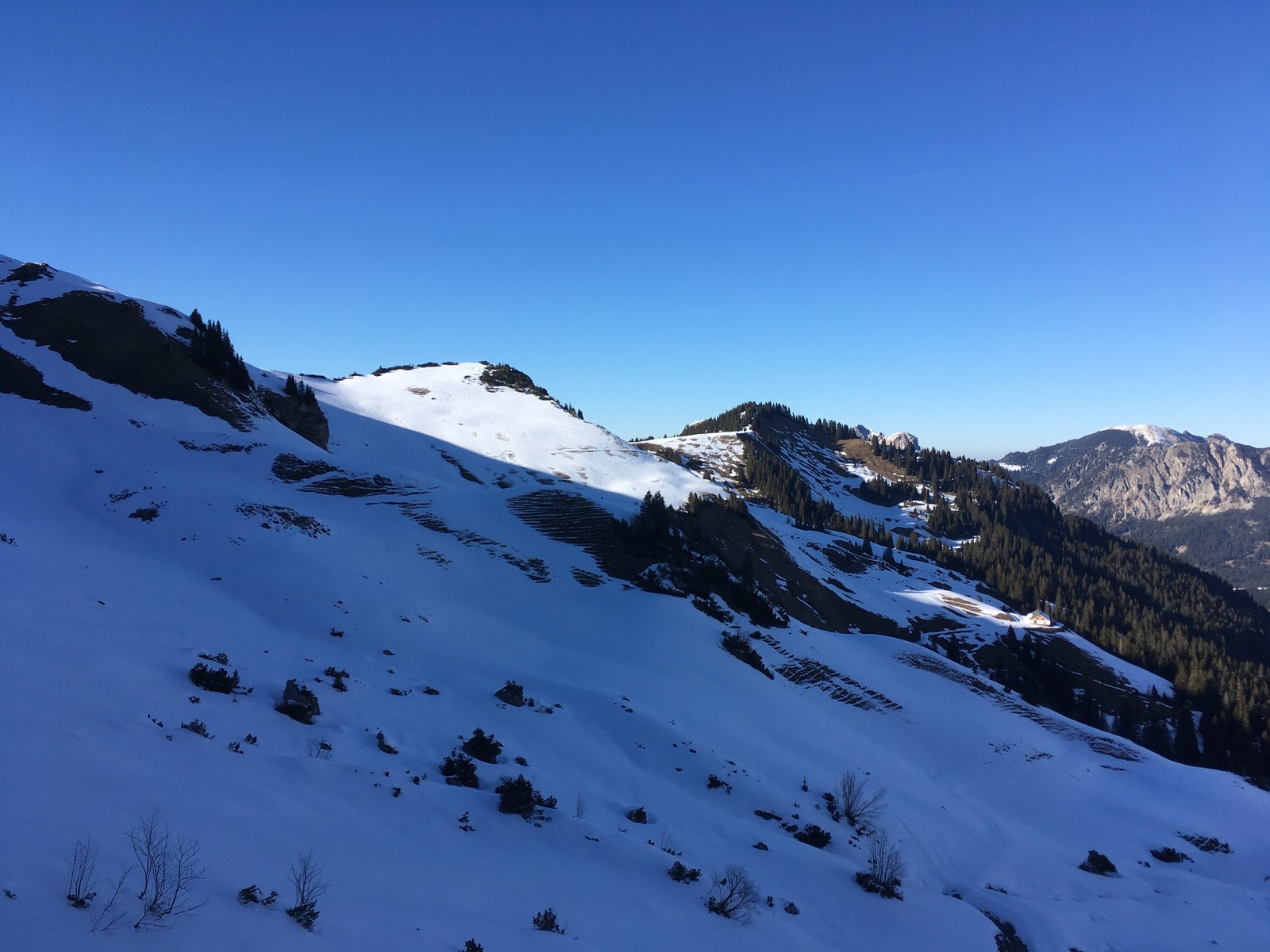Blick zurück auf den Anstieg zum und die Abfahrt vom Geierköpfle: