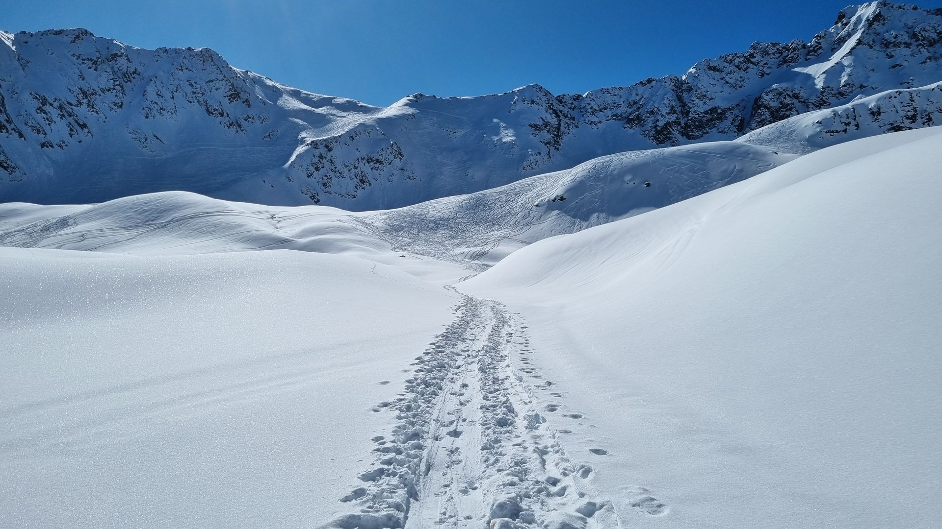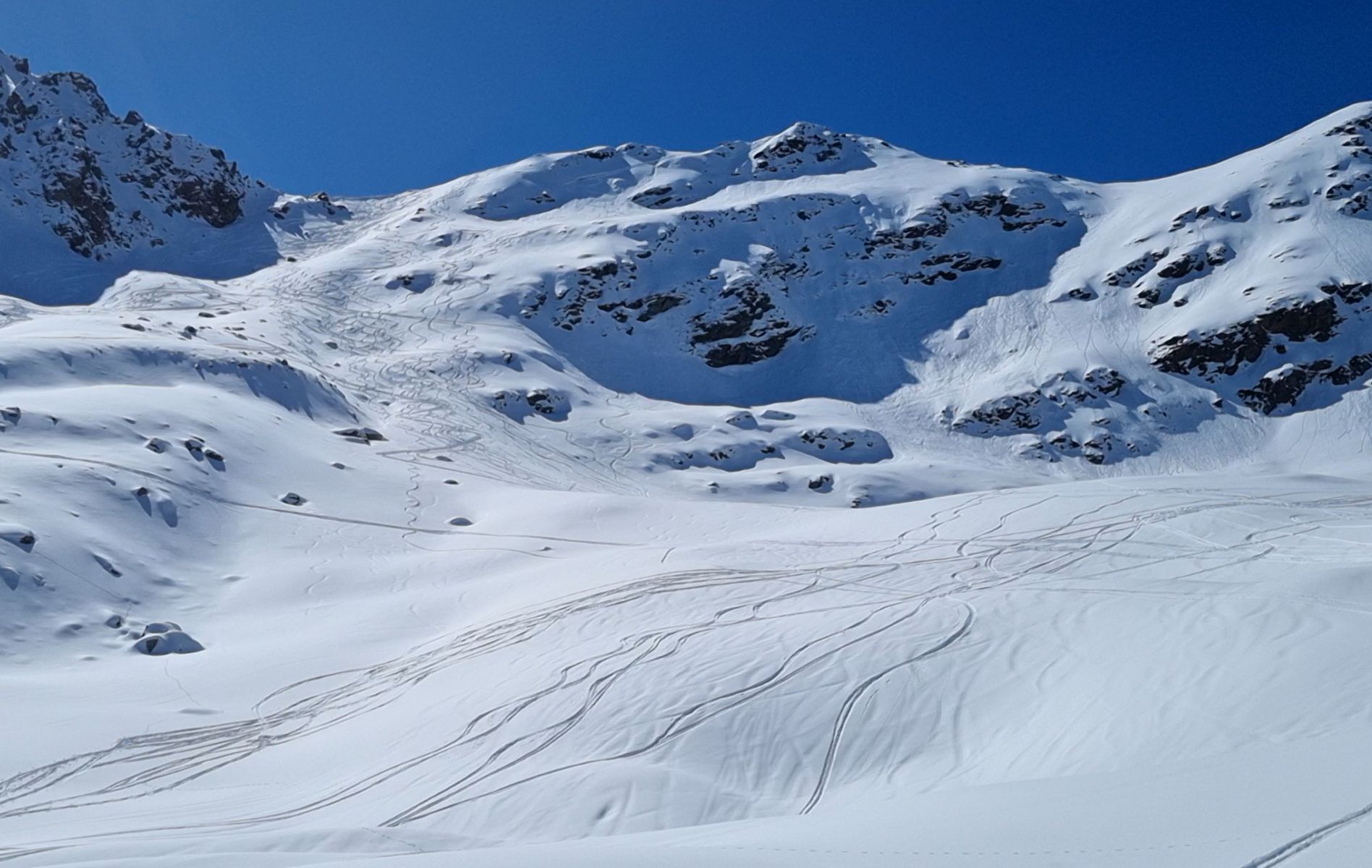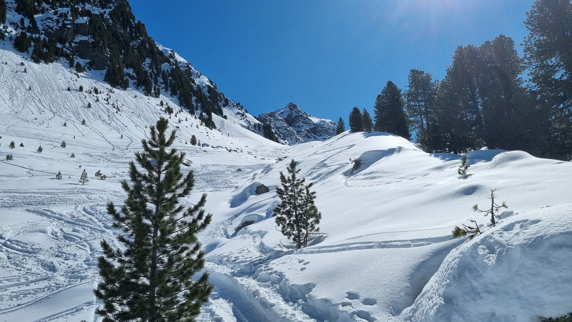 Danach habe ich mich so weit wie möglich rechts gehalten. Im Schattenbereich der Karlesspitzen gab es immer wieder schöne Pulverhänge und eine Menge kurzweiliges Gelände,