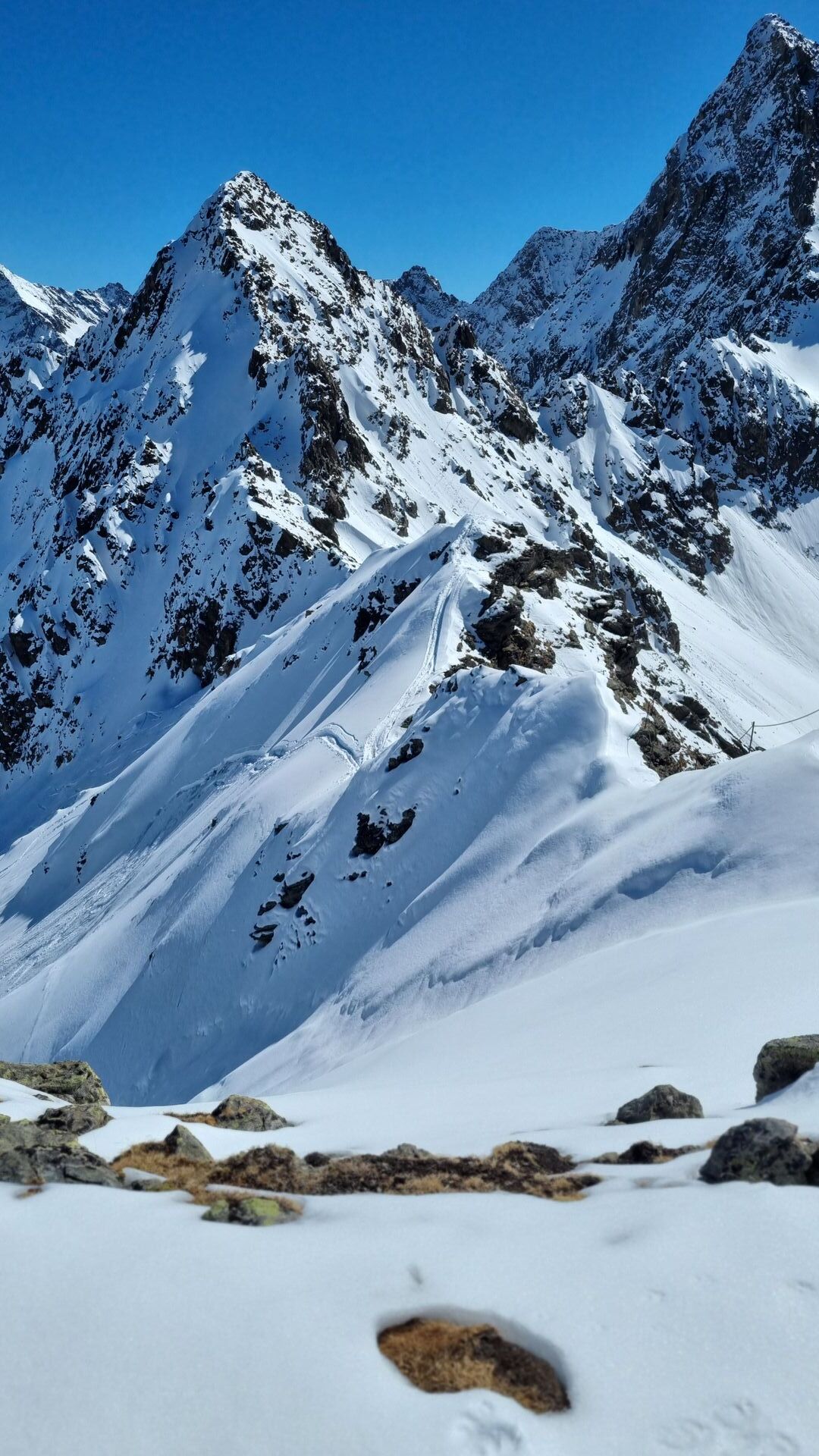 Der Abstieg von der Wörgegratspitze nach Süden sah erstmal unsympatisch aus, aber - zweite Überraschung - es gibt ein praktisches Geländer an der Schnee - Felsengrenze, sodass man die paar kritischen Höhenmeter recht sicher runter kommt.