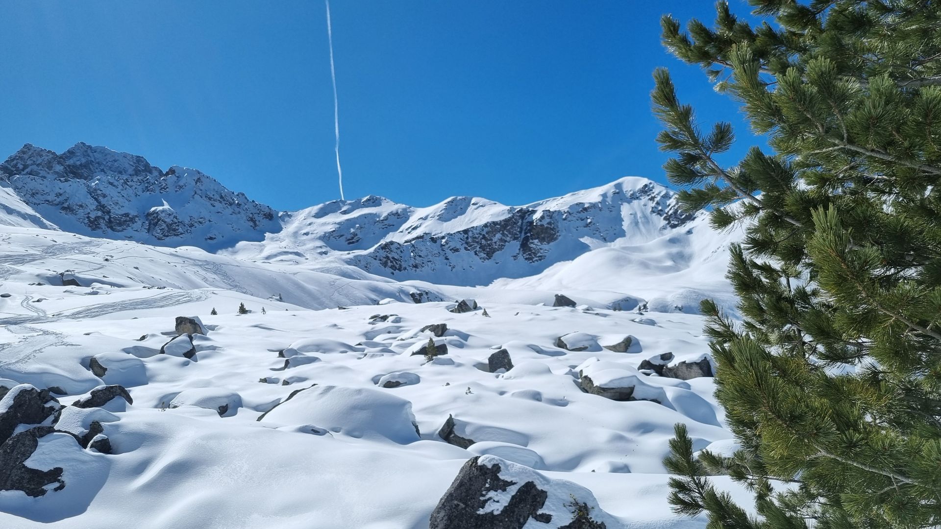 Die drei Gipfel - rechts der Wetterkreuzkogel, links davon das Kleine Windegg, und dann etwas rechts vom Kondensstreifen die Wörgegratspitze. Gesehen von der Abfahrtsroute im Ostteil des Tales. Der Aufstieg war viel näher an der Bergkette.