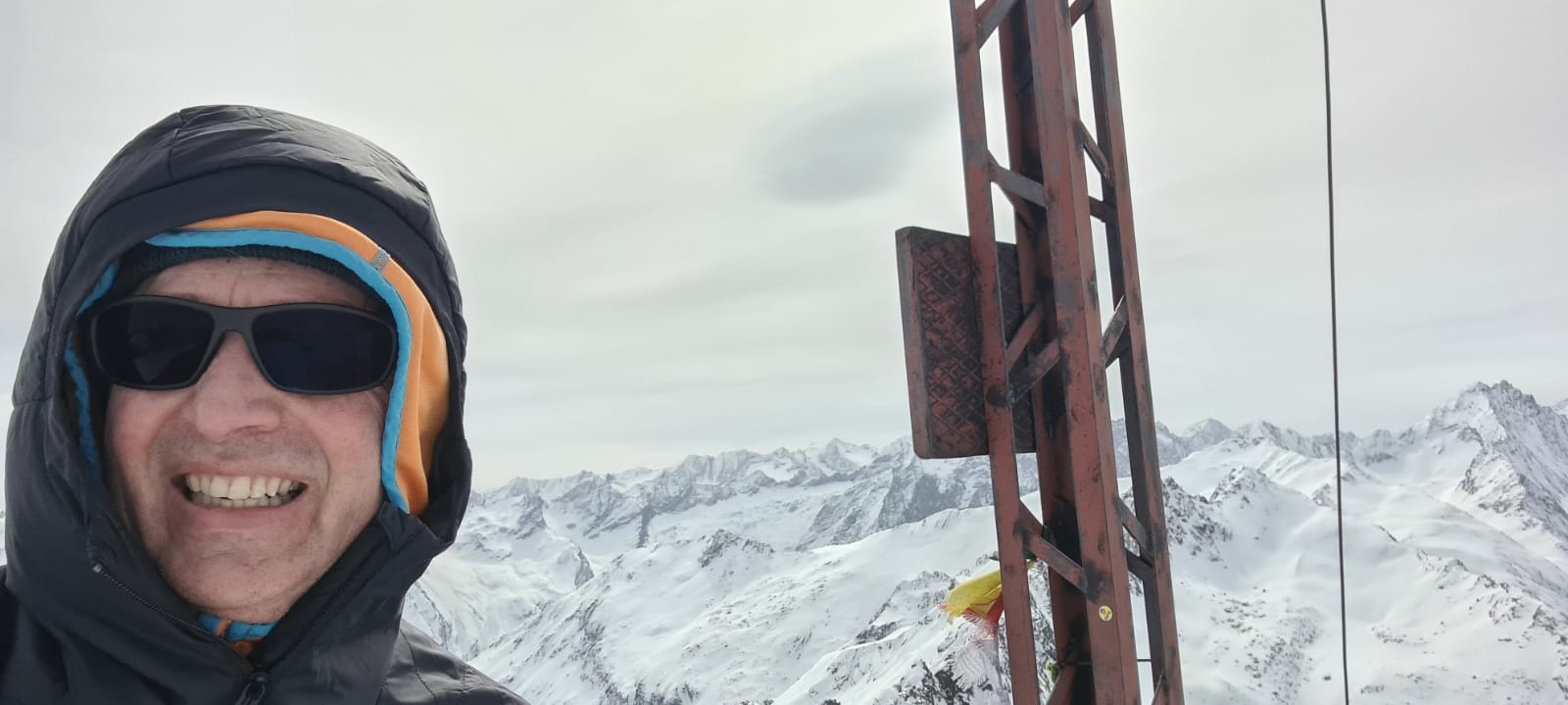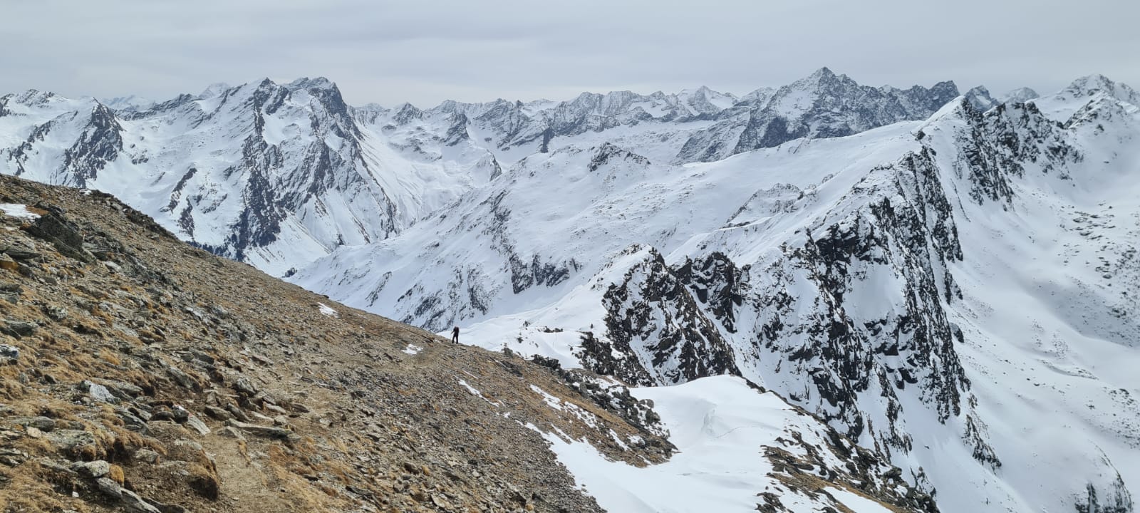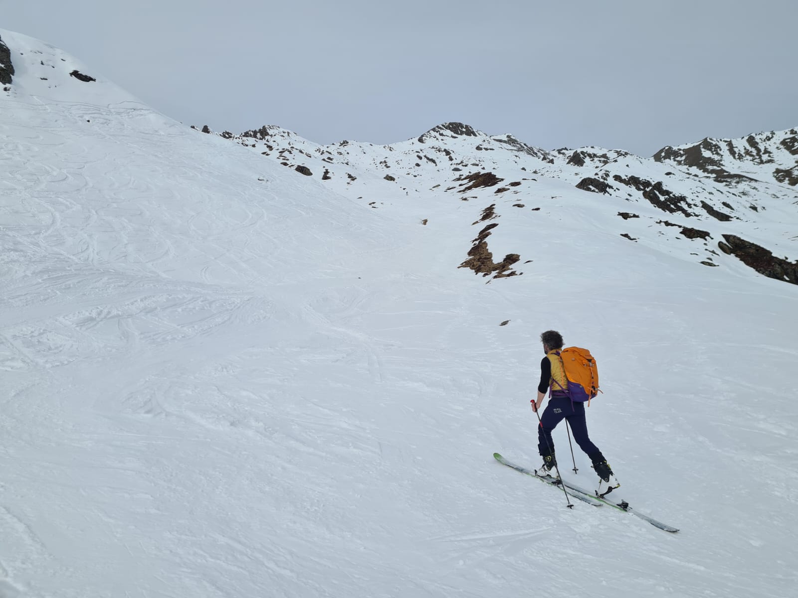 Der Sahara-Staub war früher dran, als angekündigt. Um kurz nach 9 Uhr hat es schon bis zum Inntal zugezogen, dann sehr diesig und diffuse Sicht. Ich habe befürchtet, dass es aufgrund der fehlenden Sonne nicht aufmacht und harschig bleibt. Ab und zu hat sie aber durchgeblinzelt, außerdem war es (bis auf den Gipfelbereich) warm und windstill, so dass es doch relativ weich wurde. Richtiger Firn war das aber noch nicht.
