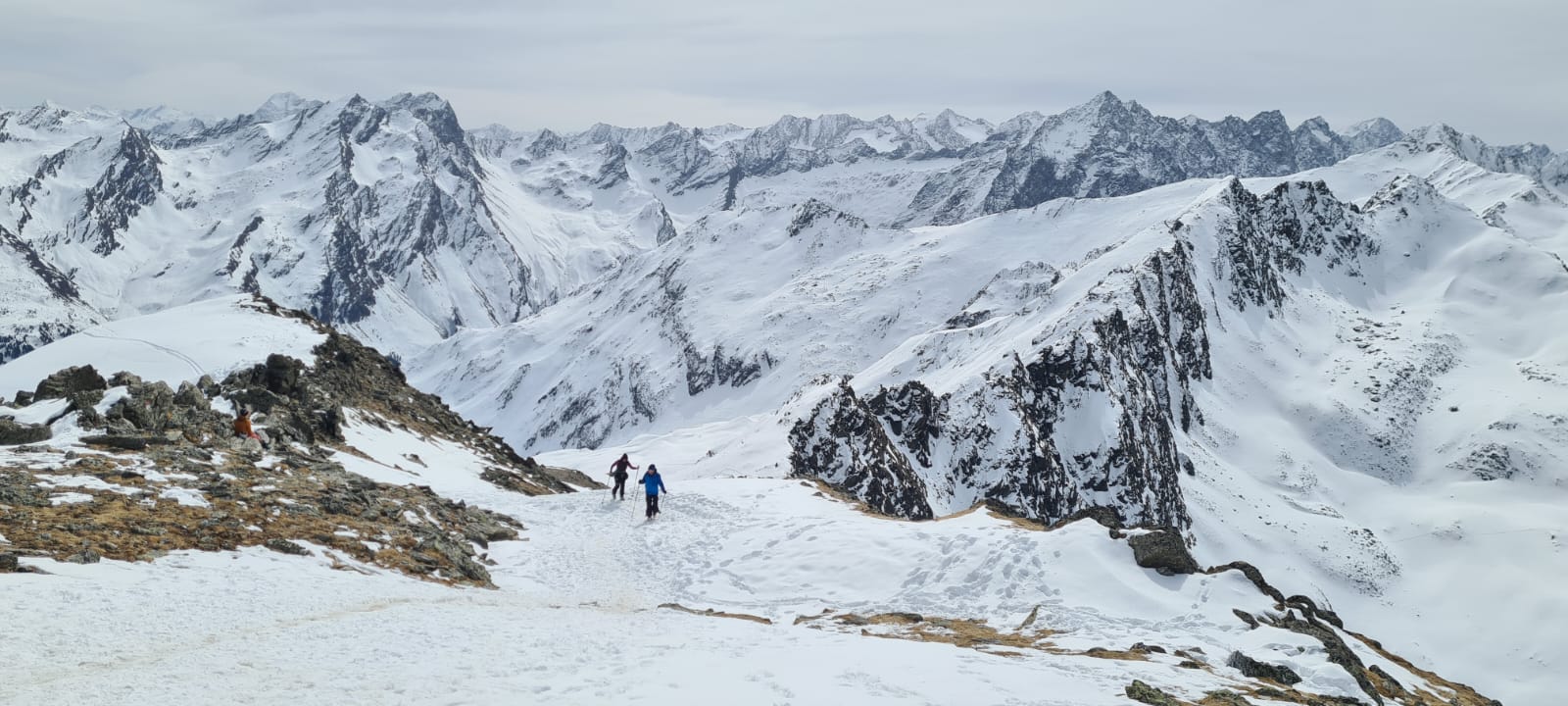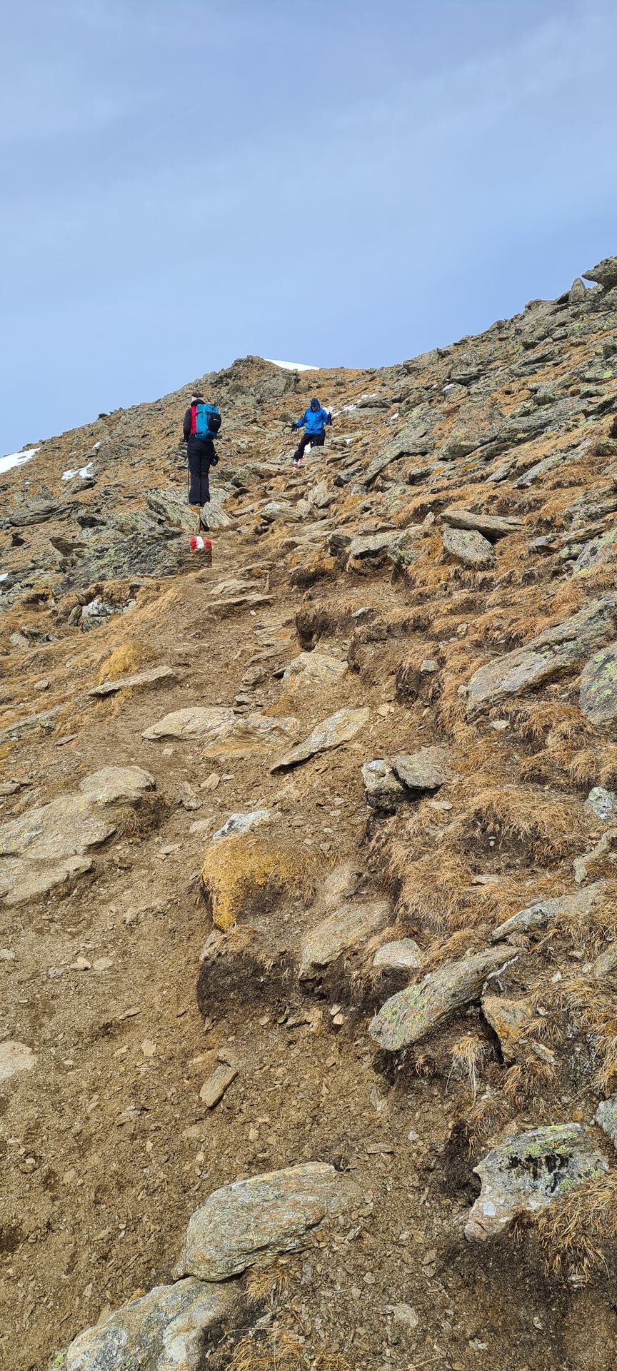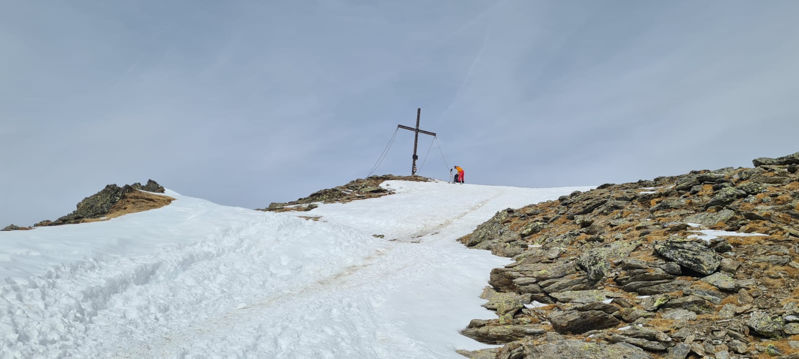 Am Morgen harschig, aber griffig, keine Harscheisen. Ab ca. 2000 m in den schattigen Böschungsbereichen eine Art gepresster Pulver. Gipfelanstieg bis auf wenige Meter schneefrei. Siehe Bild.