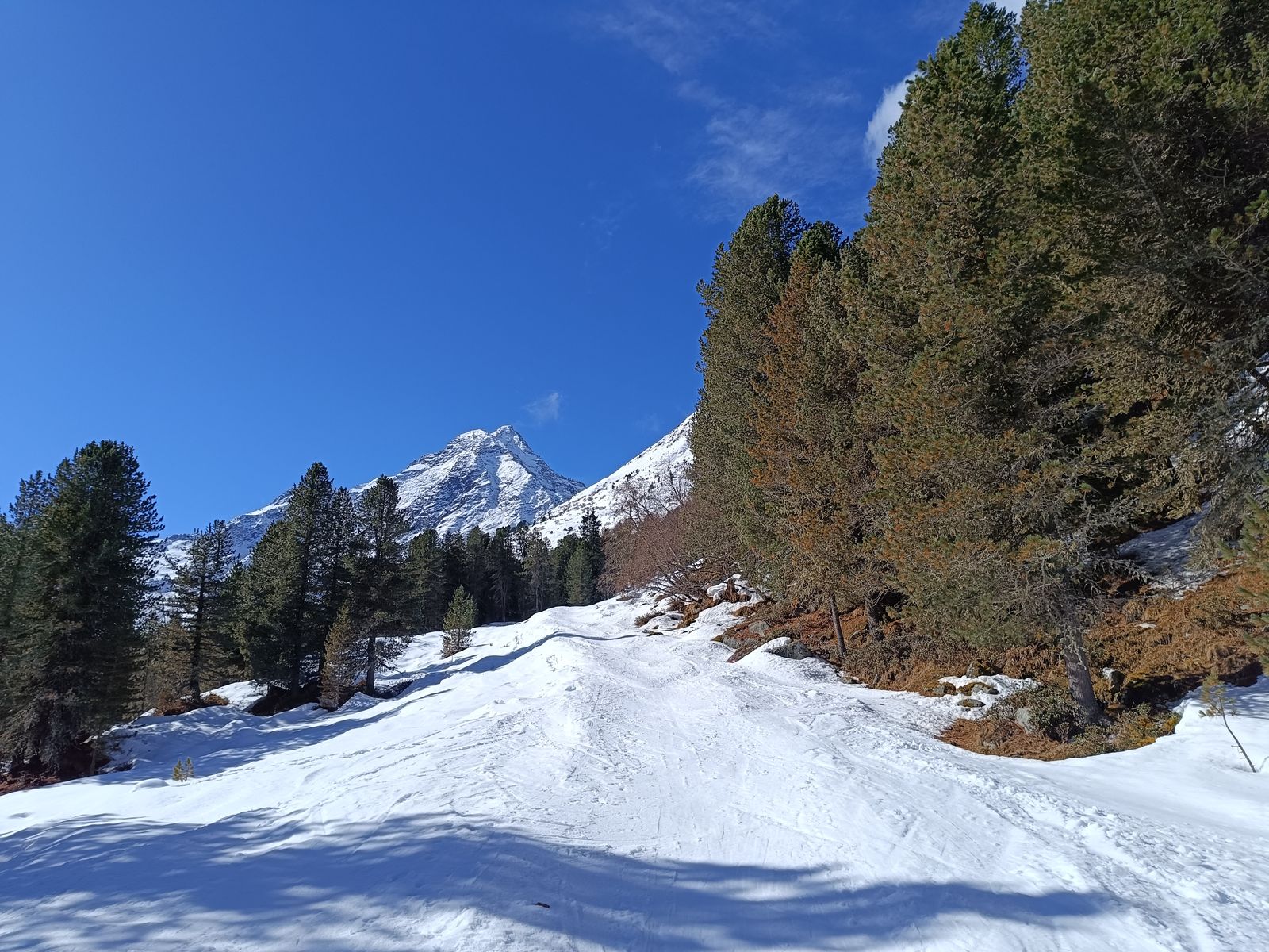 Der Anstieg erfolgte auf der üblichen, ausgeschilderten Route. Hinweis: Auch wenn es da, wo die Route in den Zirbenwald geht, ein kurzes aperes Stück gibt (2 Minuten tragen), ist der Waldaufstieg viel schöner und weniger anstrengend als ein Spitzkehren-Festival durch die steile Schneise, die gerne in der Abfahrt gemacht wird, zu veranstalten.