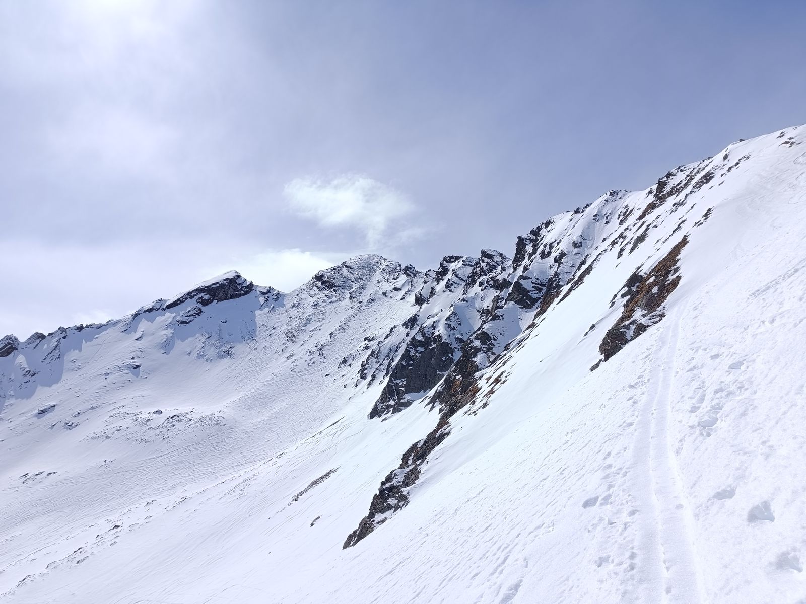 Ich gehe bei dieser Tour fast immer nicht auf den eigentlichen Gipfel, da die letzten 100 Hm stets abgeweht und steinig sind, sondern nehme eine der Scharten rechts davon als Ziel. Die Abfahrt um 12 war so bärig, dass ich an der Waldgrenze nochmals angefellt habe und wieder hoch bin. Zweite Abfahrt um 14 Uhr war identisch fein. Die steile Schneise ins Tal hat sehr viel Schnee und fährt sich zurzeit Klasse. Los war für Sonntag und tolles Wetter im Grunde gar nichts (vielleicht 15 Leute).