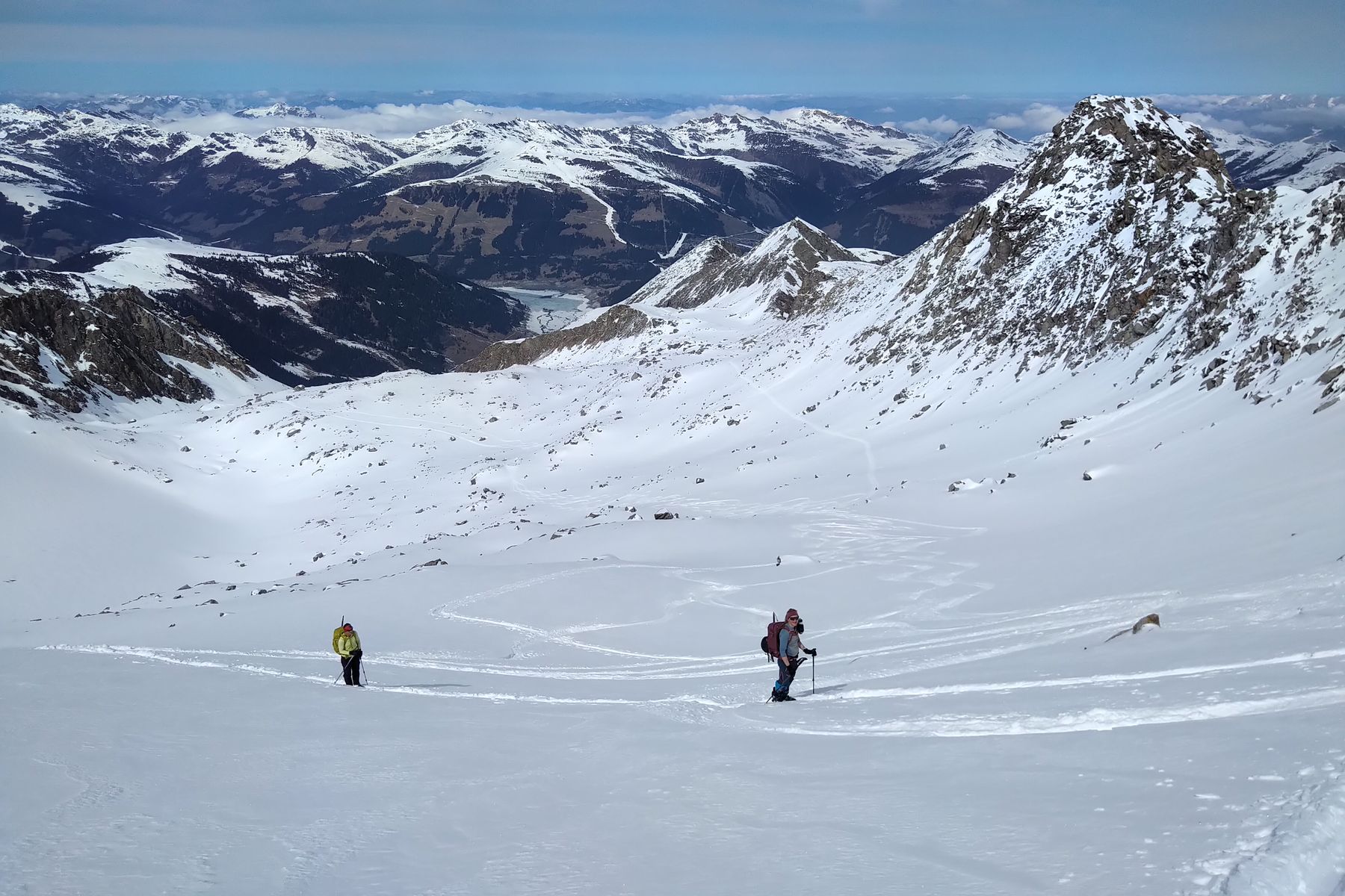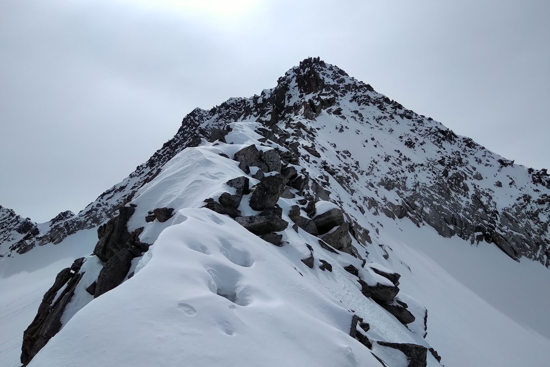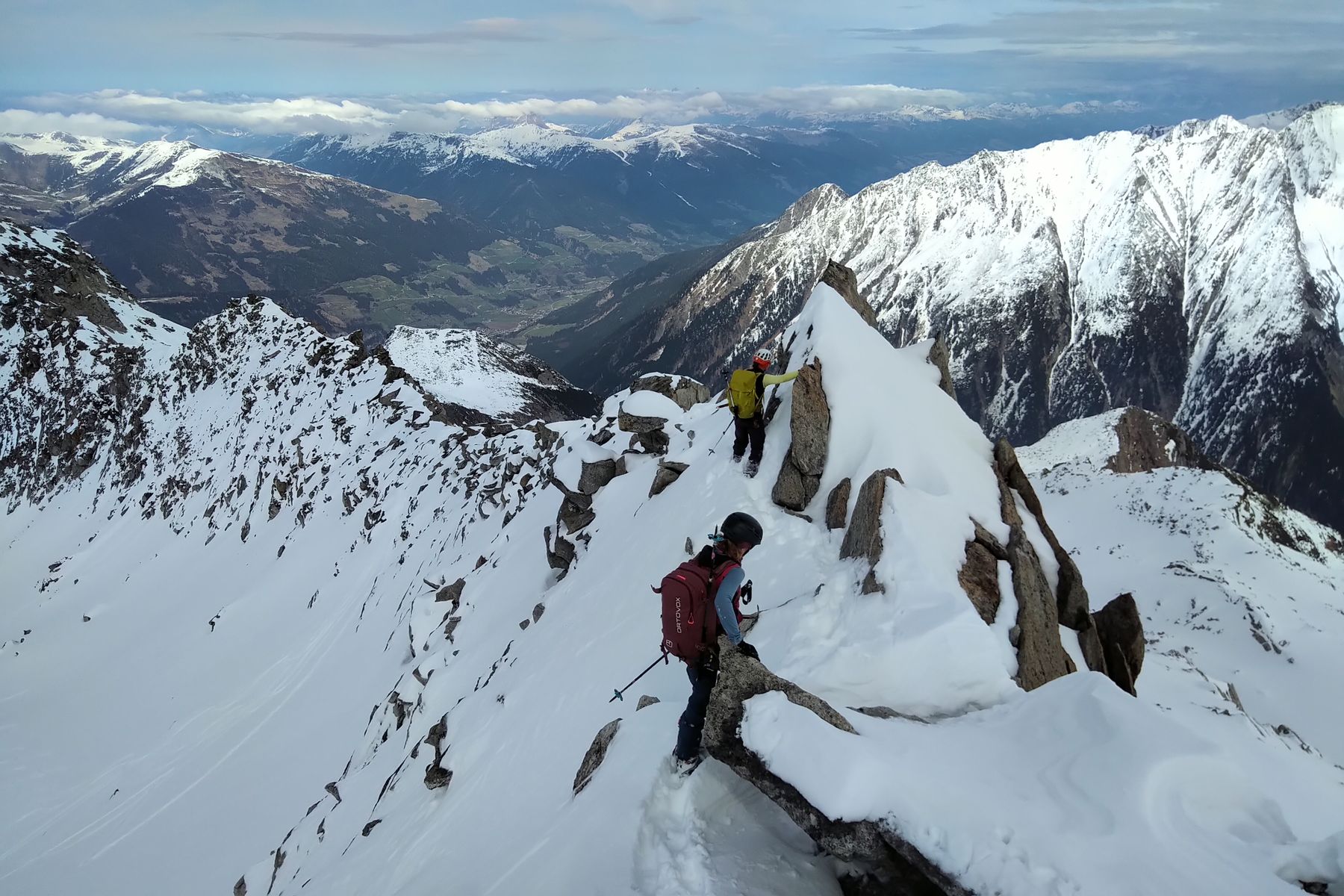 Wir haben dafür den halben Gipfelgrat eingespurt. Das hat allerdings ziemlich viel Zeit gekostet, daher sind wir ungefähr auf der Hälfte umgedreht. Wenn man direkt auf dem Grat bleibt, gibt es Kraxel-Stellen bis SG 2.