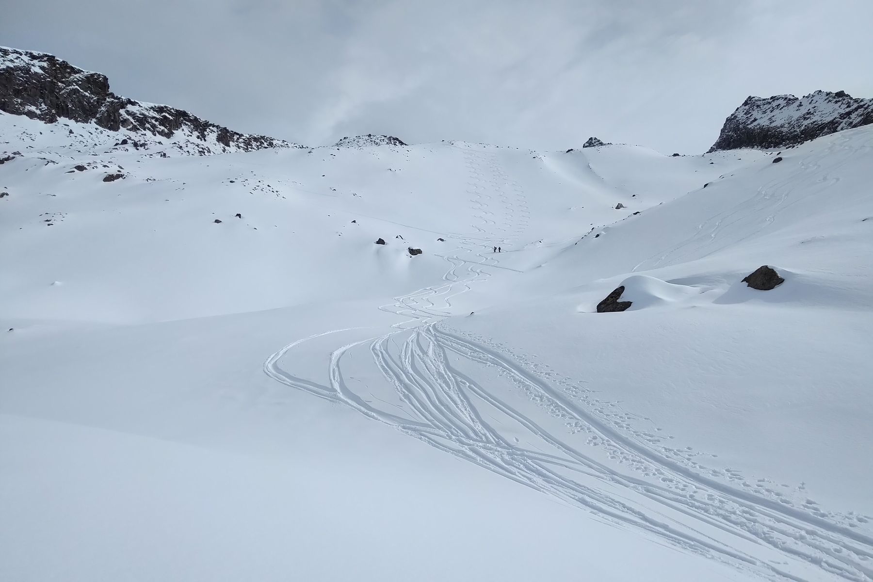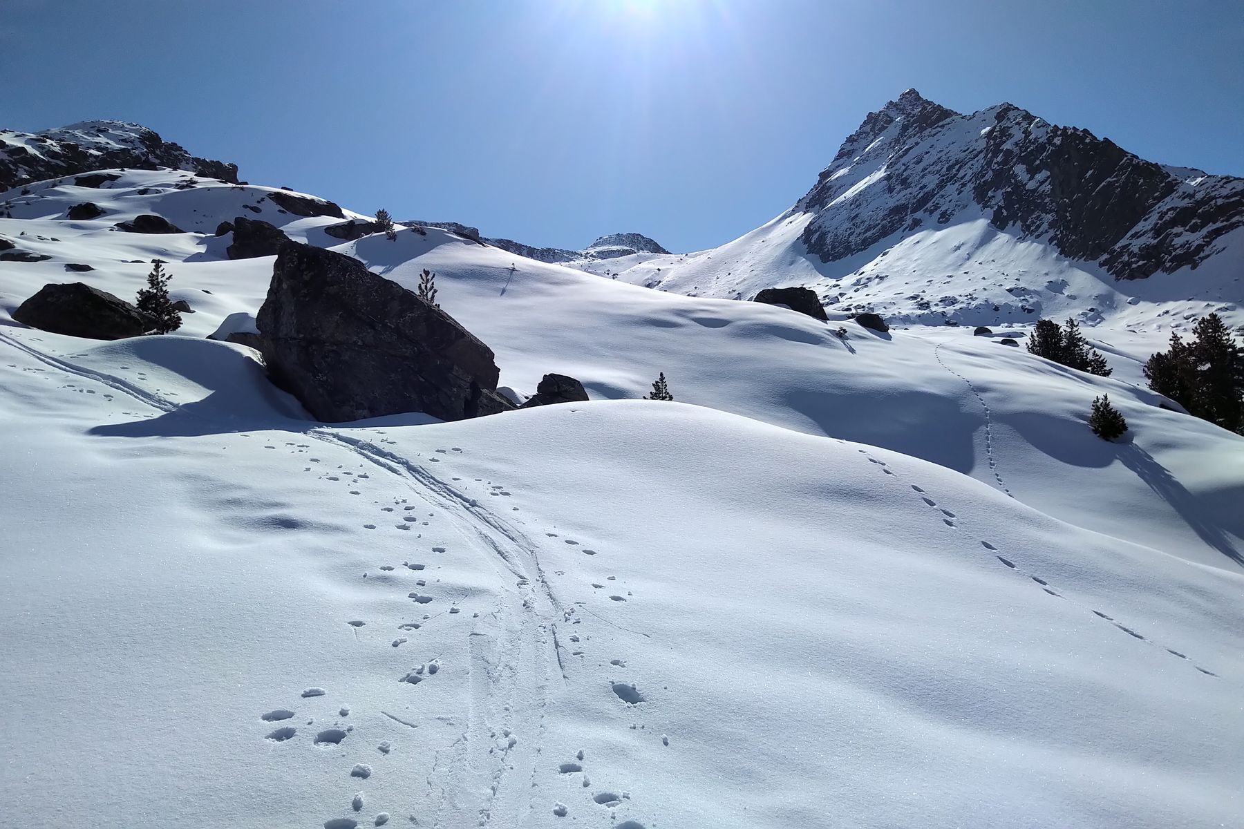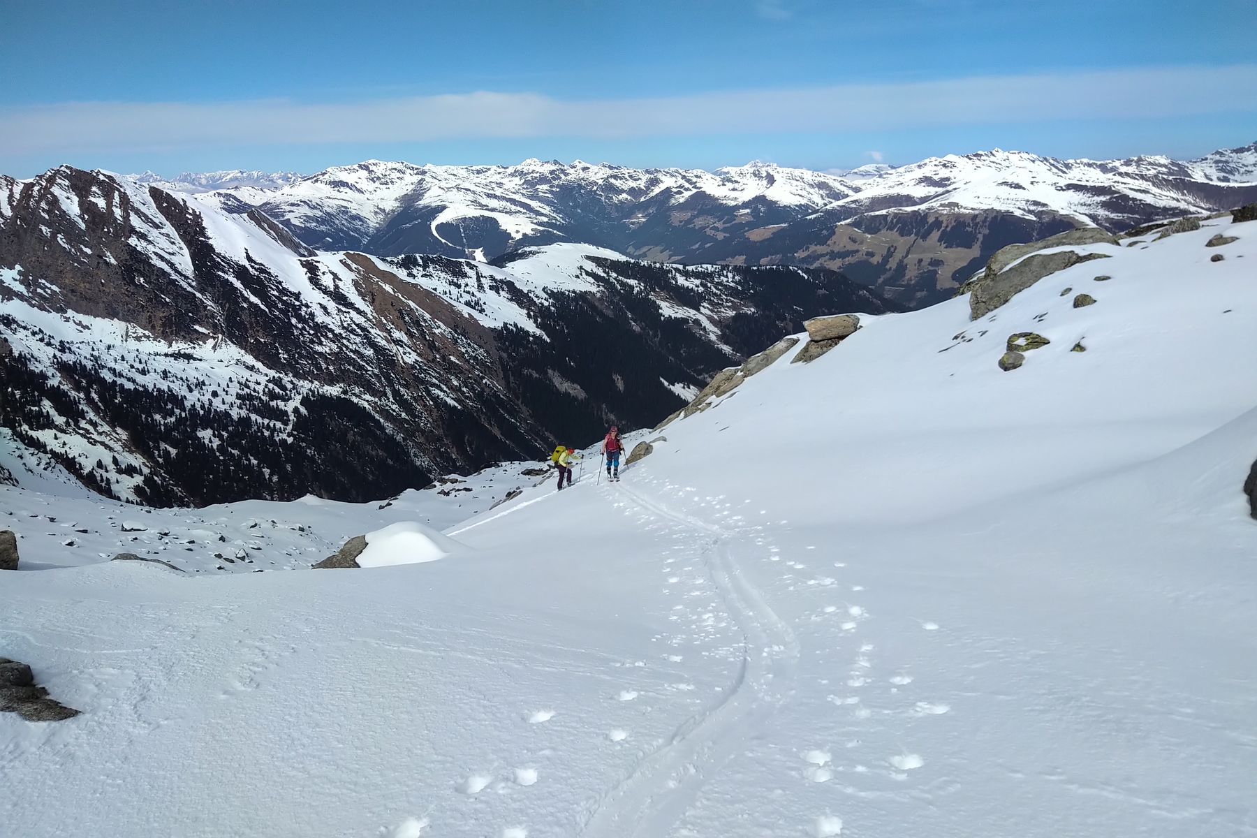Wir haben dafür den halben Gipfelgrat eingespurt. Das hat allerdings ziemlich viel Zeit gekostet, daher sind wir ungefähr auf der Hälfte umgedreht. Wenn man direkt auf dem Grat bleibt, gibt es Kraxel-Stellen bis SG 2.
