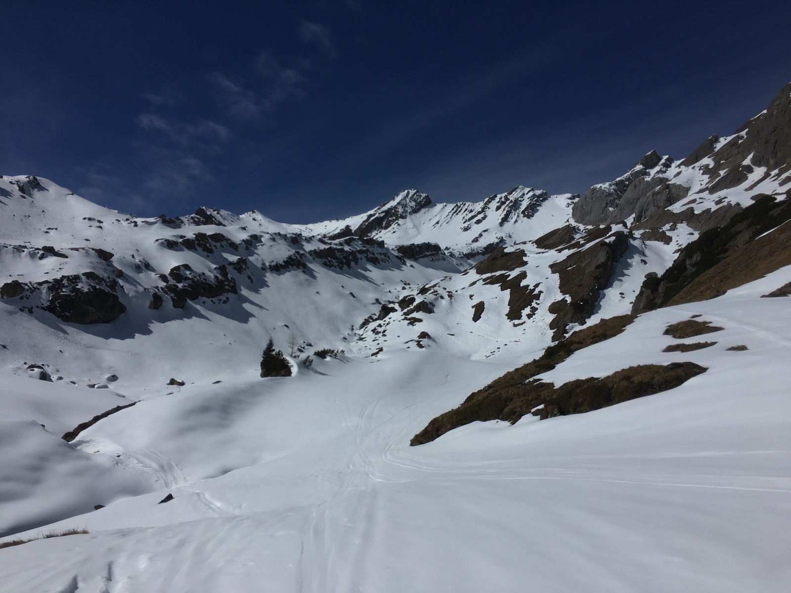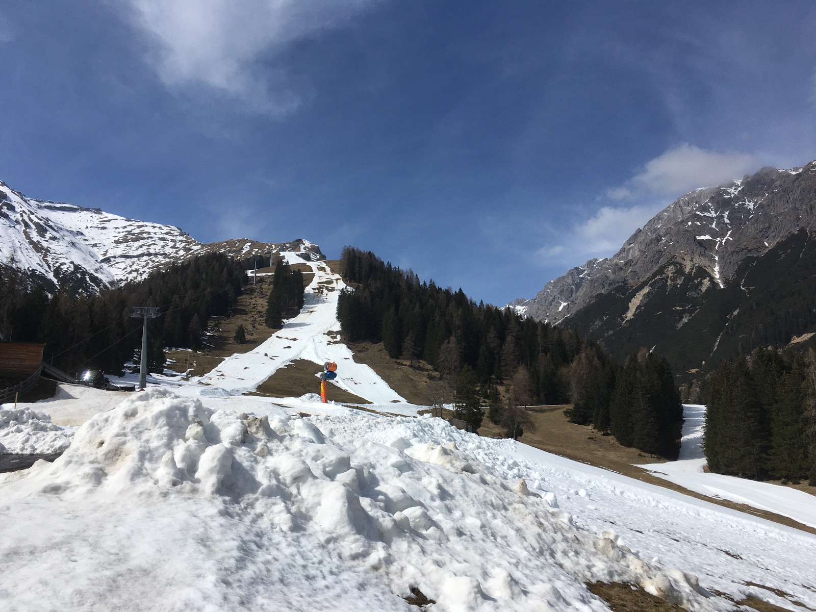 Richtung Scharnitzsattel ist der Hang nach dem Skigebiet schon recht aper. Rotkopf wurde zuletzt wohl auch gemacht.