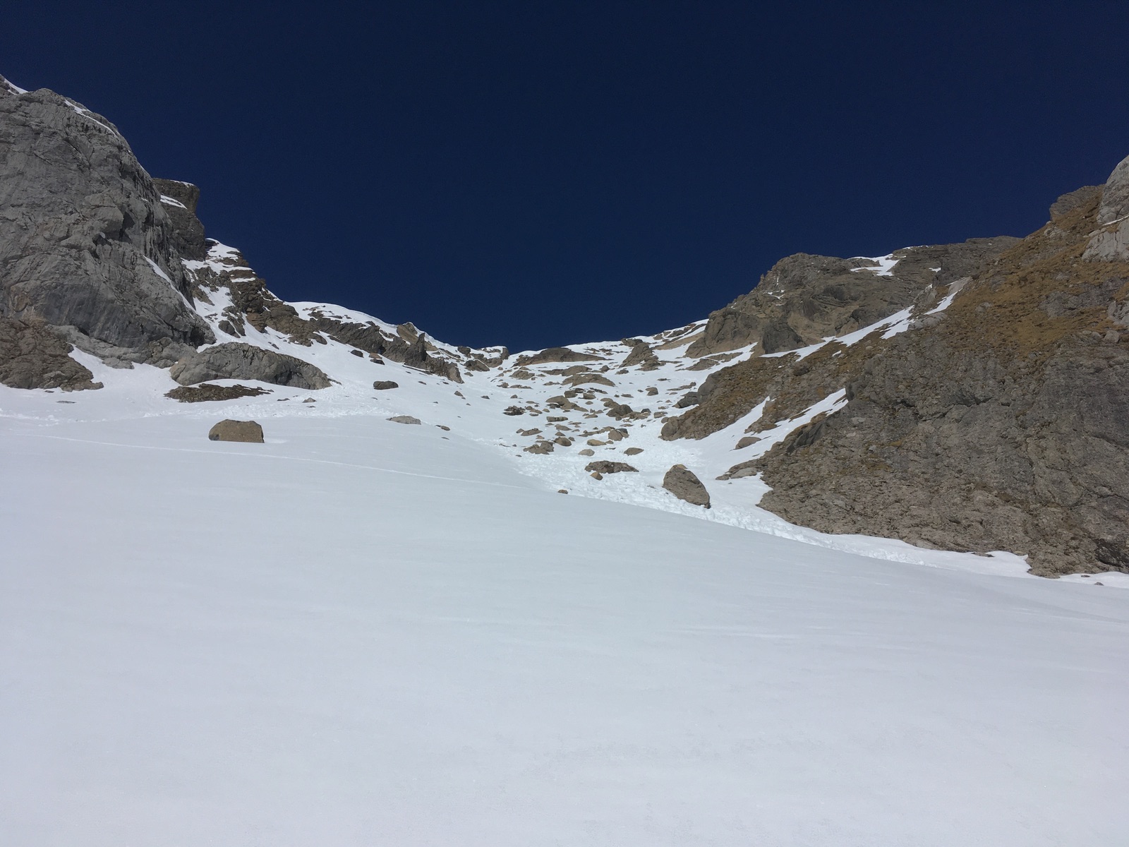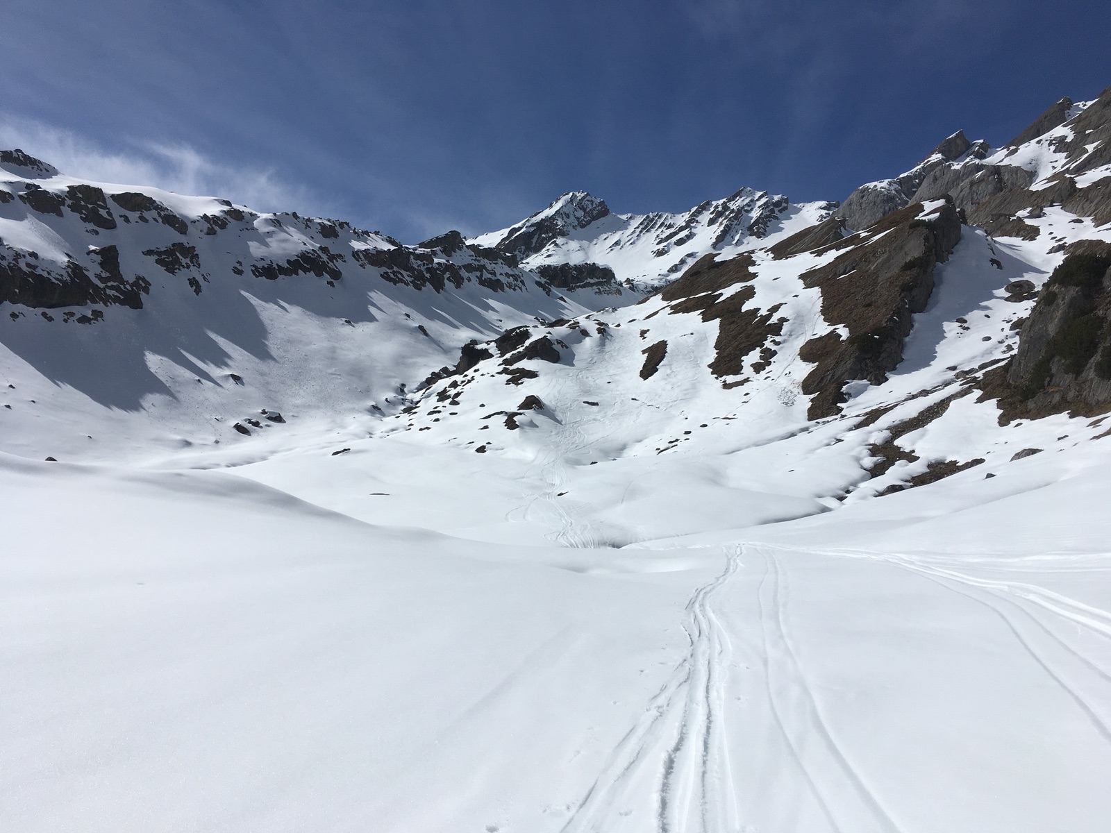 Abfahrt über schöne Firnhänge - je flacher, desto besser war der Schnee: