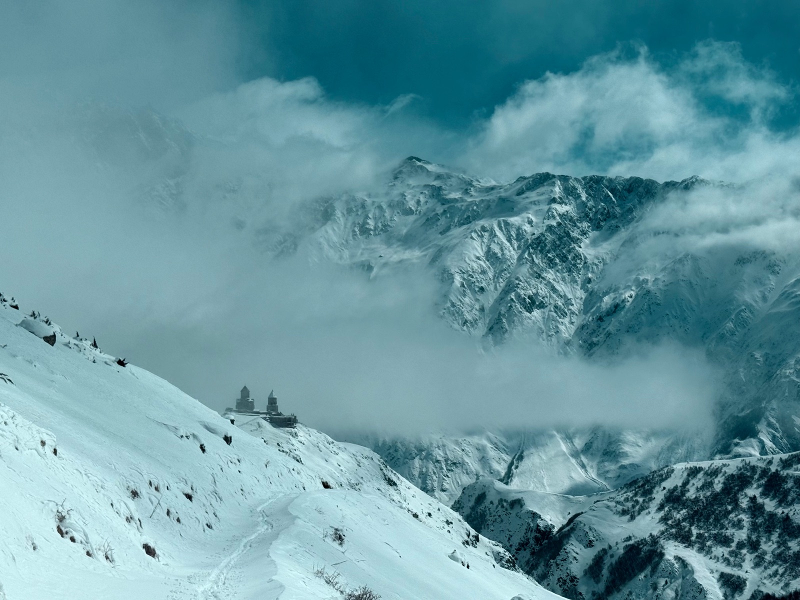 Der Aufstieg von Stepantsminda führt vorbei an der berühmten Gergetier Dreifaltigkeitskirche, die unbedingt besucht werden sollte. Man kann auch mit dem Taxi bis zu der Kirche fahren und dort den Aufstieg starten.