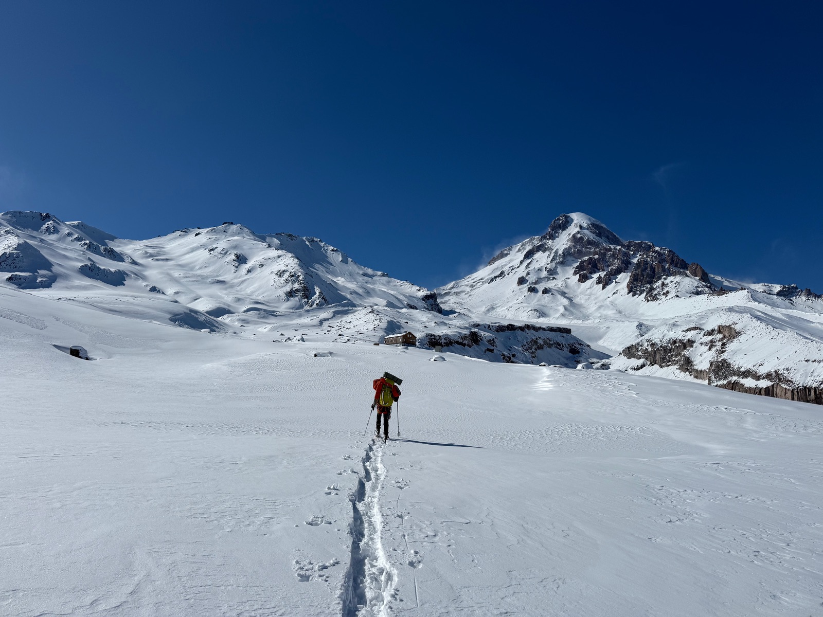 Rund um die Altihut erstreckt sich ein sehr ergiebiges Tourengebiet, das bei unserer Ankunft in seiner jungfräulichen Schönheit entdeckt werden wollte. Westlich des Kesi mit seiner markanten Felsnadel warteten südseitige, windgeschützte Genuss-Firnhänge aus denen man sich schöne Touren beliebiger Länge zusammenbasteln kann. Um den Weg Richtung Kazbek weiter auszukundschaften, bieten sich auch der Ortsveri oder der Spartak als vergletscherte Gipfelziele an. Wir haben den Aufstieg dahin auch genutzt um einen Teil unseres Gepäcks gleich auf der Bethlemi Hut zu deponieren.