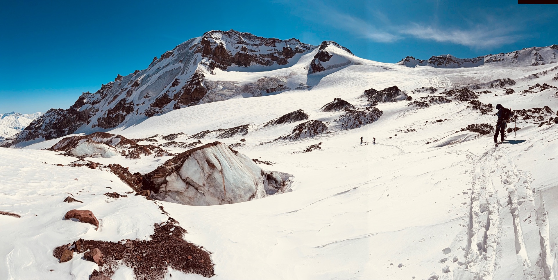 Kurz vor der Altihut (Mitte). Links davon in der breiten Mulde die schönen Firnhänge hoch zum Kesi, rechts davon der Aufstieg weiter über den Geregeti-Gletscher zum Kazbek.