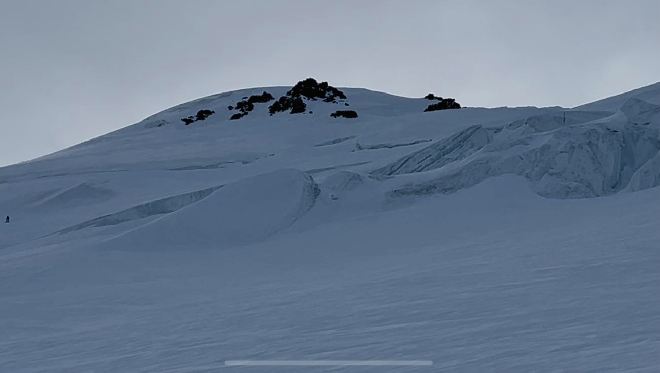 Der riesige Gipfelhang auf russischem Grund mit den erwähnten Gletscherbrüchen.