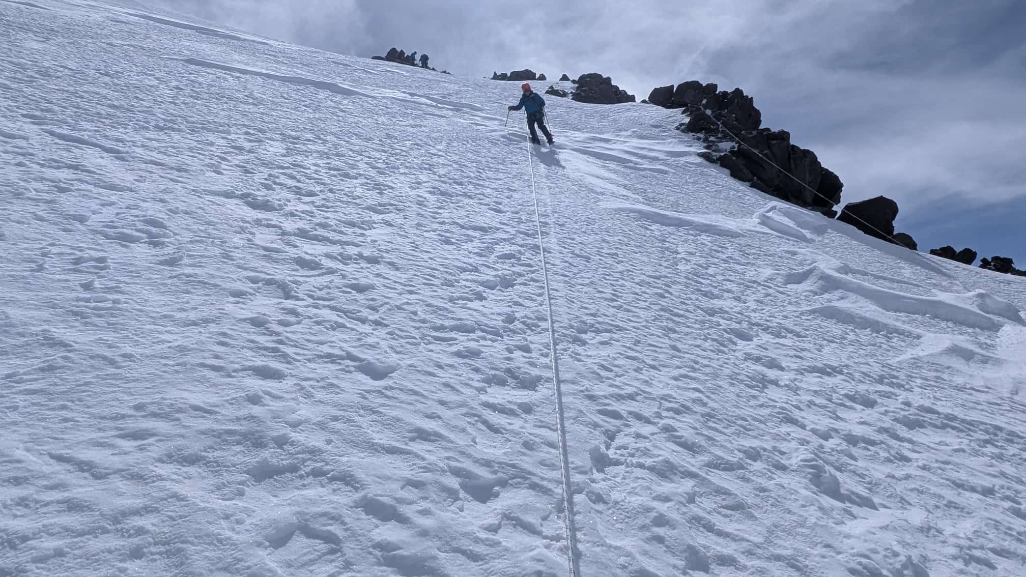 Der finale, oft vereiste Gipfelaufstieg mit Sicherung durch Fixseil.