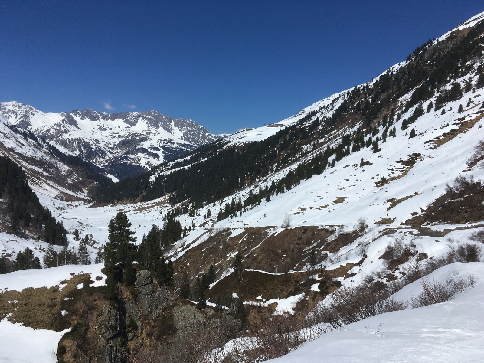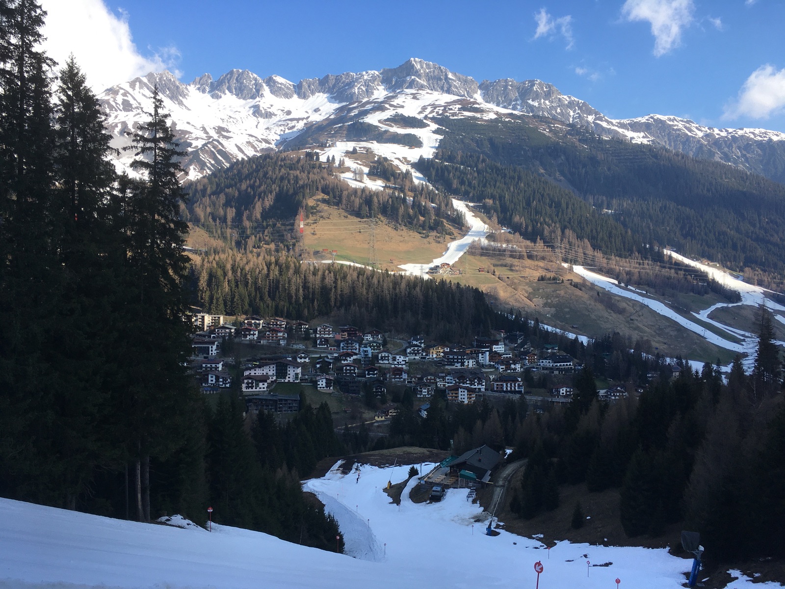 Die Südhänge sind auch in St. Anton schon weit hinauf aper abseits der beschneiten Pisten: