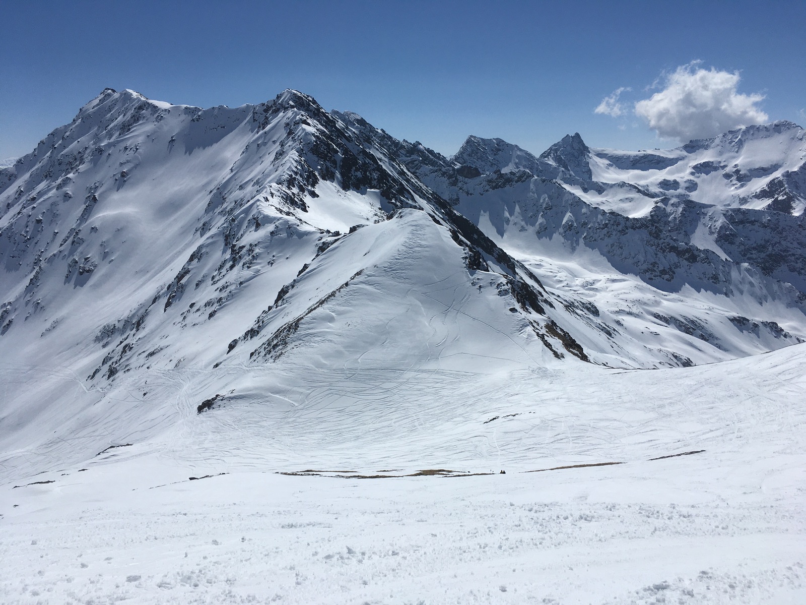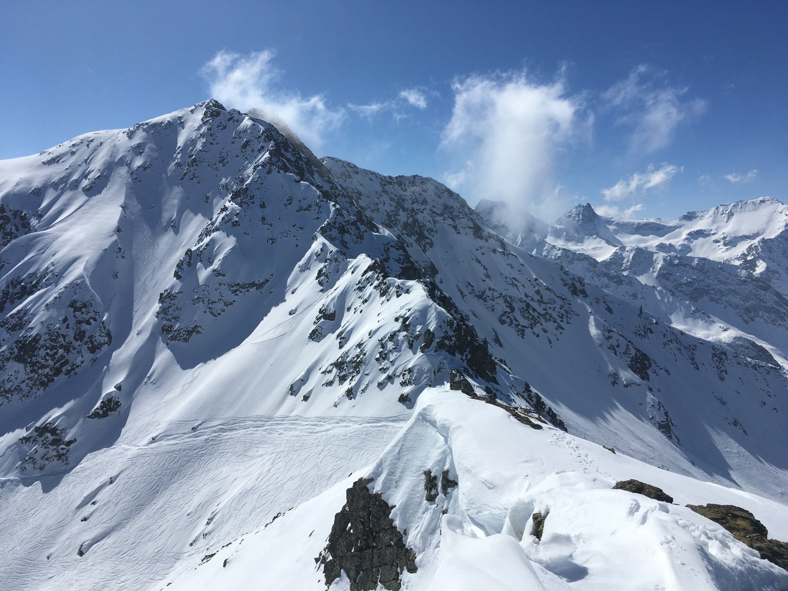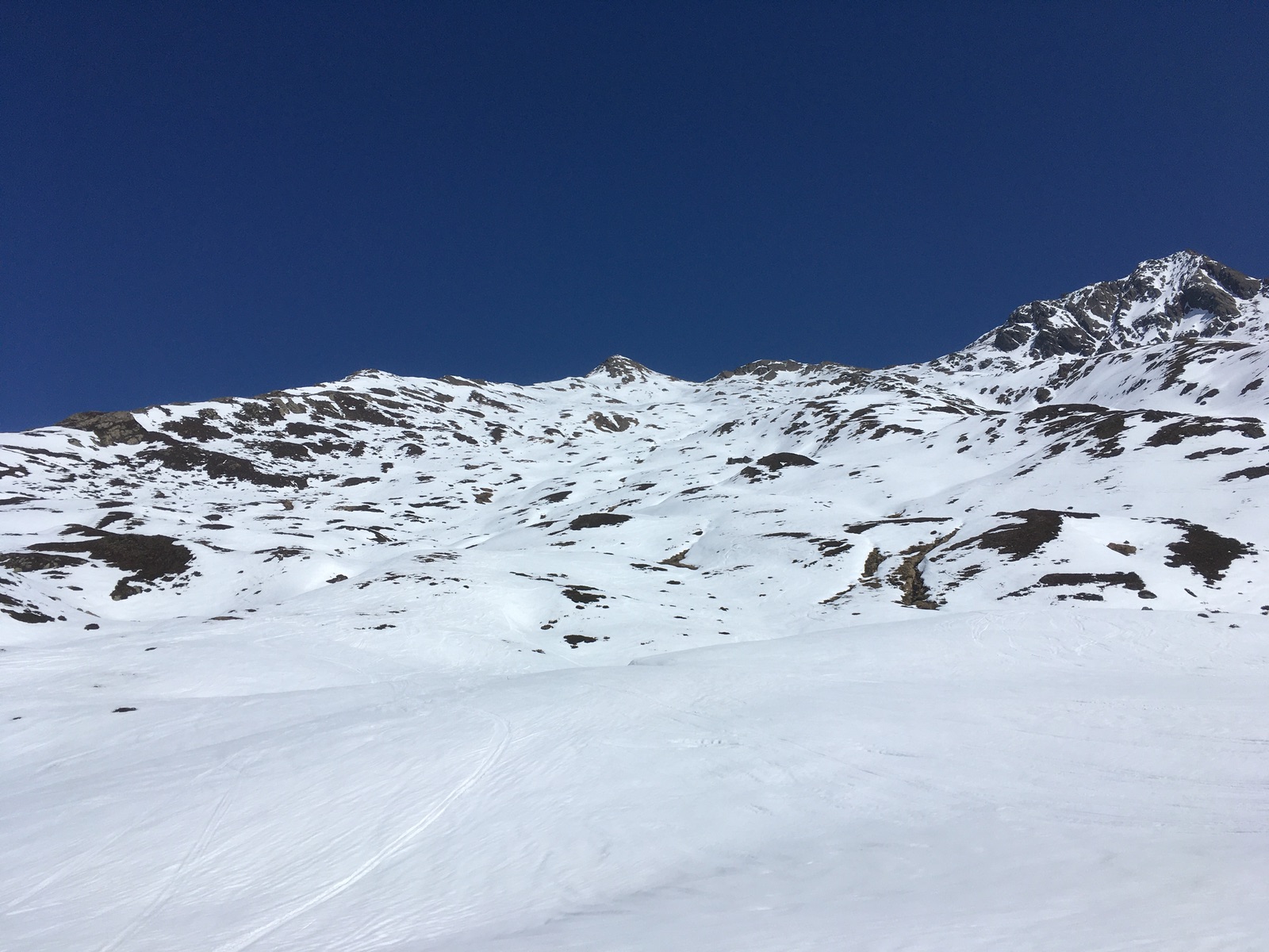 Beginn der Skiabfahrt - entweder links ins Malfontal oder rechts nach der Scharte hinab ins Moosbachtal: