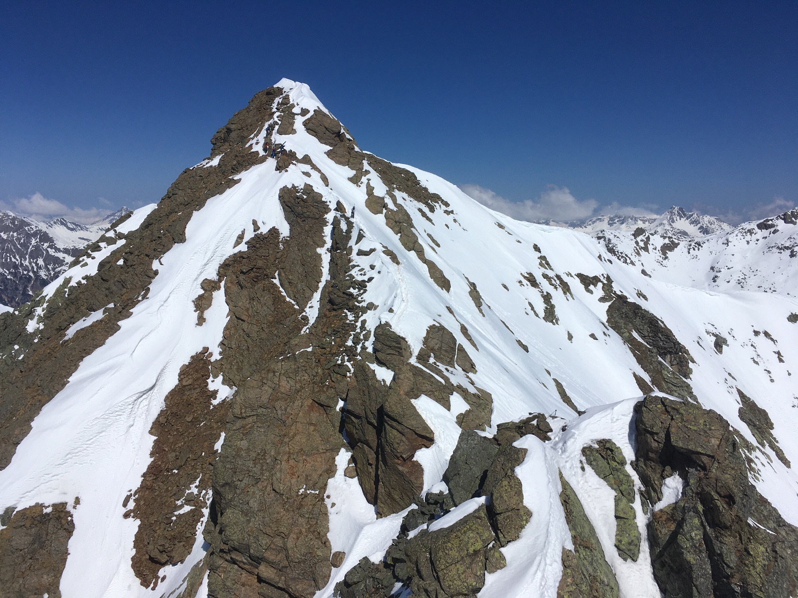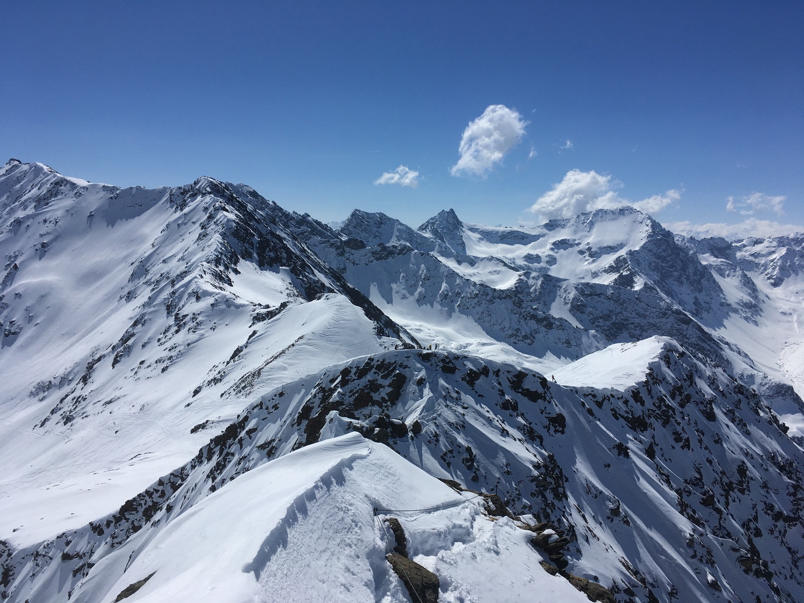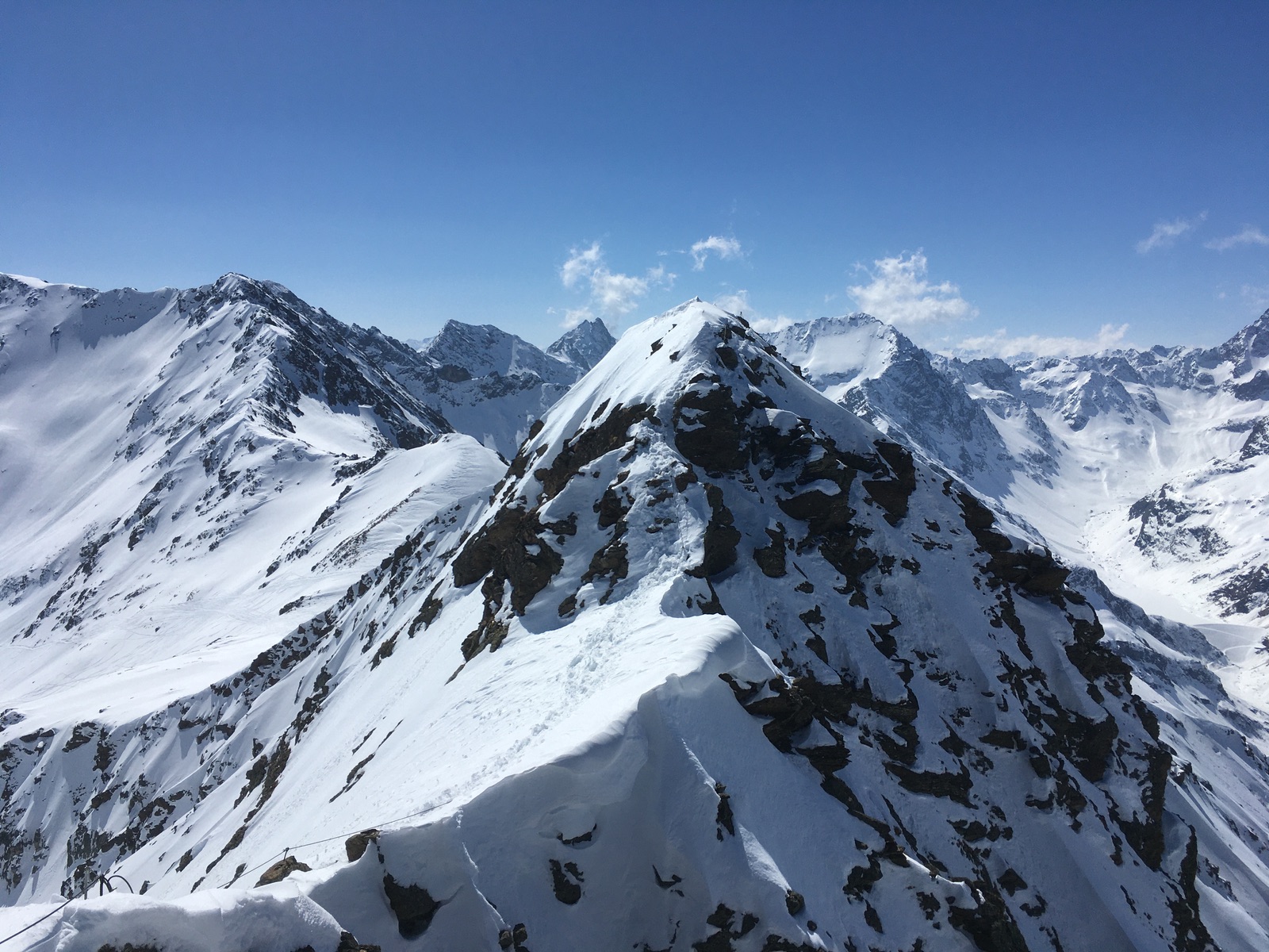Beginn der Skiabfahrt - entweder links ins Malfontal oder rechts nach der Scharte hinab ins Moosbachtal: