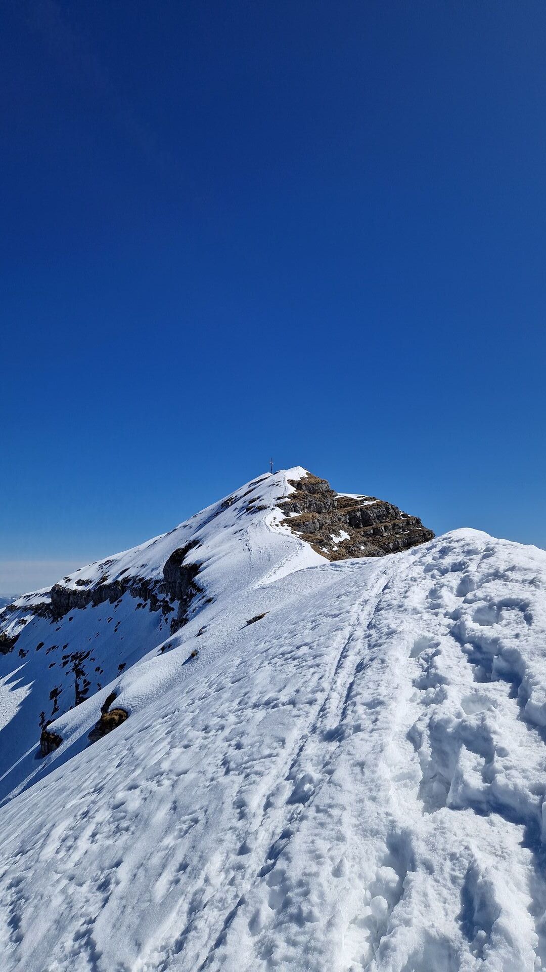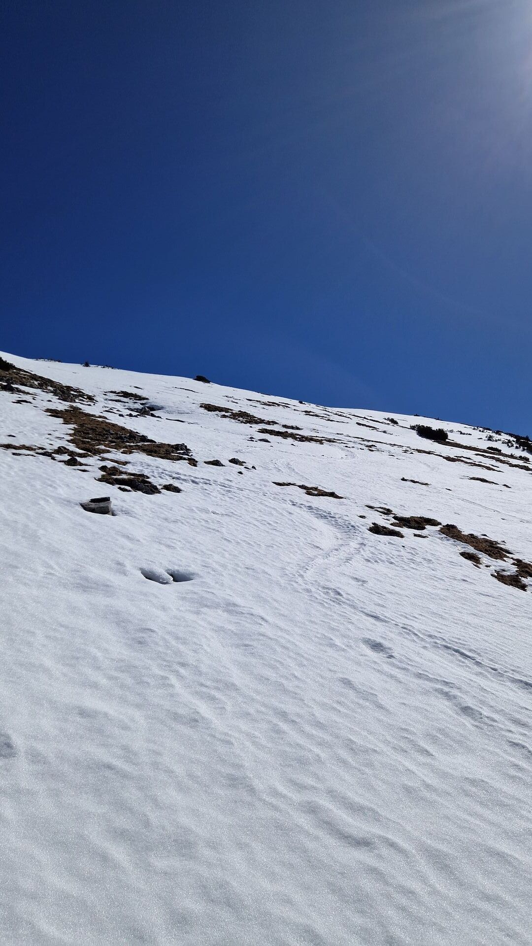 Ich bin um 12:30 abgefahren, was (wie vermutet, aber später konnte ich nicht) gefühlt noch eine gute Stunde zu früh war. Aber wenn man den richtigen Zeitpunkt erwischt, lassen sich dort in den nächsten Tagen noch ein paar traumhafte Firnabfahrten machen. Überlaufen ist er gerade auch nicht, ich hatte den Berg für mich allein.