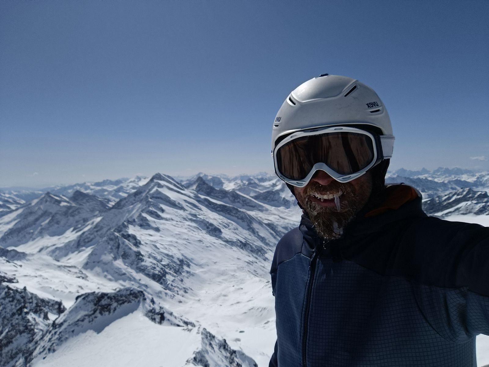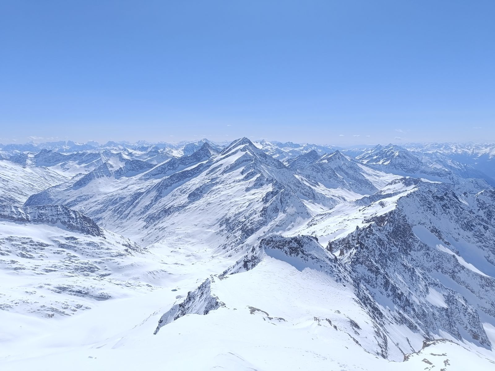 Nun ging es auf der richtigen Route hoch. Landschaftlich unglaublich beeindruckend und heute total einsam; niemand unterwegs. Die Dreiherrenspitze ist aber so ein klassischer Täuscher, was die Distanzen angeht. Als ich die Schlüsselstelle gesehen habe, dachte ich "in einer Stunde bin ich dort". Dauert aber eher zwei: Noch ein Buckel, noch ein Flachstück etc. Als ich am oberen Ende des Gletschers (bei 3150m) war, hab ich mich für "leicht und schnell" entschieden und Skier sowie Rucksack liegen lassen und bin nur mit Steigeisen, Pickel und einem Stock los, weil mir der Augenschein sagte, dass es oberhalb der steilen Rinne, die nicht mit Skiern machbar ist, keinen guten Schnee haben würde. Das war freilich ein bisserl gepokert, aber ich hatte Recht: Harter Schnee und perfekt zum Stapfen. Hoch eine knappe Stunde und runter 20 Minuten - schneller ist man Ski (+ zweifachem Umsteigen auf Steigeisen) auch nicht. Das war so richtig geil heute; ich bin bei dem grandiosen Panorama in eine regelrechte Euphorie gekommen.