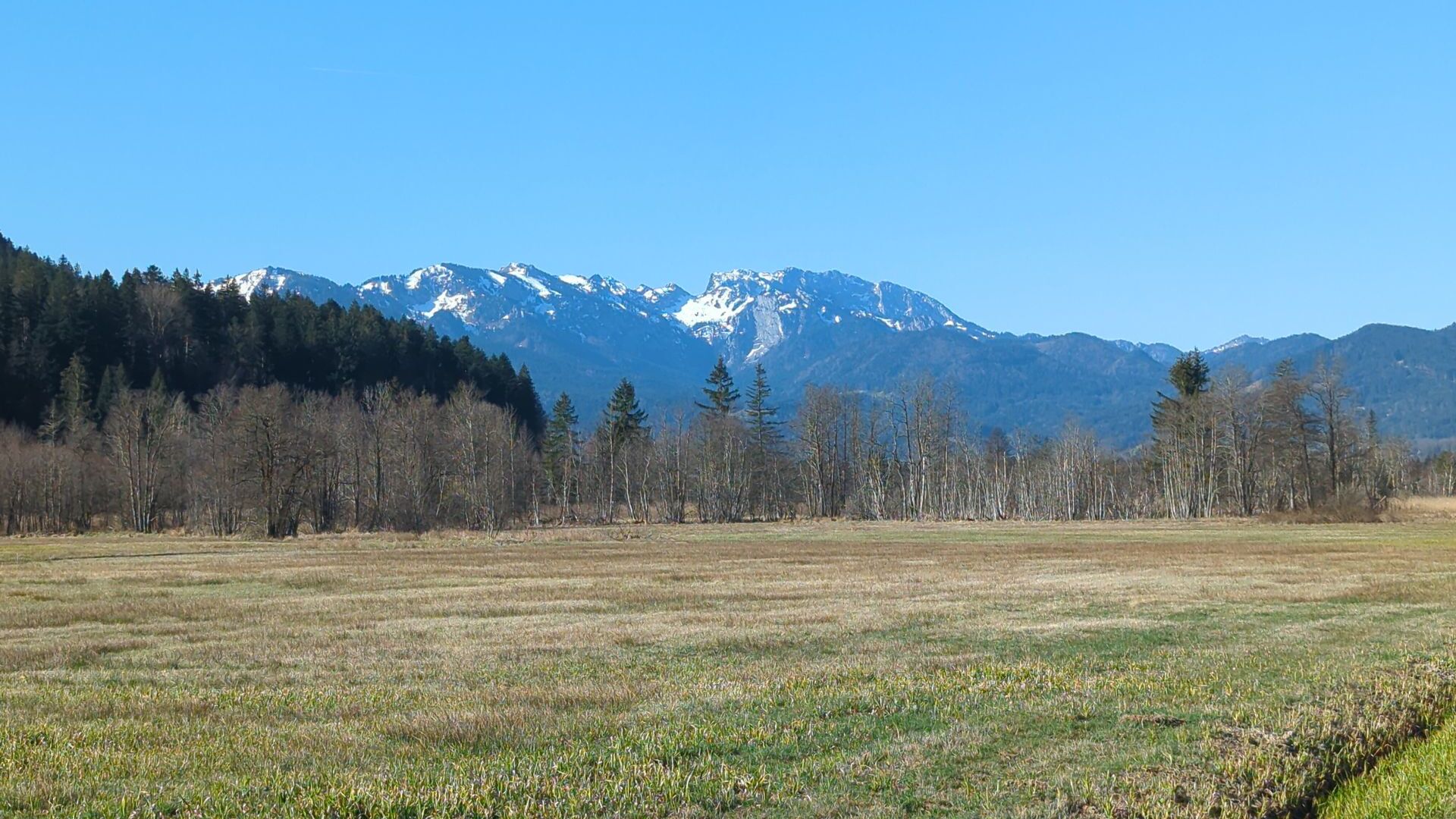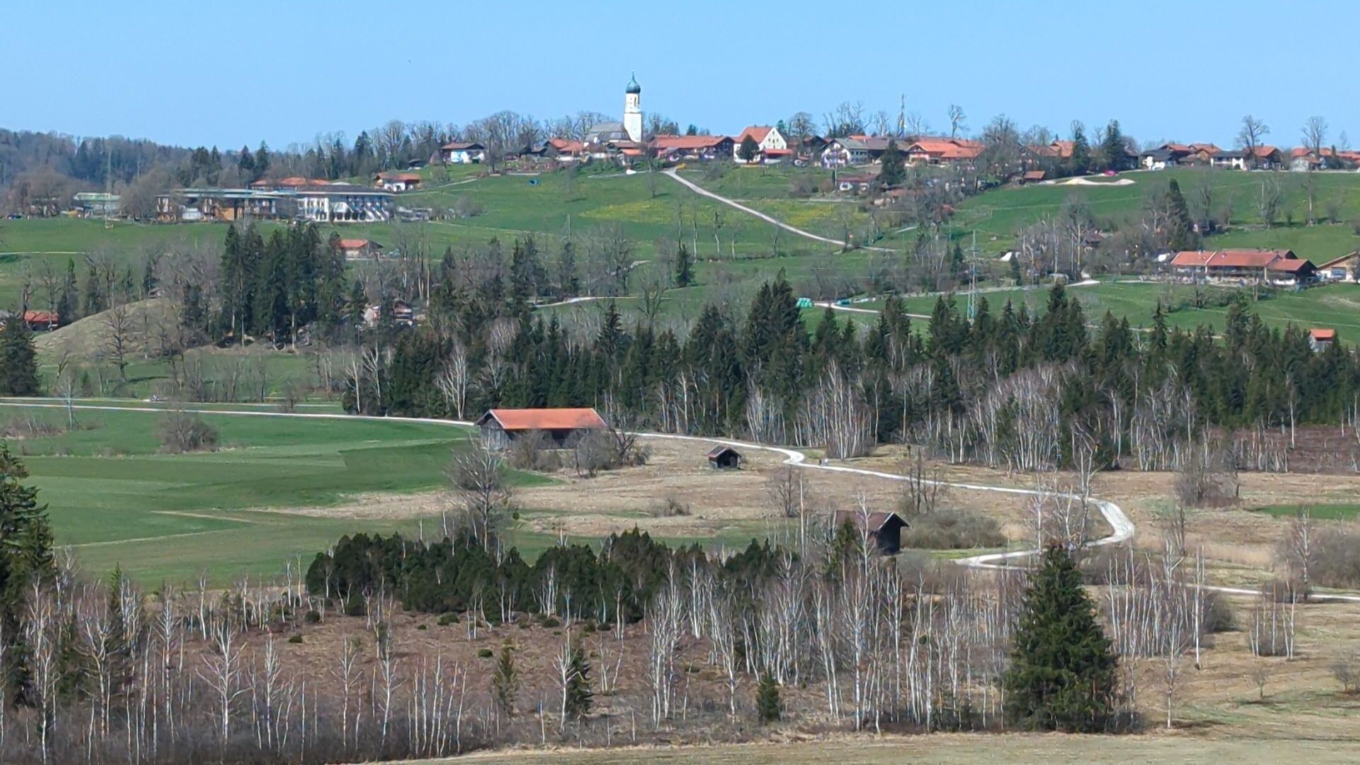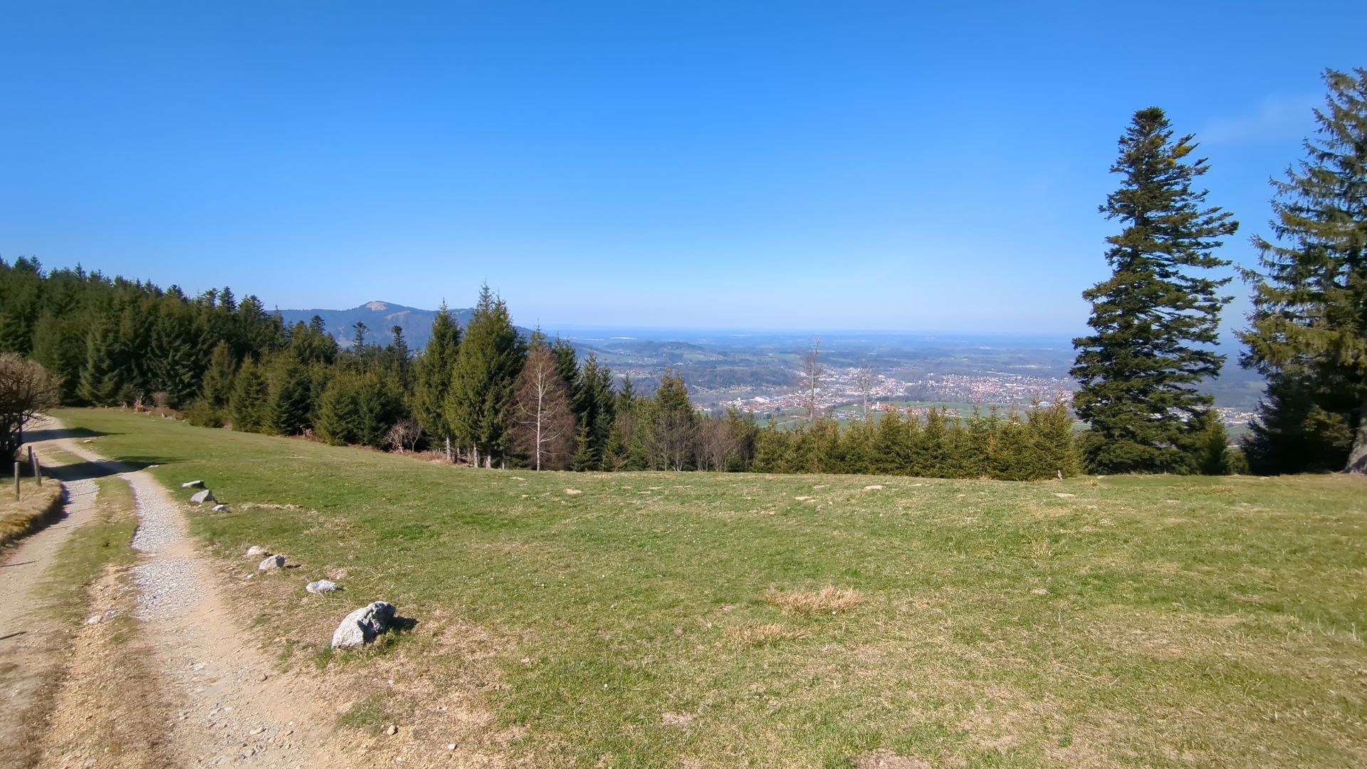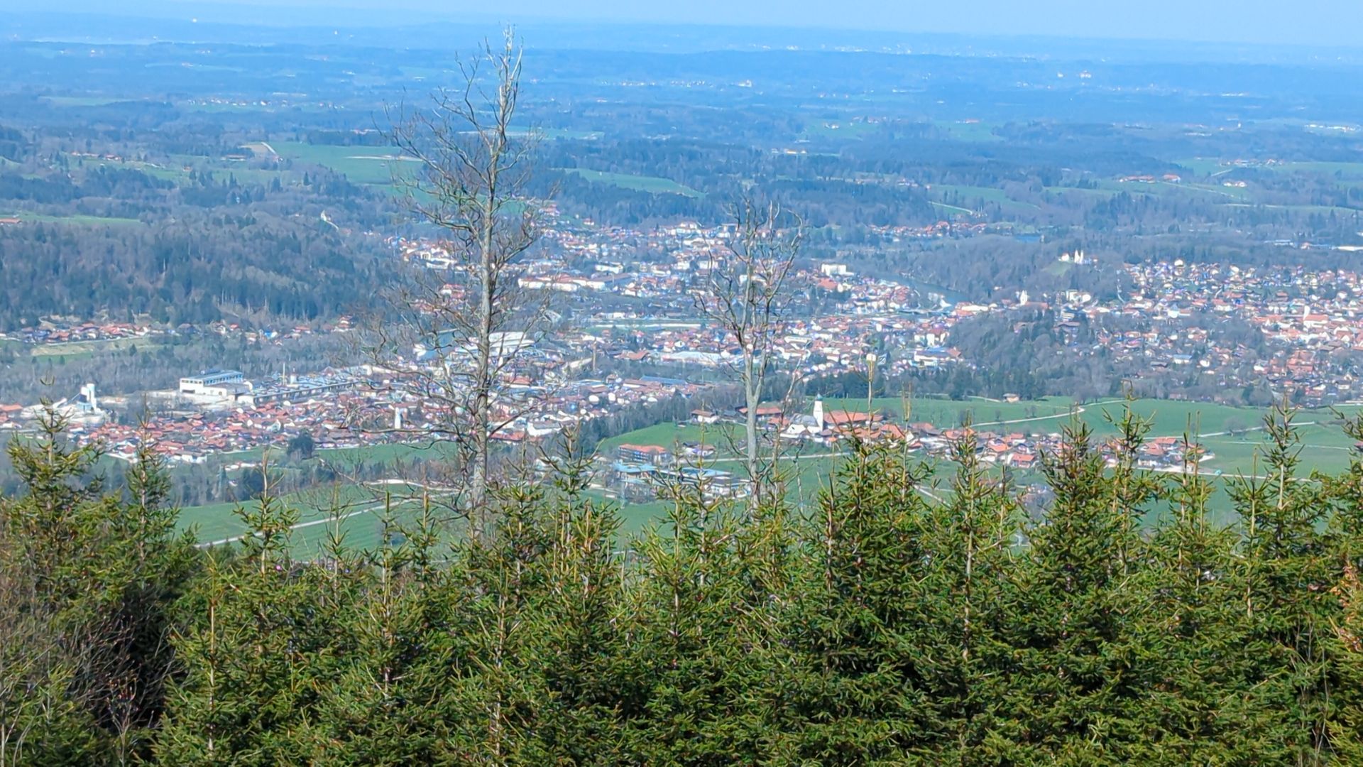 Aus Zeitgründen den schönen Aufstieg über das Almgelände rauf zum Rechelkopf ausgelassen (hier nur mehr ganz wenig Schnee auf der Nordseite). Weiter den Forstweg vielleicht 1km Richtung Greiling folgen. Dann über einen gut fahrbaren Trail rüber zur Schwaigeralm oberhalb Lehen. Hier angenehm warm und windstill und damit ideal für eine schone Pause mit Blick auf Bad Tölz. Weiter über den Forstweg runter zu den Filzen/Lehen.