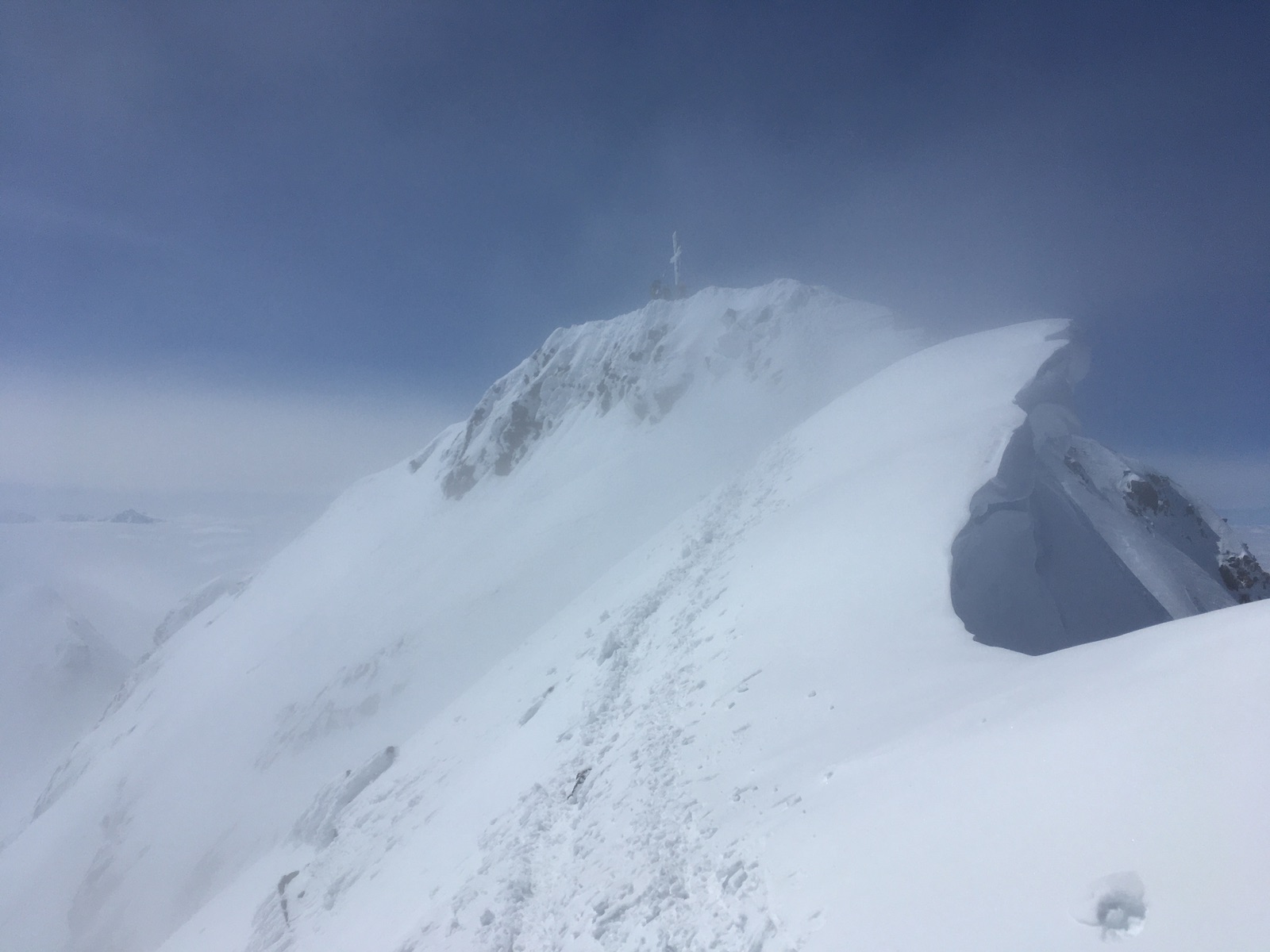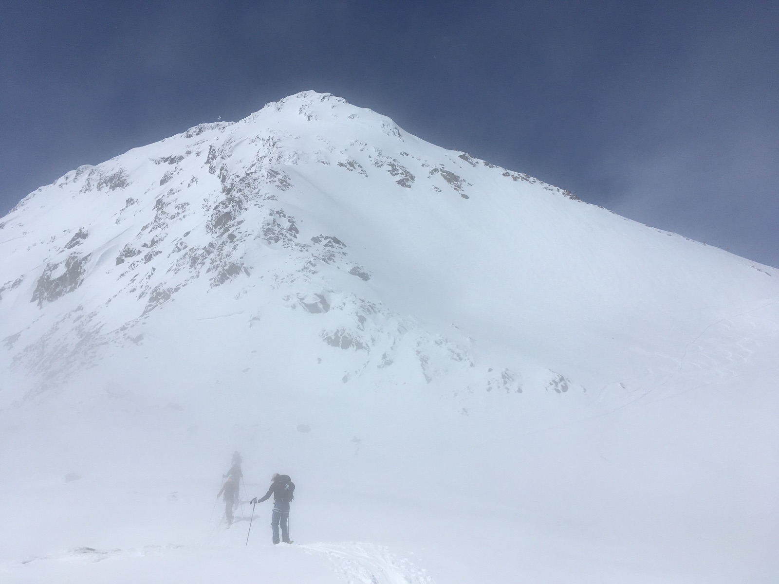 Leider drückte von Süden her schon am Vormittag die dortige Wolkenschicht (Hochnebel?) herüber, bei mir war am Ende nur noch der Gipfel frei. Auf der Nordtiroler Seite wurde das zu einem sehr dichten Nebel, der bei der Abfahrt über den Hochjochferner nur ein Herunterstochern orientiert an alten Spuren, Kompass, Höhenmesser und Karte möglich machte. Schade um die schönen Hänge. Ab ca. 2.700 m lichtete sich der Nebel, aber dann kommt nicht mehr viel Abfahrt bis zur Rofenache unter dem Hochjoch-Hospiz. Der restliche Weg über die Rofenschlucht und Rofen nach Vent ist bis auf wenige Schneefelder schneefrei, also heißt es doch 2 h die Skier tragen.
